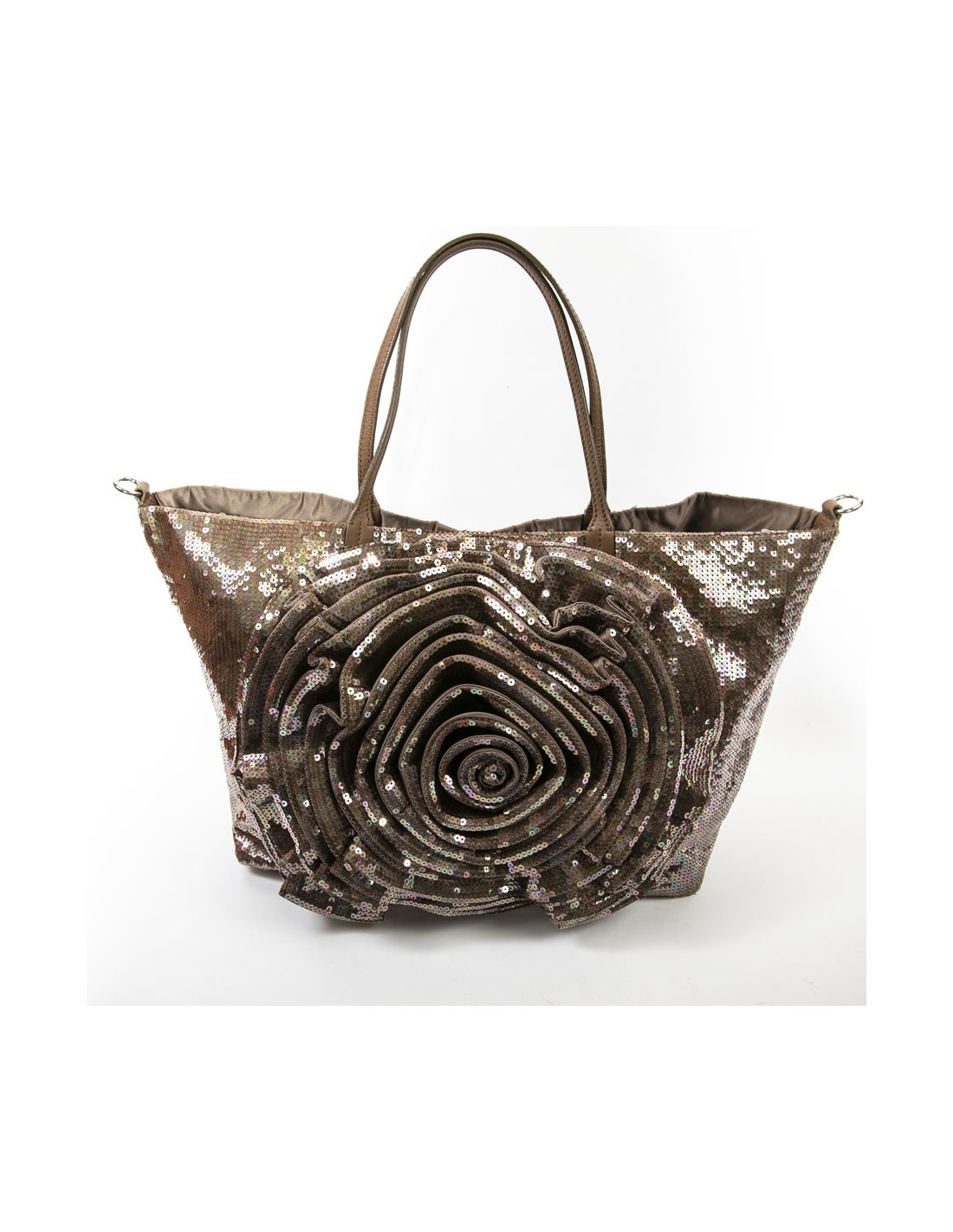 Sac VALENTINO en sequins marrons aux reflets roses, grande fleur en relief d'un côté, anses en cuir. Doublure intérieure en soie gris clair. Grande poche plate zippée à l'intérieur. Fermeture par bouton pression. Cinq picots en métal argenté sur le fond du sac. Signature Valentino Garavani sur plaque en métal doré.