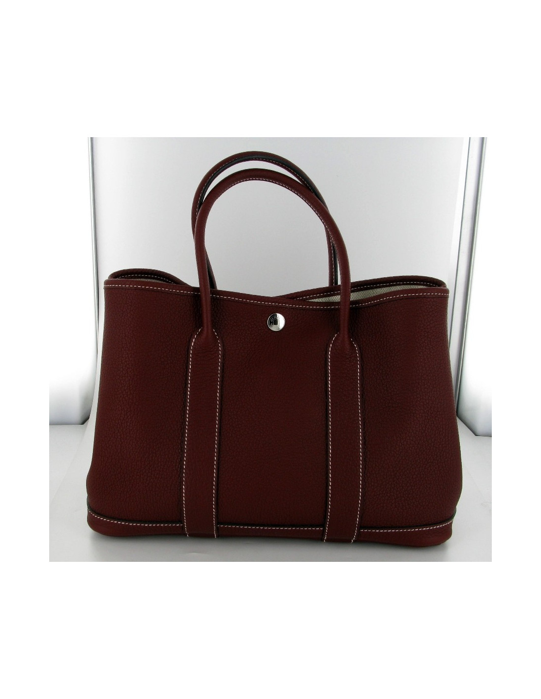 Incoutournable sac garden party en taurillon rouge h. Les surpiqures sont blanches. Anses : 34cm. Profondeur : 4cm intérieur en toile chevrons - le fond : cuir rouge h. Poche zippée intérieure. Trois pressions couleur palladium - dustbag