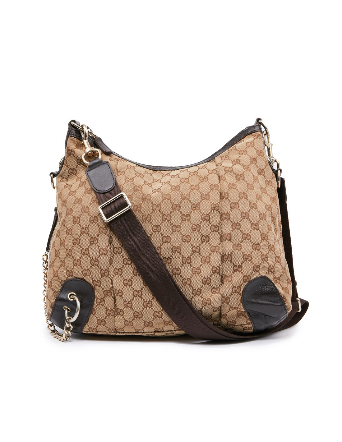 Ce sac d'occasion GUCCI est en toile monogramme beige et marron. Il a une fermeture éclair. La bijouterie est en métal doré or pâle. Il se porte avec une bandoulière à l'épaule ou croisé. L'intérieur est en tissu marron avec une poche zippée et deux poches plaquées. Sur le côté extérieur, il a une poche secrète fermée par un zip, sa tirette est accrochée à une chaine. Les coins inférieurs sont renforcés avec des pièces en cuir marron. Ce sac est en très bon état, légère usure d'usage visible sur le sac.