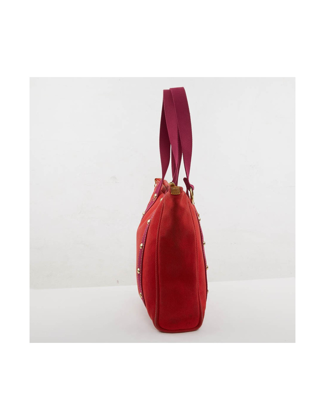 Ce joli cabas Antigua de la Maison Louis Vuitton est en toile de coton rouge. Il se porte à l'épaule. Les deux bandes qui servent de poignées sont fuchsia. Il a un une fermeture zippée. La métallerie est dorée. La doublure est en toile rayée fuchsia et beige avec une poche fente. Les petites finitions sont en cuir de vache naturelle. Il est noirci par le temps à certains endroits, usure d'usage. Il est en état correct (mérite un nettoyage).