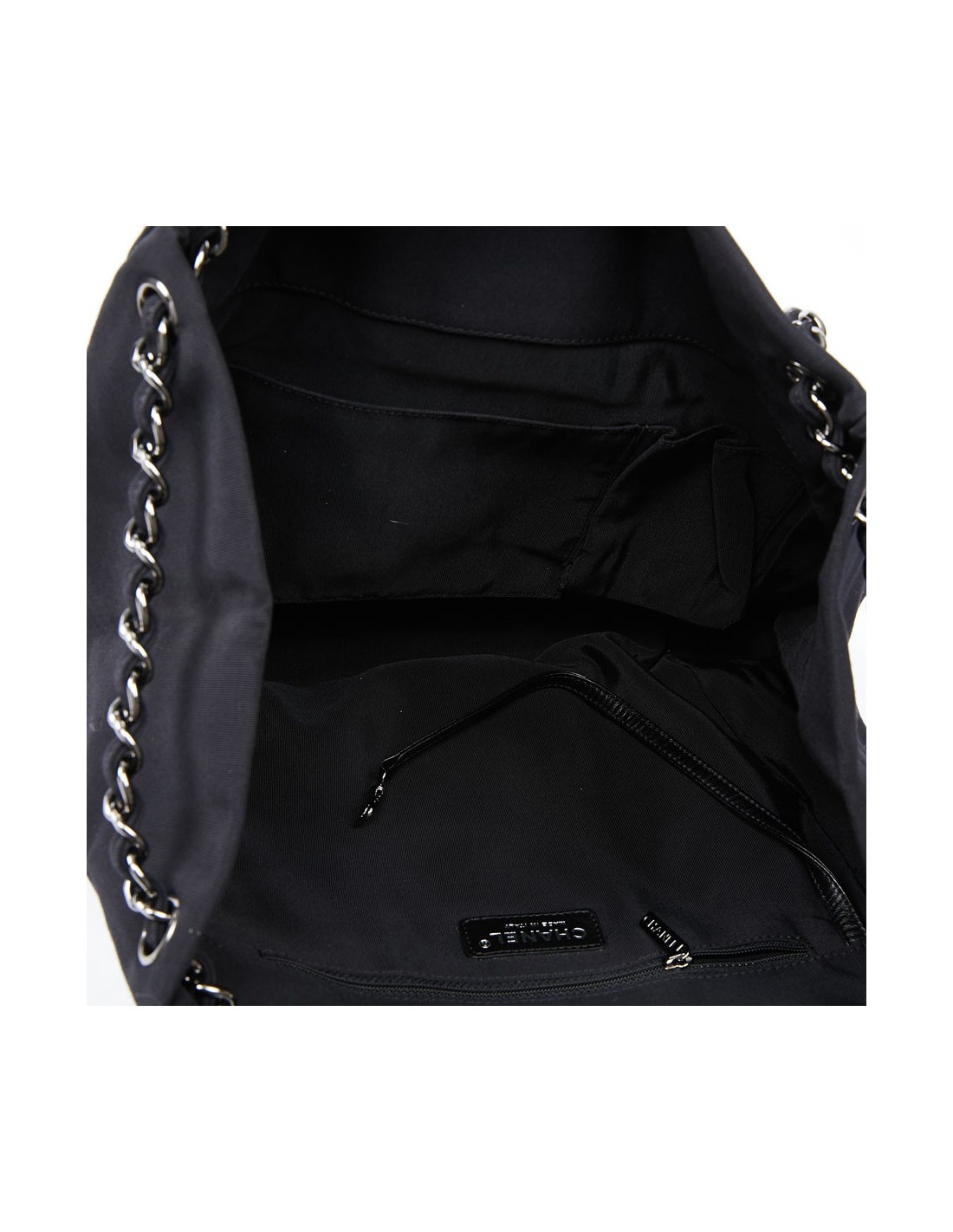 Charmant sac de jour en toile de coton bicolore de la Maison CHANEL. L'intérieur est en toile noire avec une grande poche zippée, 1 pour un smartphone et 1 poche plate. Bijouterie argentée. Porté épaule.