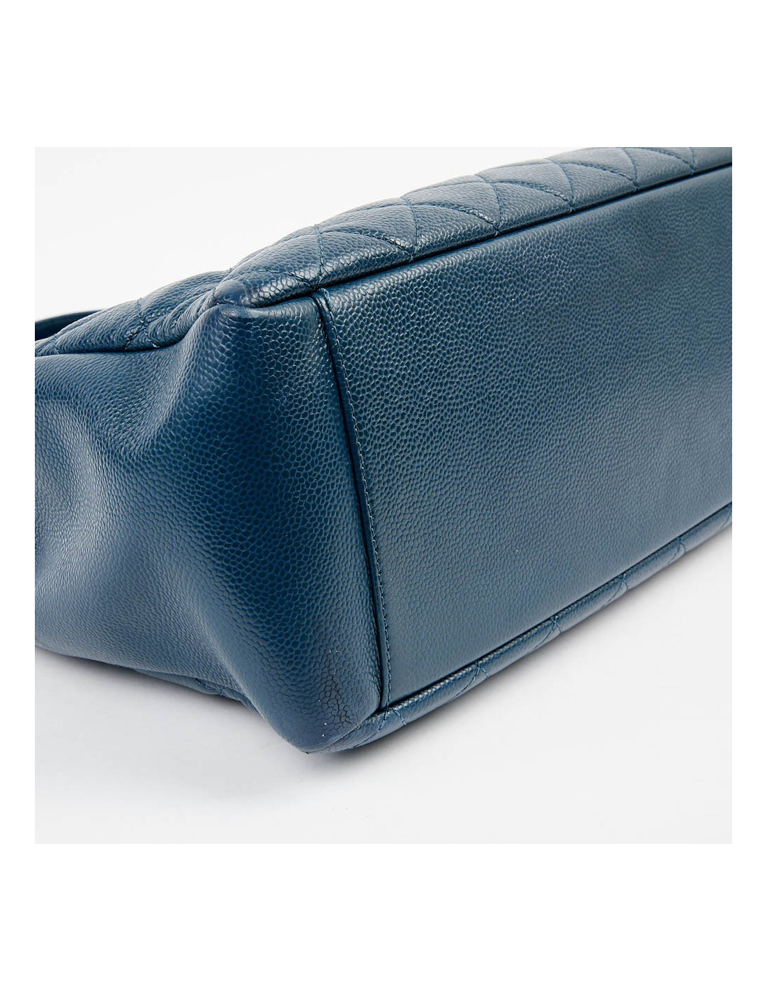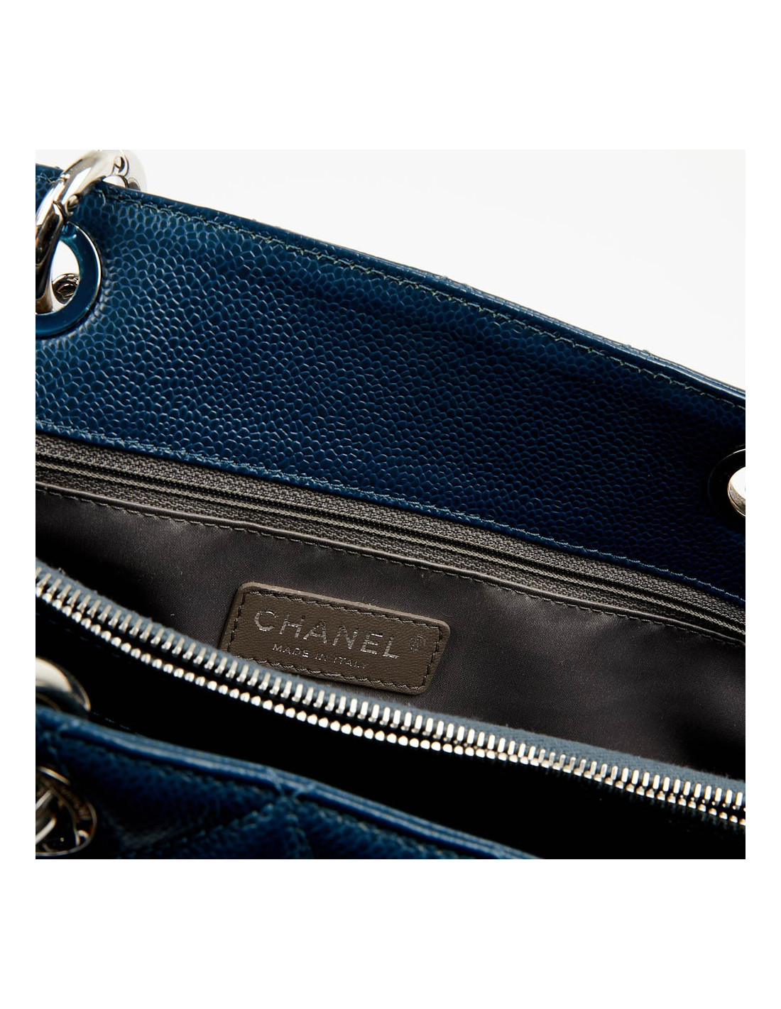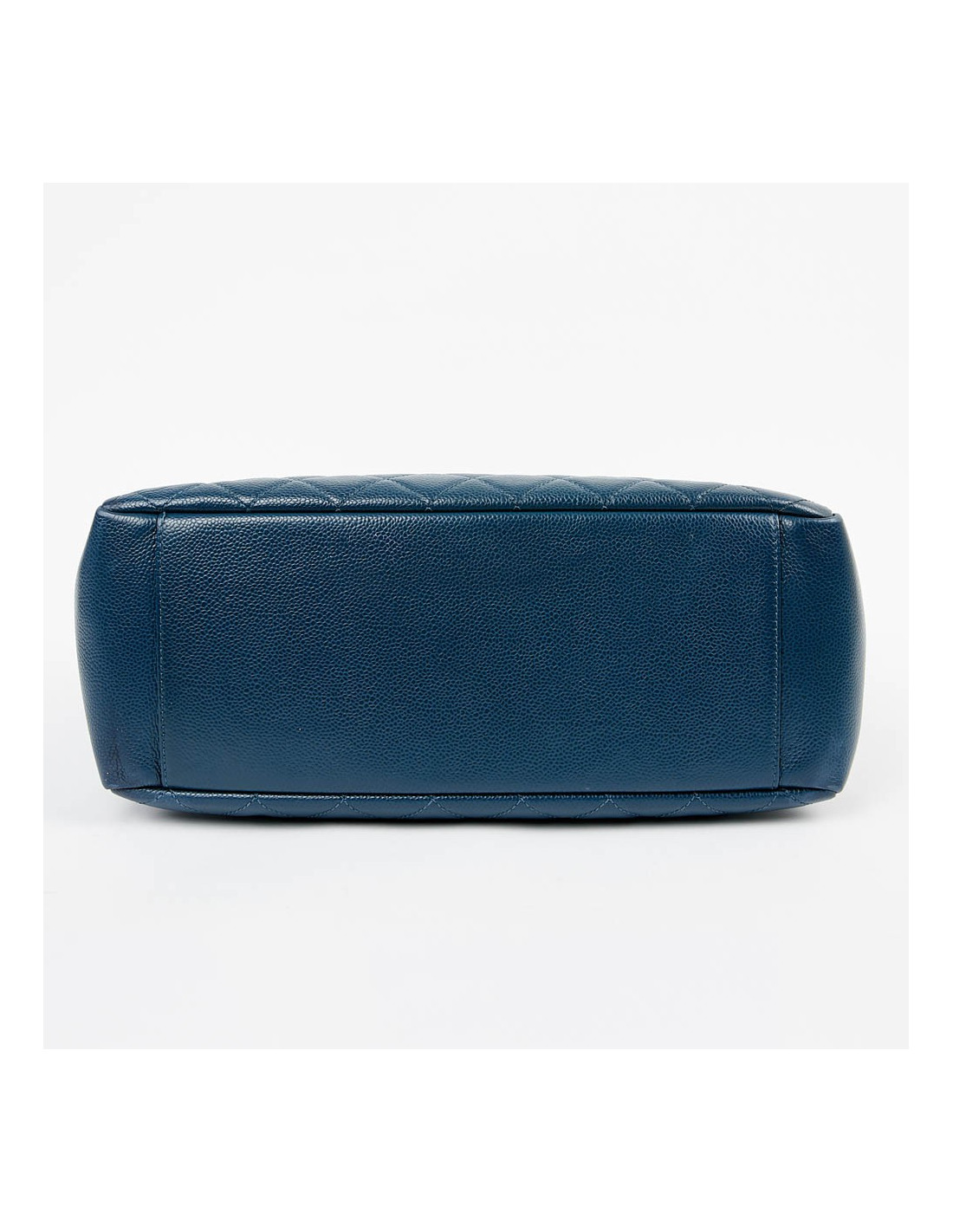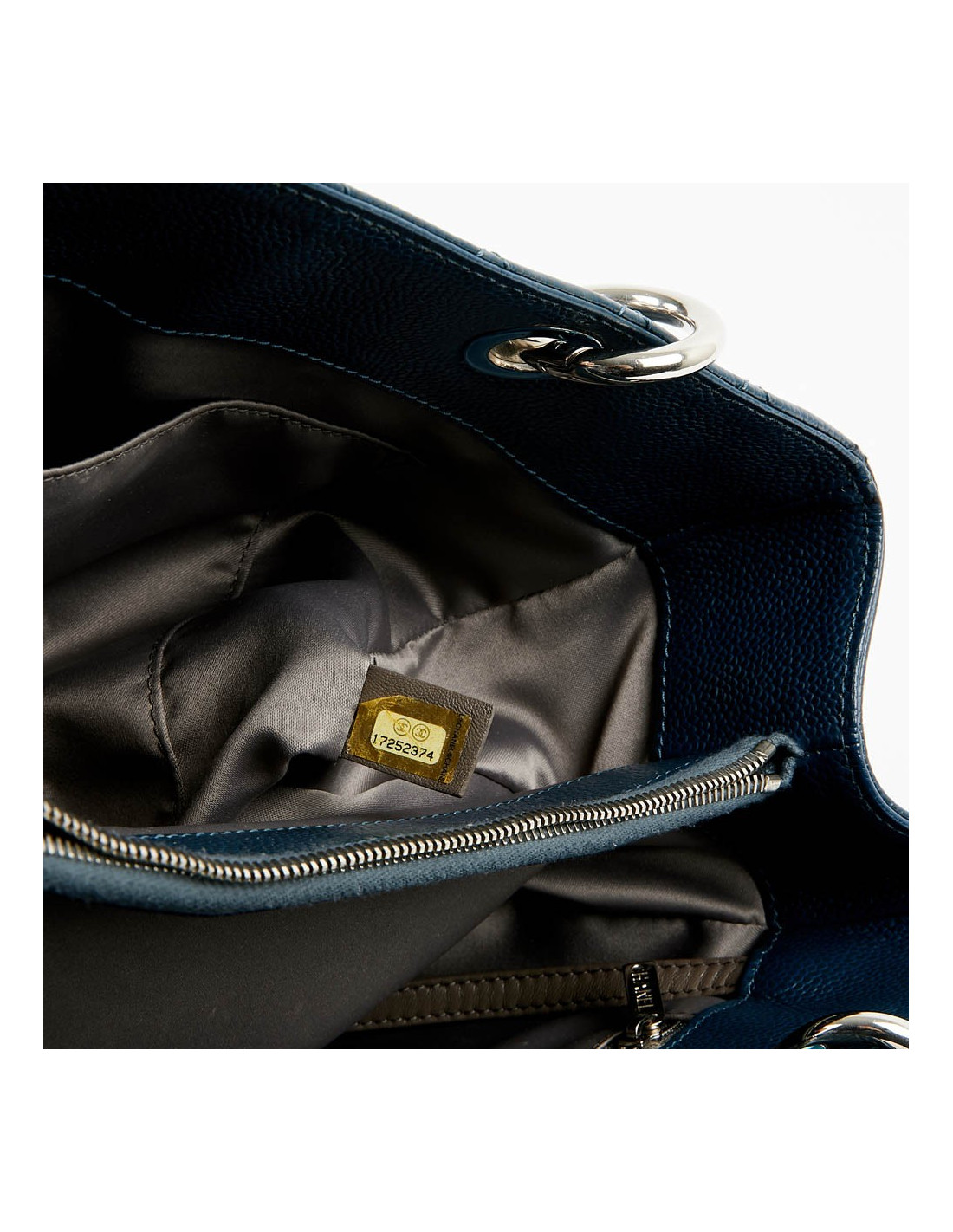 Ce grand cabas de la Maison CHANEL est en cuir caviar bleu. La bijouterie est en métal argent palladié. Les surpiqûres bleues apportent un effet matelassé. A l'avant du sac un grand CC est dessiné en relief et à l'arrière une grande poche plaquée. Ce sac est doublé en satin gris. Il est composé de deux soufflets de rangements distincts séparés par une grande poche zippée. Chaque oeillet du sac porte l'inscription "CHANEL 31 rue Cambon Paris". Il se porte à l'épaule et les anses en chaine métal entrelacée de cuir. Les quatre coins ont une légère usure et sur la doublure on distingue quelques taches. Possibilité d'y glisser un ordinateur.