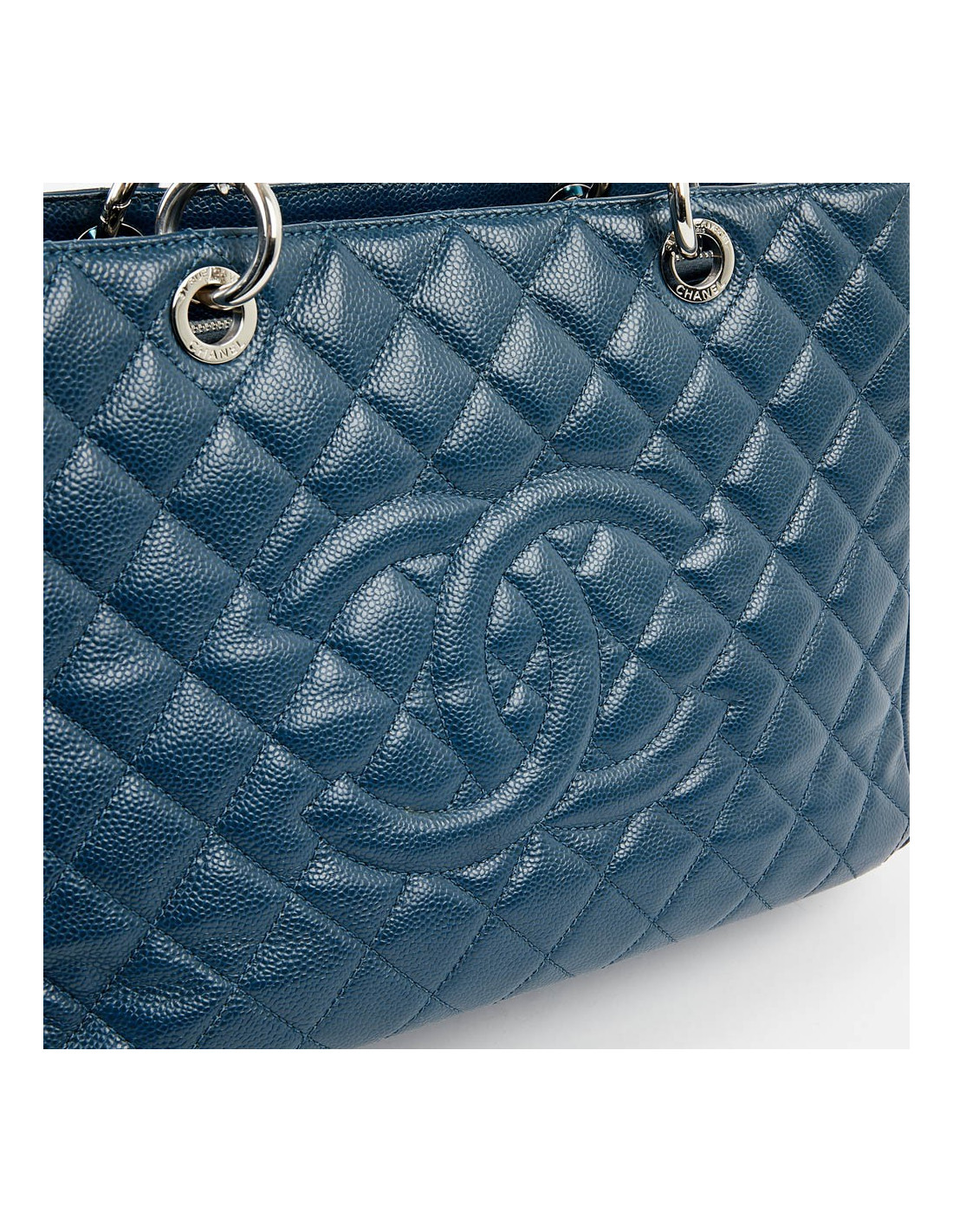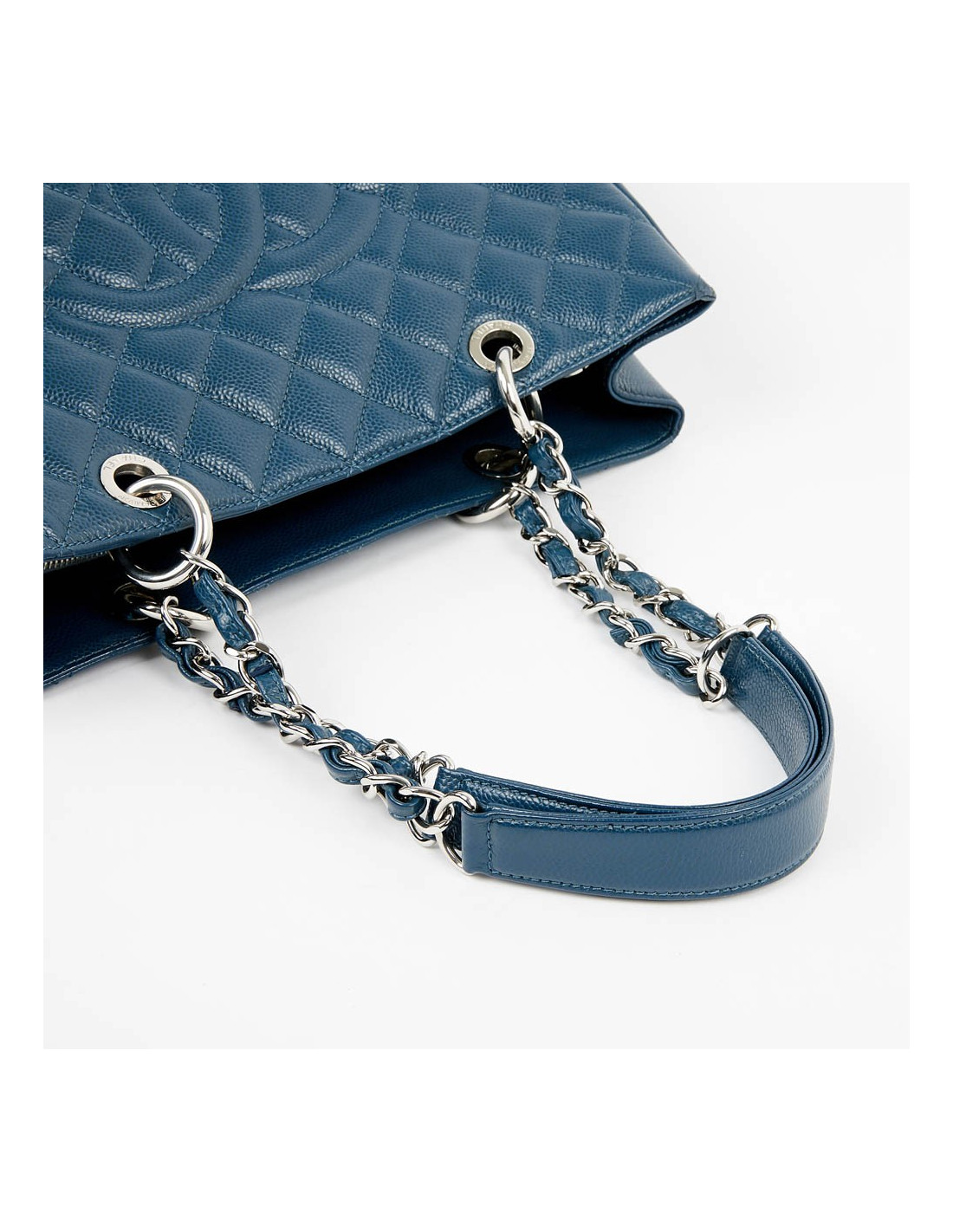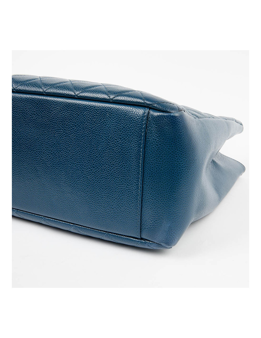 Ce grand cabas de la Maison CHANEL est en cuir caviar bleu. La bijouterie est en métal argent palladié. Les surpiqûres bleues apportent un effet matelassé. A l'avant du sac un grand CC est dessiné en relief et à l'arrière une grande poche plaquée. Ce sac est doublé en satin gris. Il est composé de deux soufflets de rangements distincts séparés par une grande poche zippée. Chaque oeillet du sac porte l'inscription "CHANEL 31 rue Cambon Paris". Il se porte à l'épaule et les anses en chaine métal entrelacée de cuir. Les quatre coins ont une légère usure et sur la doublure on distingue quelques taches. Possibilité d'y glisser un ordinateur.