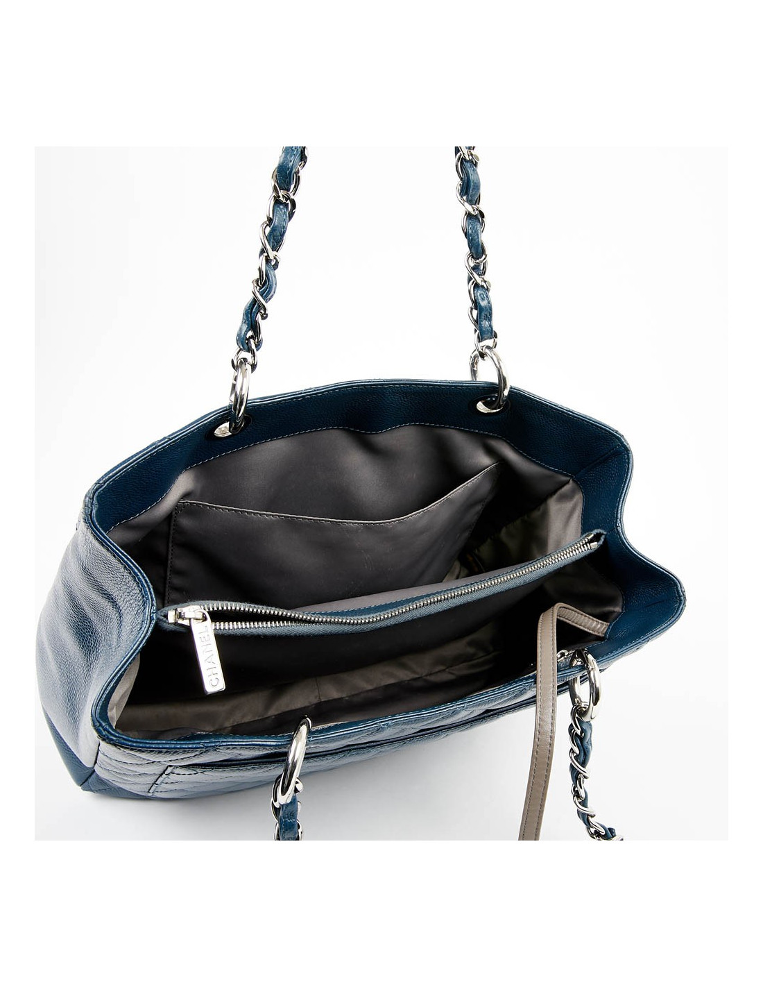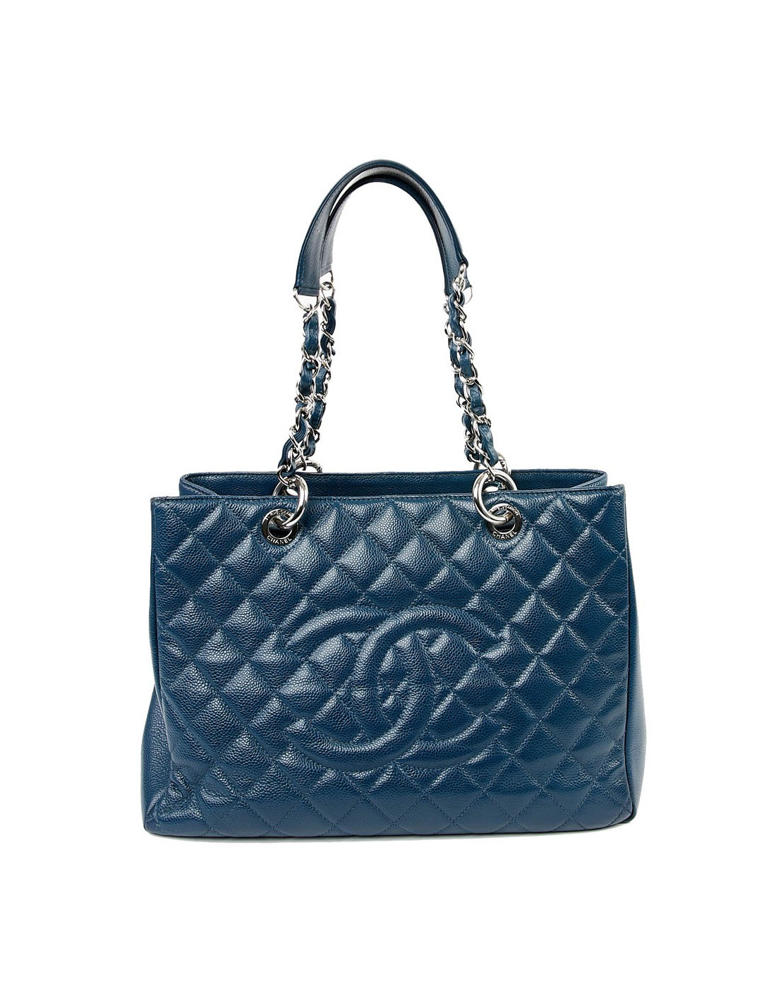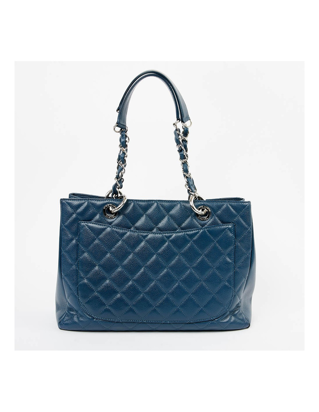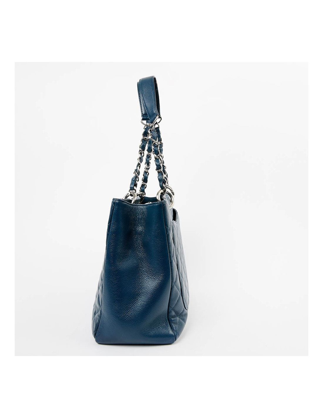 Ce grand cabas de la Maison CHANEL est en cuir caviar bleu. La bijouterie est en métal argent palladié. Les surpiqûres bleues apportent un effet matelassé. A l'avant du sac un grand CC est dessiné en relief et à l'arrière une grande poche plaquée. Ce sac est doublé en satin gris. Il est composé de deux soufflets de rangements distincts séparés par une grande poche zippée. Chaque oeillet du sac porte l'inscription "CHANEL 31 rue Cambon Paris". Il se porte à l'épaule et les anses en chaine métal entrelacée de cuir. Les quatre coins ont une légère usure et sur la doublure on distingue quelques taches. Possibilité d'y glisser un ordinateur.