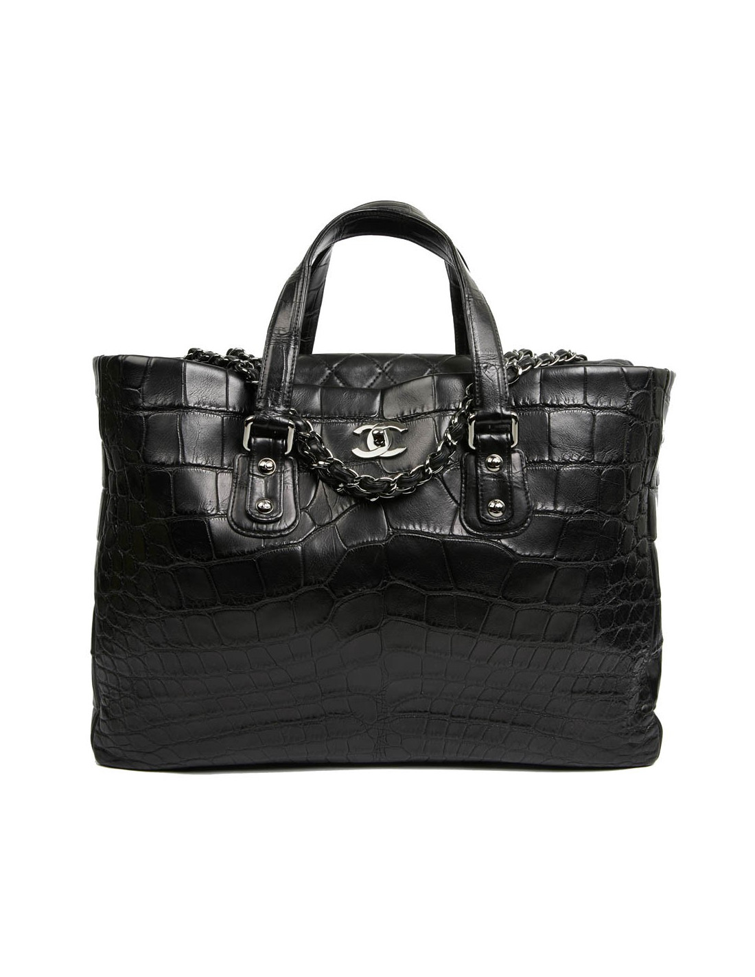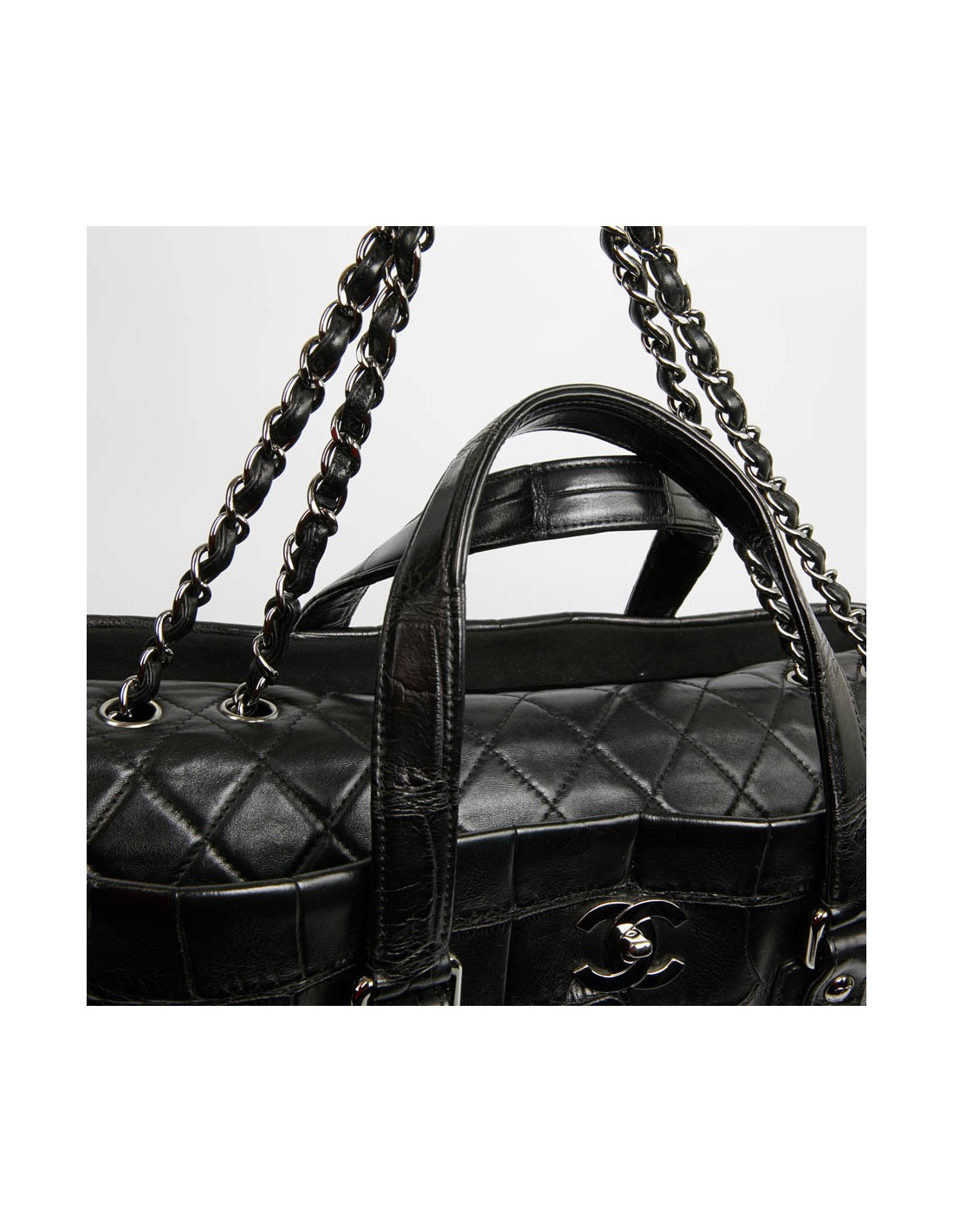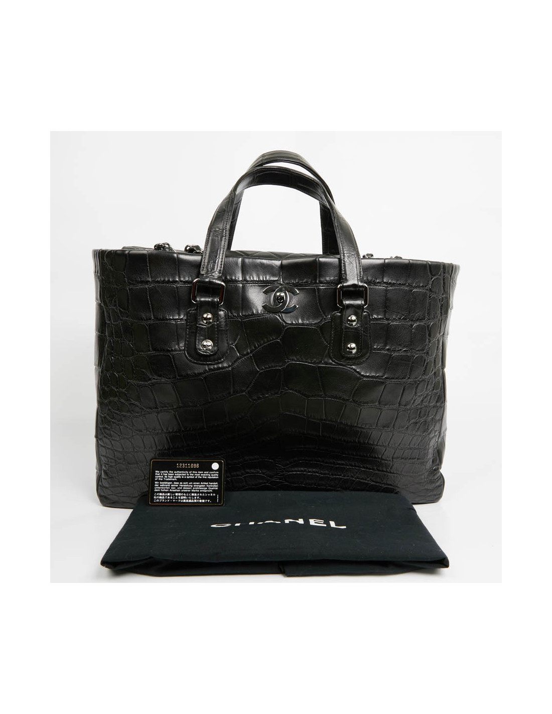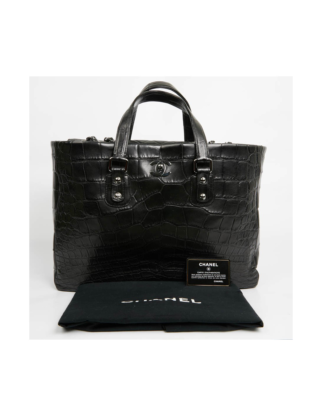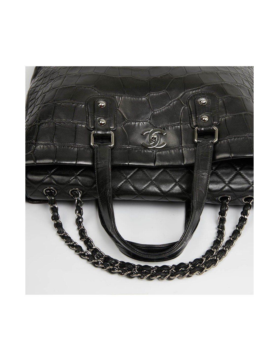 Grand cabas CHANEL en crocodile noir. La bijouterie est en argent palladié. Il est doublé en cuir lisse noir. Un grand espace de rangement, une poche fermée par un zip ainsi que deux poches plates (dont une pour smartphone). Possibilité de le porter de deux manières, à la main avec sa double poignée en crocodile ou à l'épaule avec sa chaine en argent entrelacée de cuir noir (signature de la Maison CHANEL). Il est en parfait état d'usage (micro usure du coin gauche, voir photo).