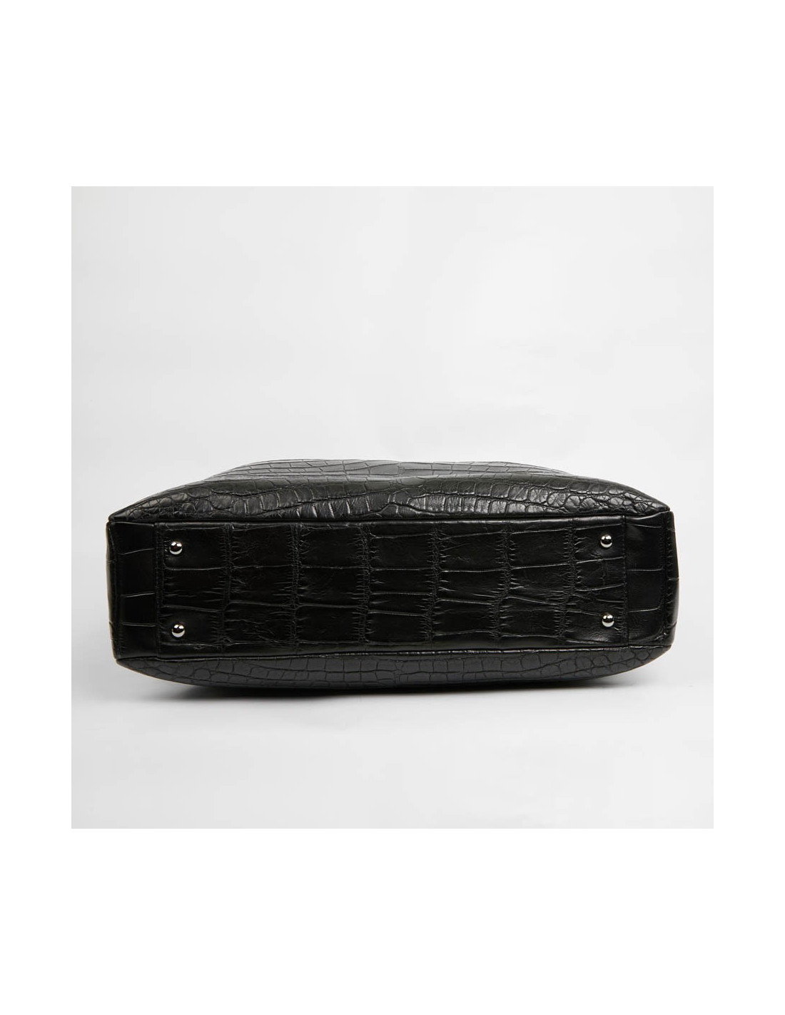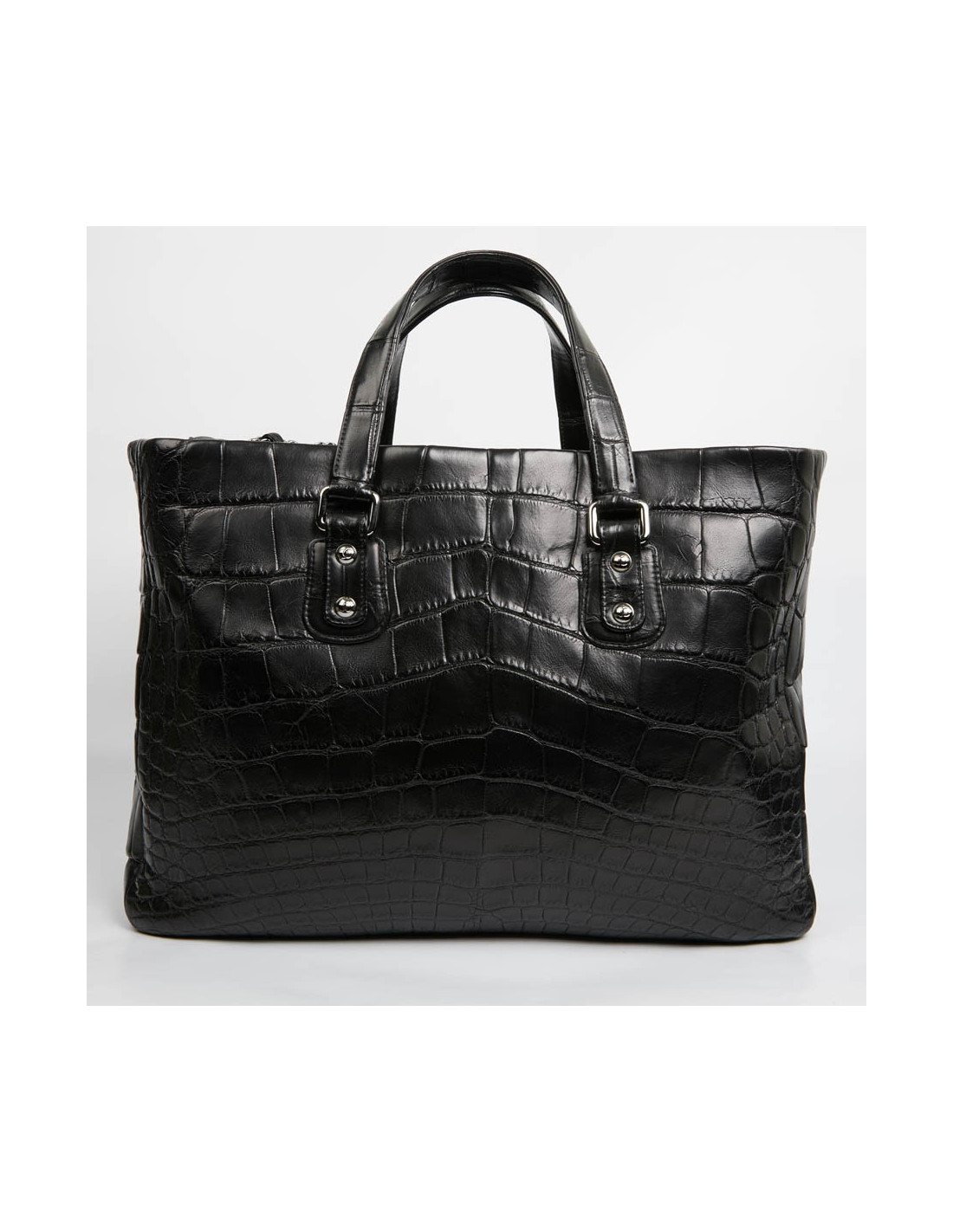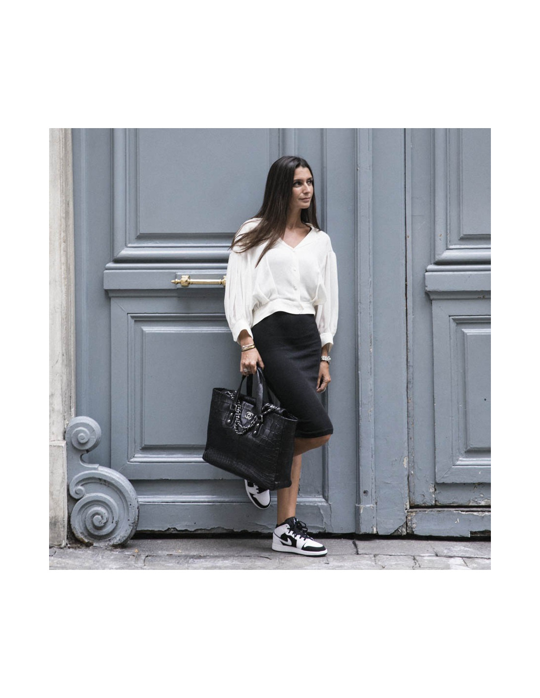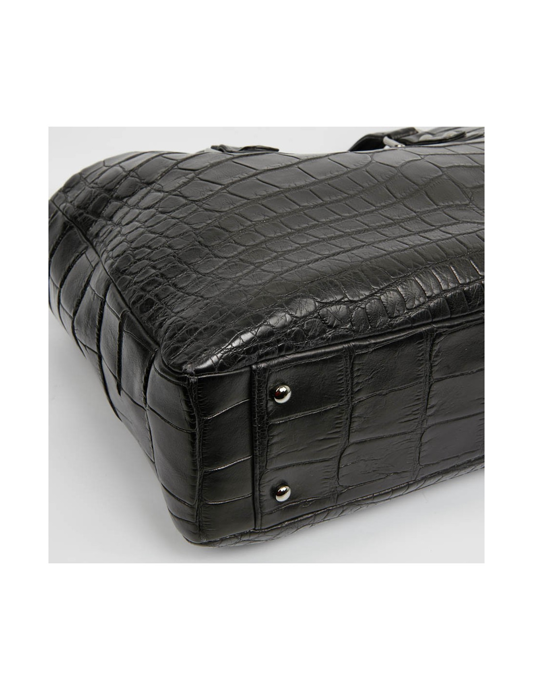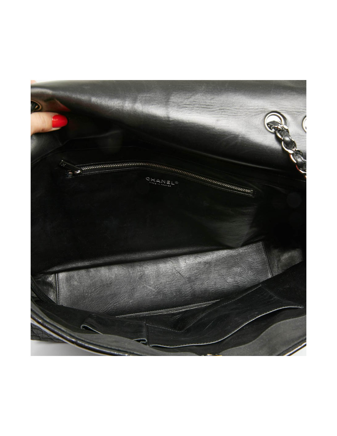 Grand cabas CHANEL en crocodile noir. La bijouterie est en argent palladié. Il est doublé en cuir lisse noir. Un grand espace de rangement, une poche fermée par un zip ainsi que deux poches plates (dont une pour smartphone). Possibilité de le porter de deux manières, à la main avec sa double poignée en crocodile ou à l'épaule avec sa chaine en argent entrelacée de cuir noir (signature de la Maison CHANEL). Il est en parfait état d'usage (micro usure du coin gauche, voir photo).