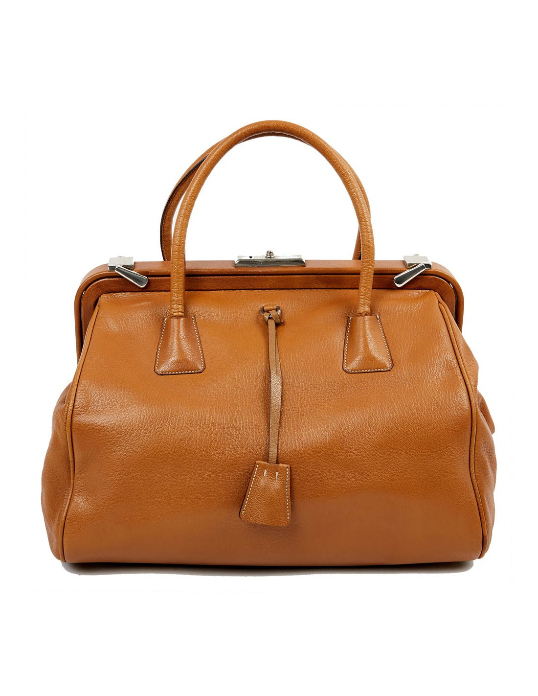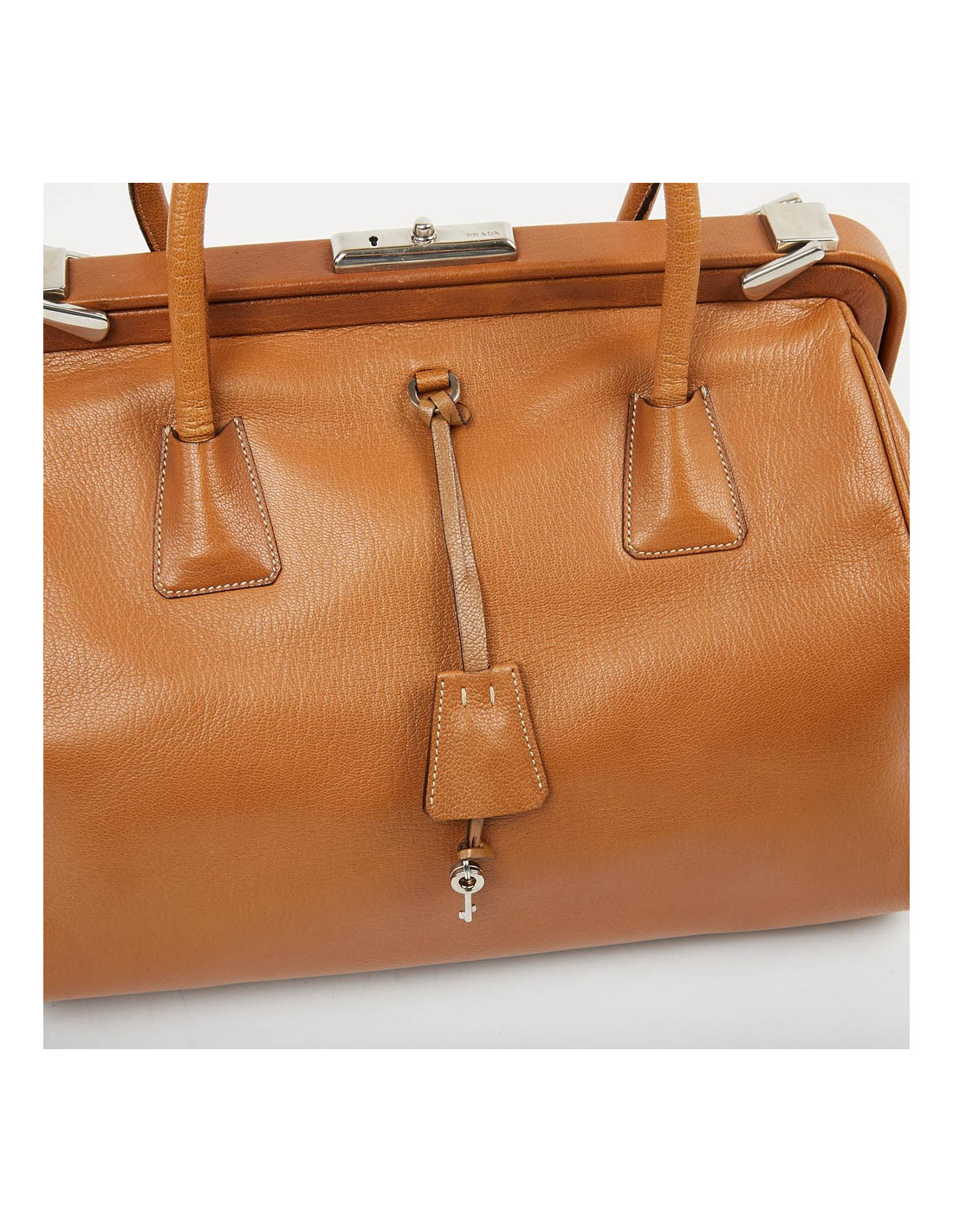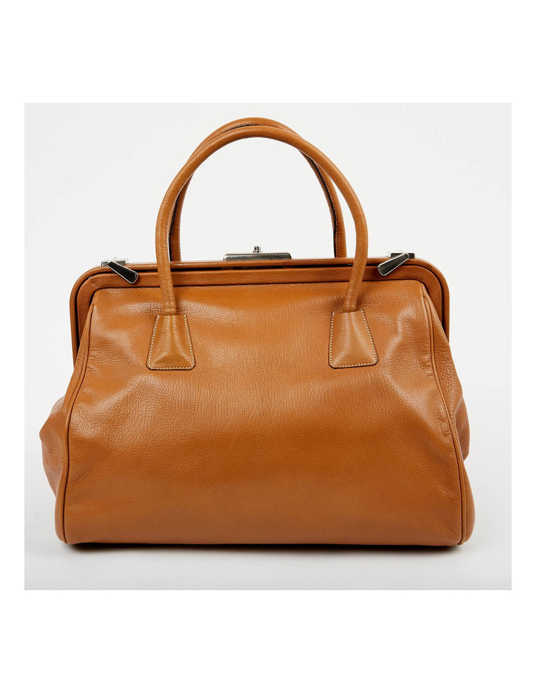 Sac à main style de la Maison Prada qui nous rappelle la mallette des médecins. Il est en cuir marron clair avec une bijouterie en argent palladié. Ouverture par bouton pression. L'intérieur est en toile monogram Prada. Il se porte à la main. Possibilité de fermer la serrure car il possède ses deux clés. Sous le sacs, les 4 petites pièces de métal protègent les coins de l'usure et pour une protection maximale, il y a deux petits loquets pivotant pour maximiser la fermeture du sac. Il est en très bon état.