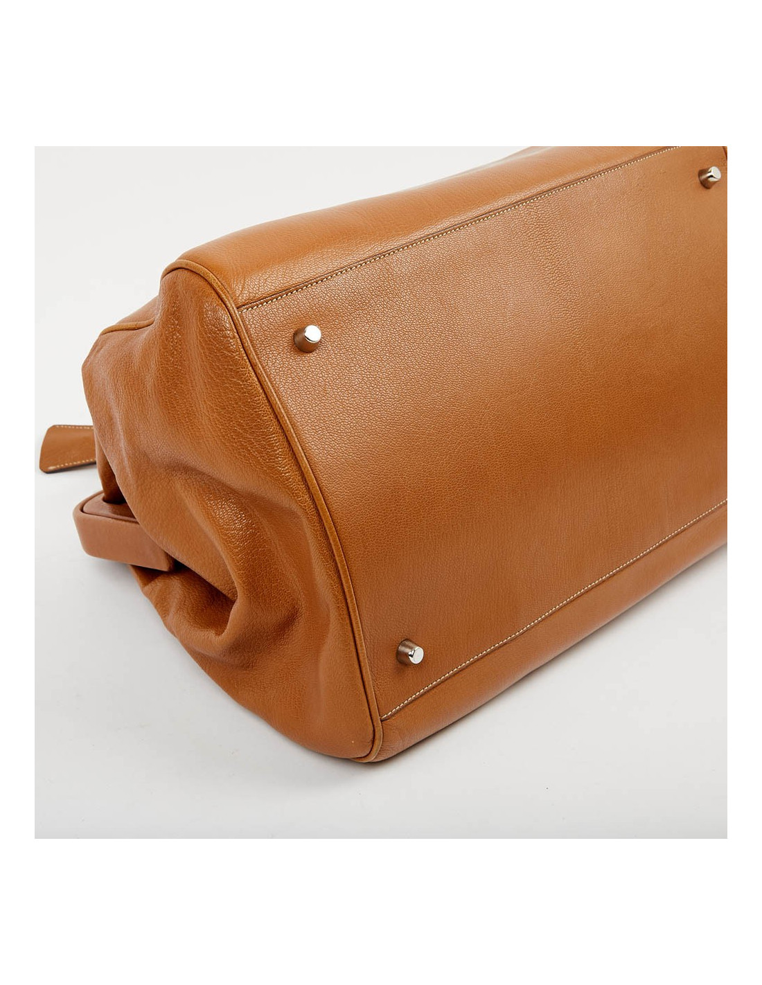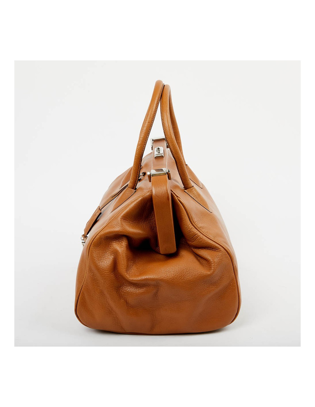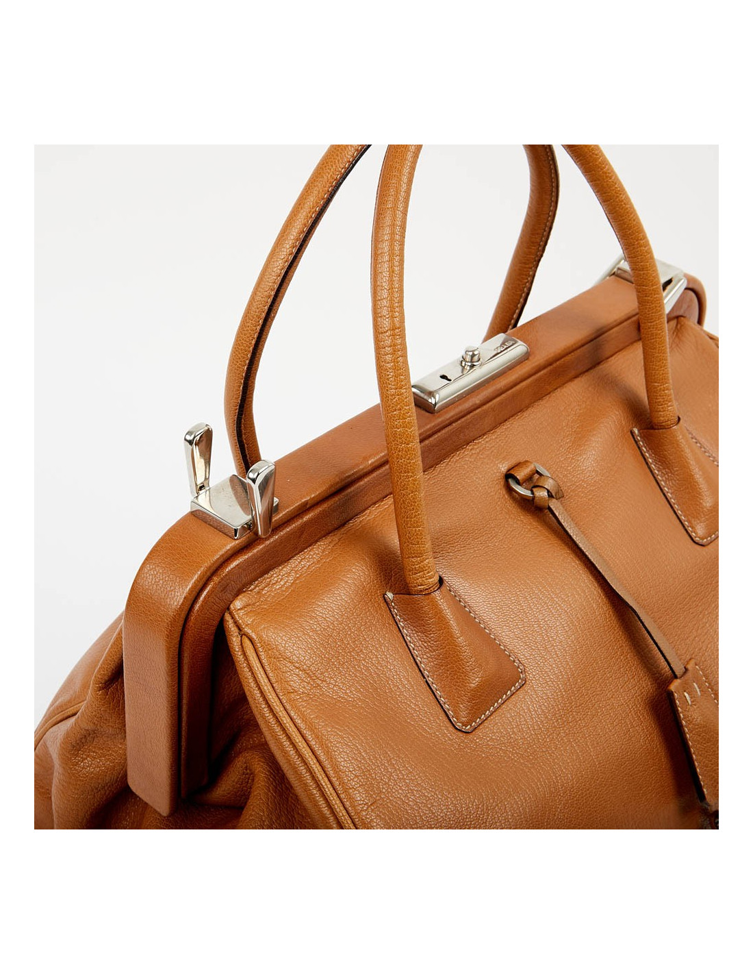 Sac à main style de la Maison Prada qui nous rappelle la mallette des médecins. Il est en cuir marron clair avec une bijouterie en argent palladié. Ouverture par bouton pression. L'intérieur est en toile monogram Prada. Il se porte à la main. Possibilité de fermer la serrure car il possède ses deux clés. Sous le sacs, les 4 petites pièces de métal protègent les coins de l'usure et pour une protection maximale, il y a deux petits loquets pivotant pour maximiser la fermeture du sac. Il est en très bon état.