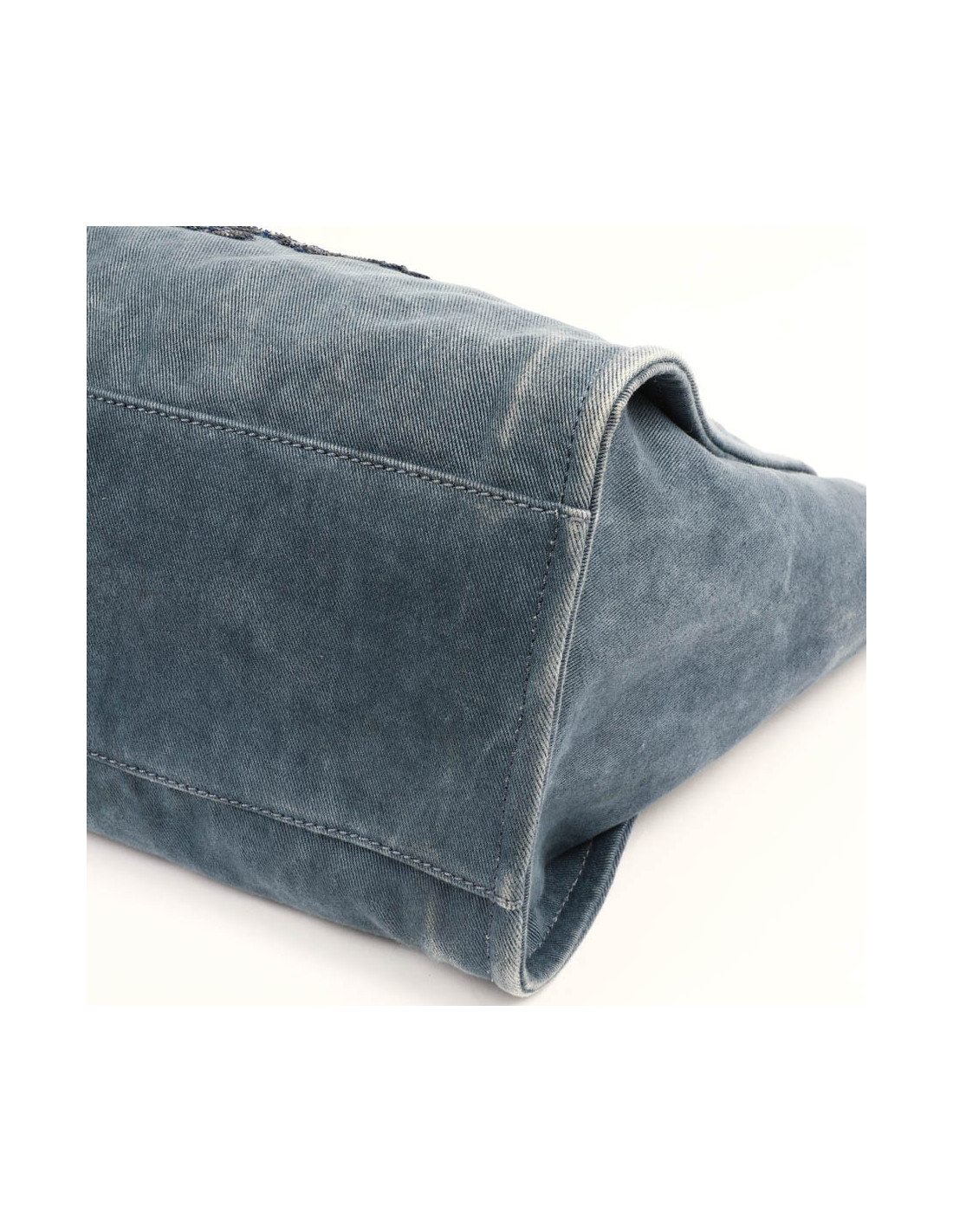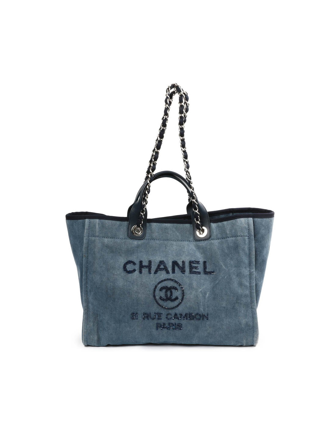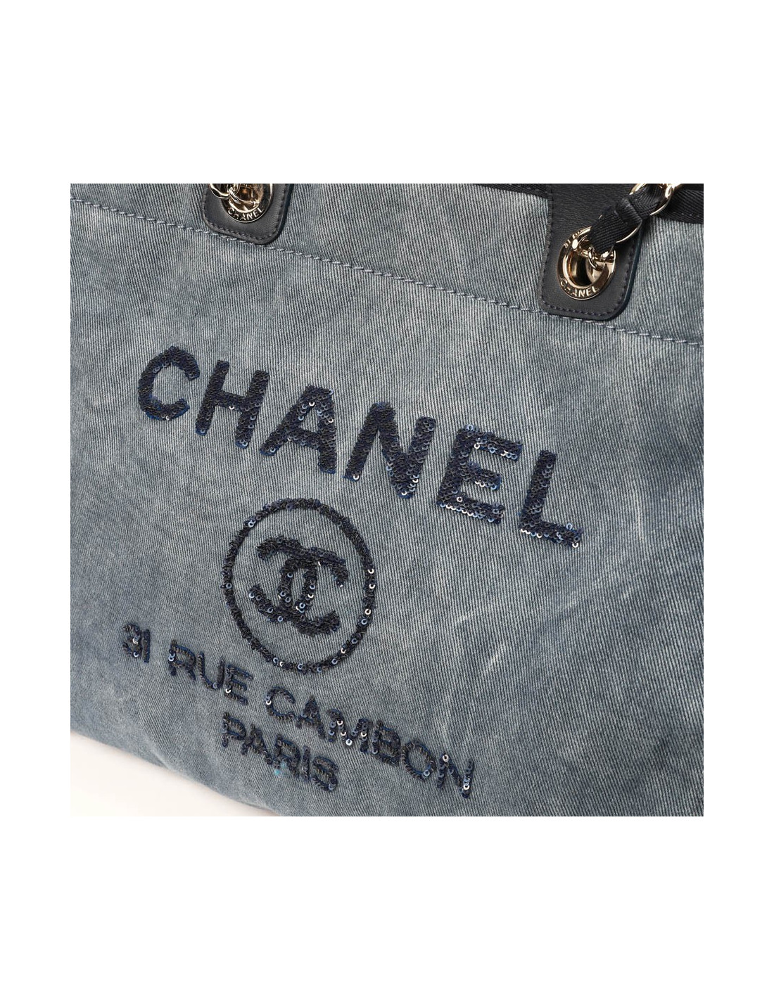Il est en toile denim bleu légèrement délavé avec les inscriptions "CHANEL, 21 RUE CAMBON PARIS" brodées en sequins bleu marine brillant.