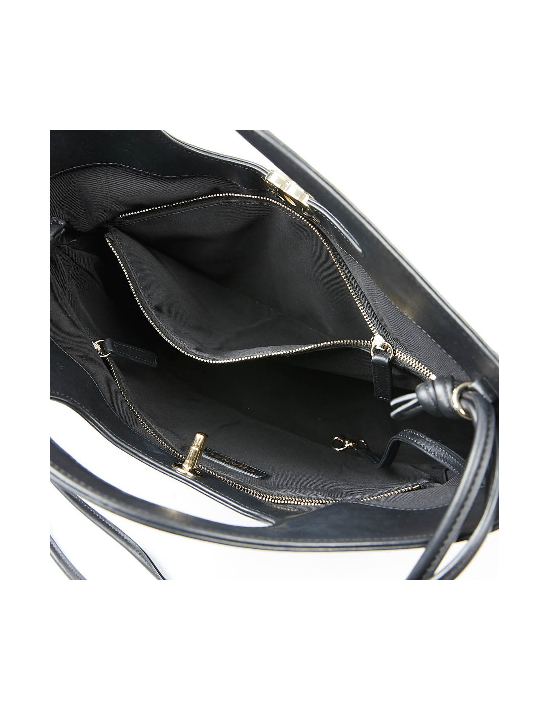L'intérieur est en tissu noir avec deux grandes poches zippées. L'accastillage est doré.