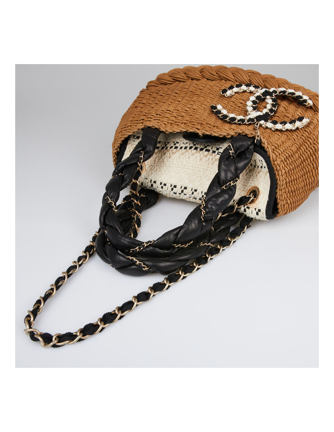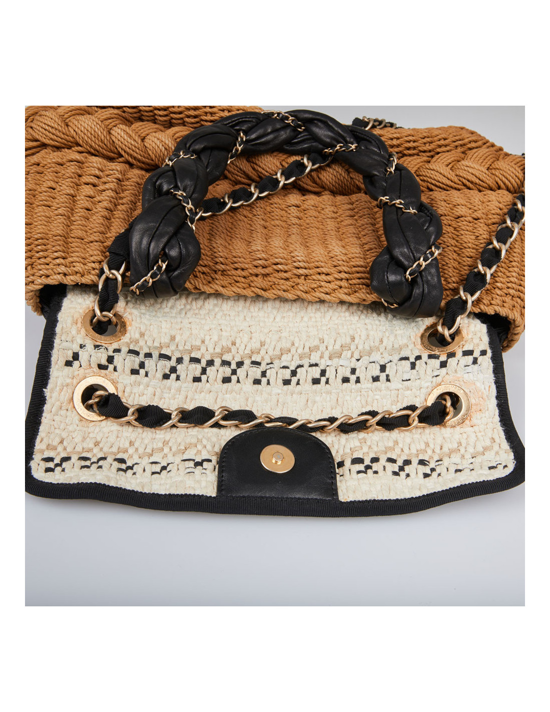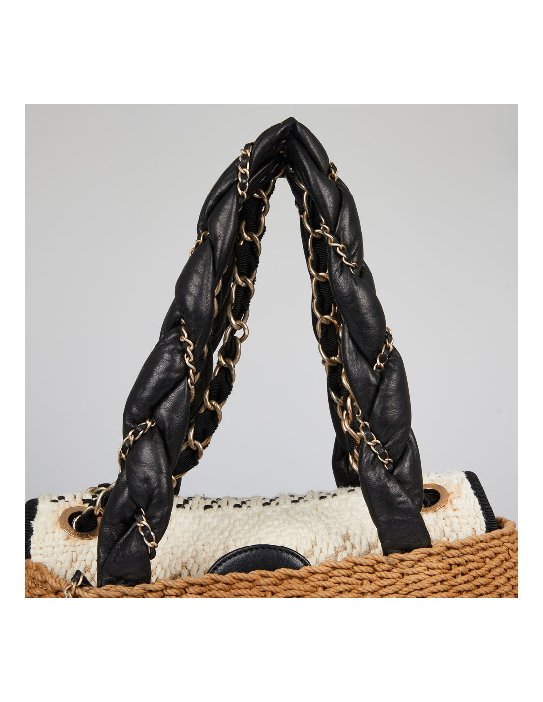 Détails : Sac panier en corde nattée et tressée, rabat en coton effet tweed, anses en cuir et gros bijou CC pendant. Le tweed présente une petite auréole jaune autour des 2 œillets du rabat mais le sac est en très bon état général.