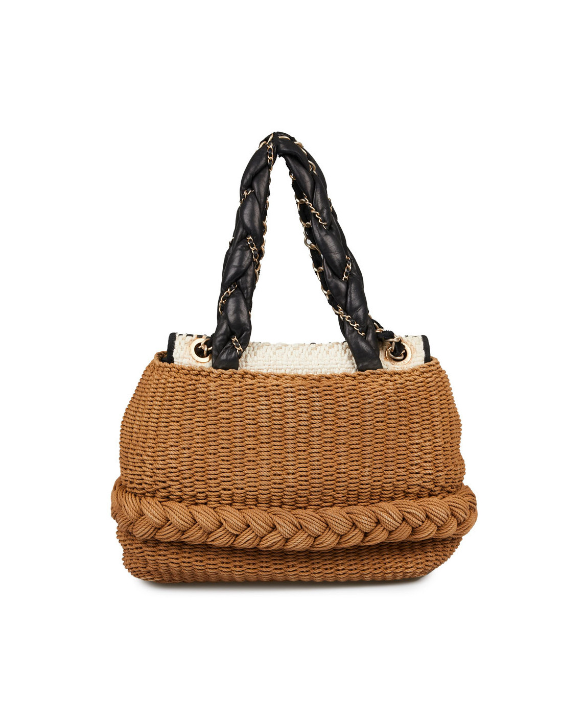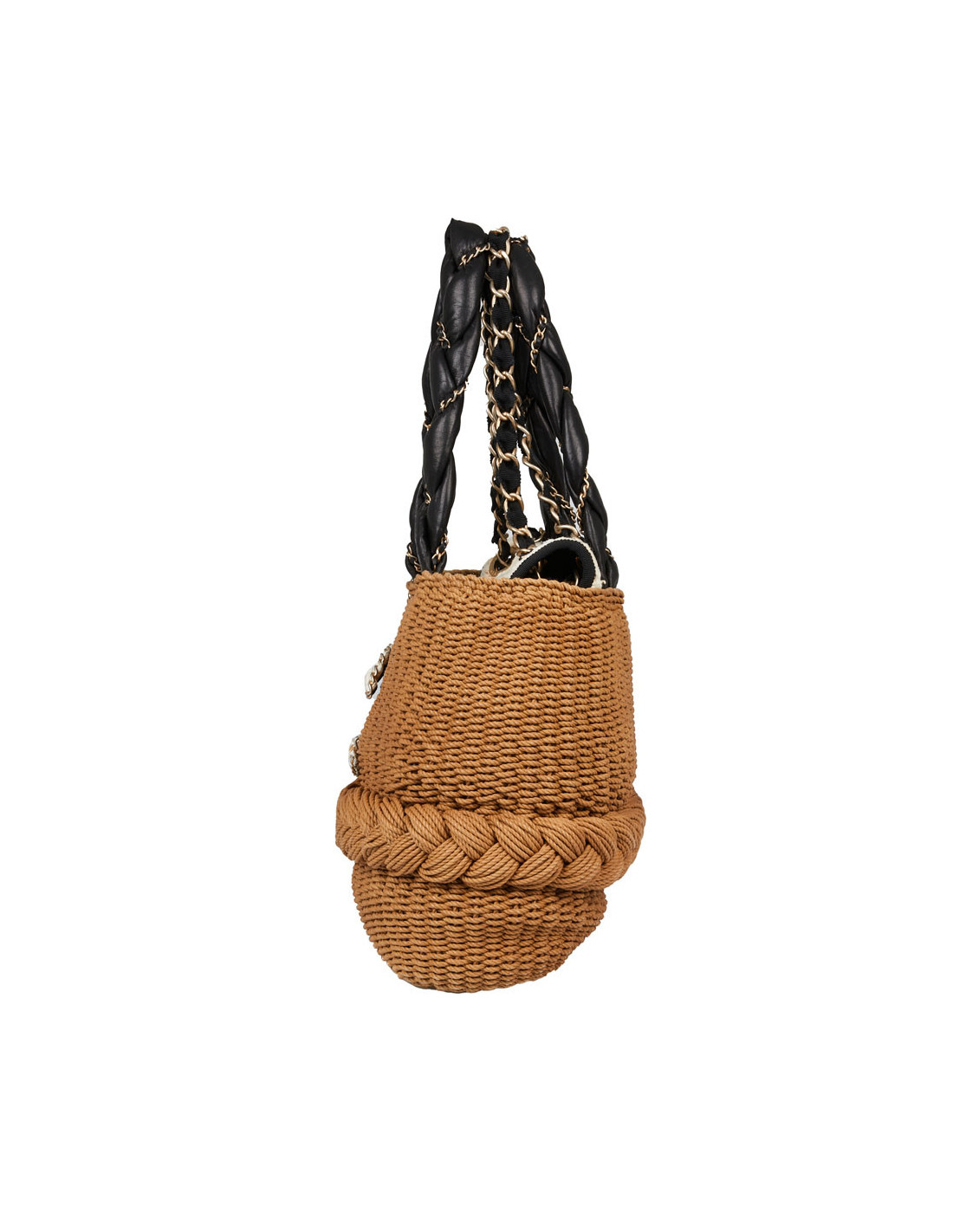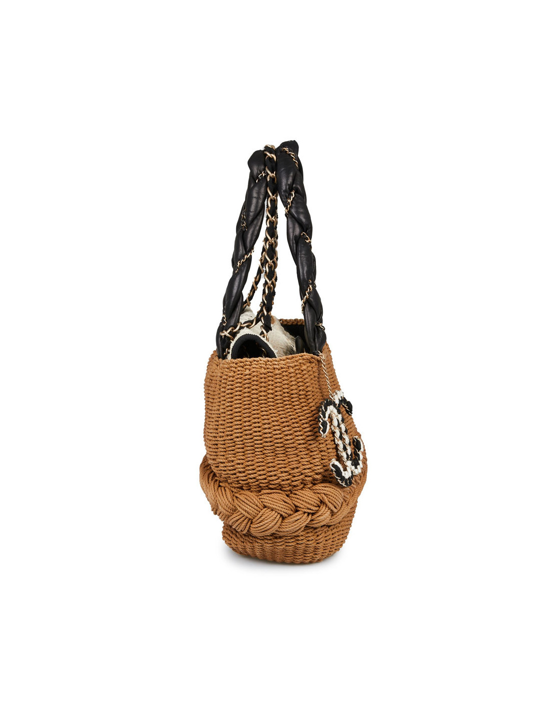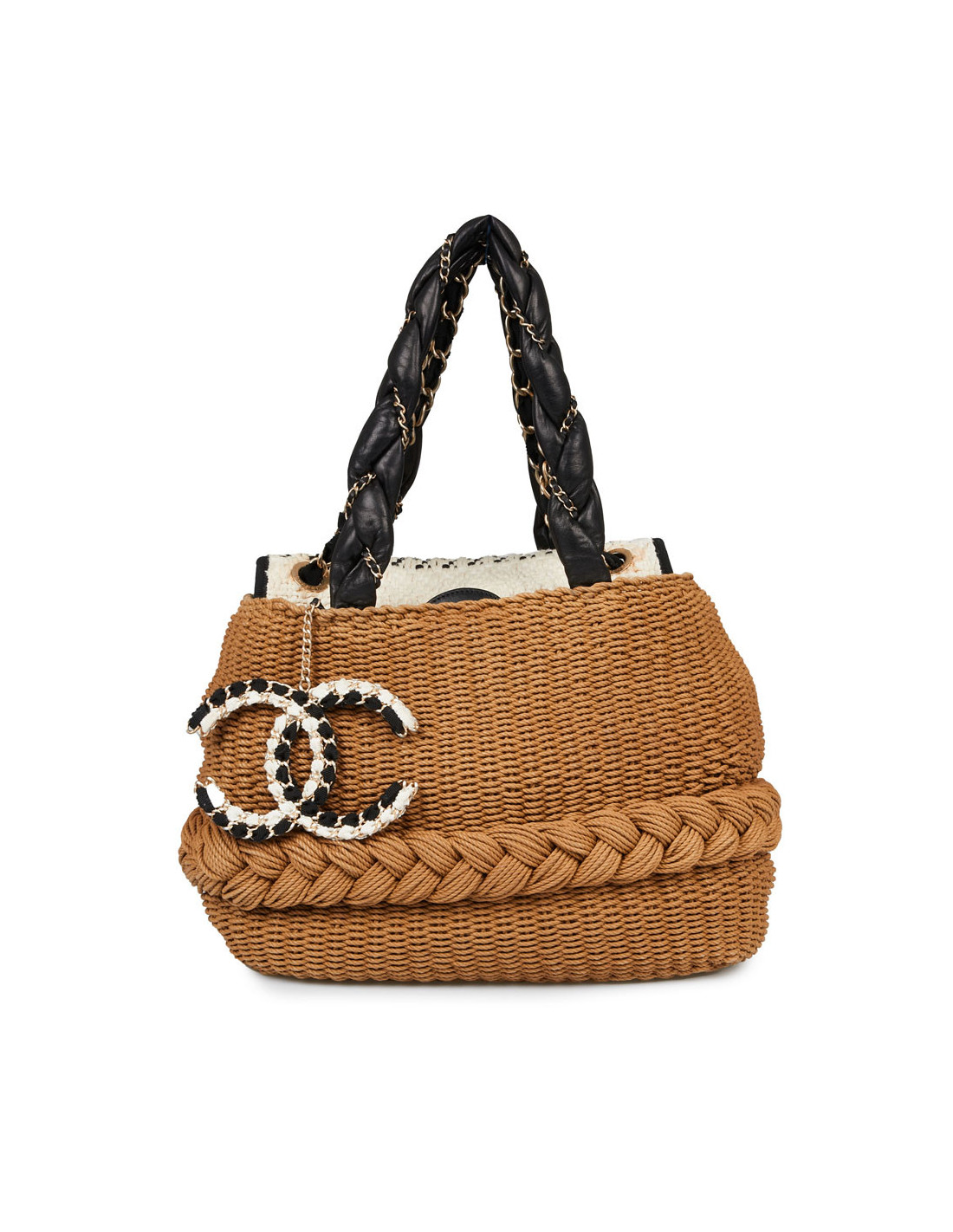 Détails : Sac panier en corde nattée et tressée, rabat en coton effet tweed, anses en cuir et gros bijou CC pendant. Le tweed présente une petite auréole jaune autour des 2 œillets du rabat mais le sac est en très bon état général.