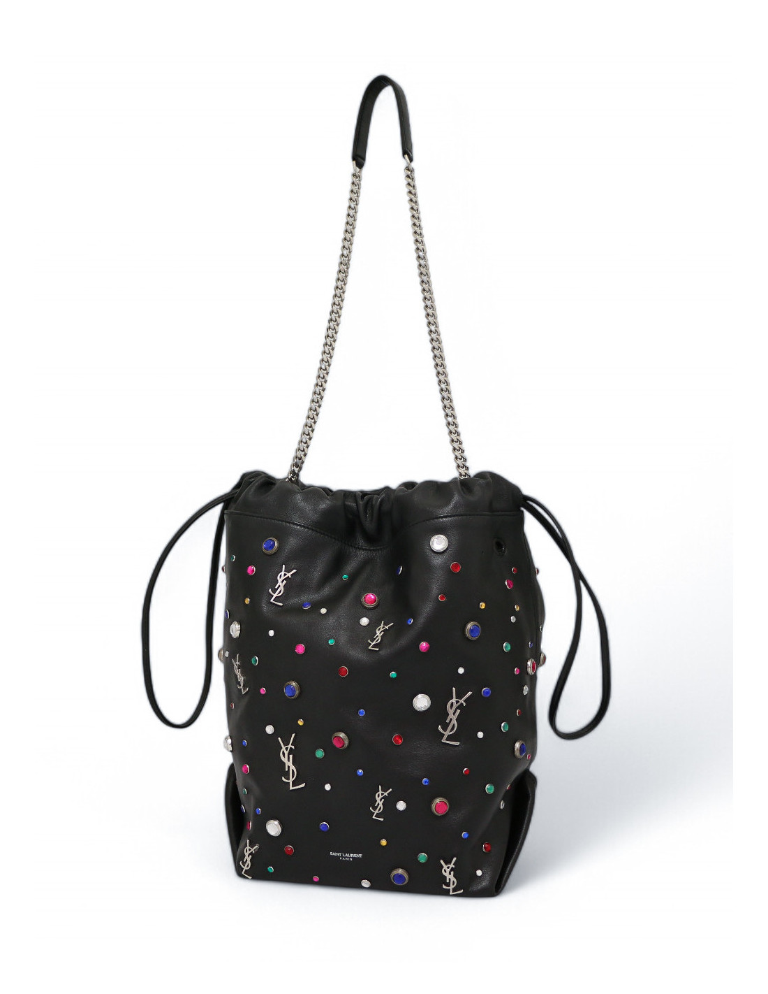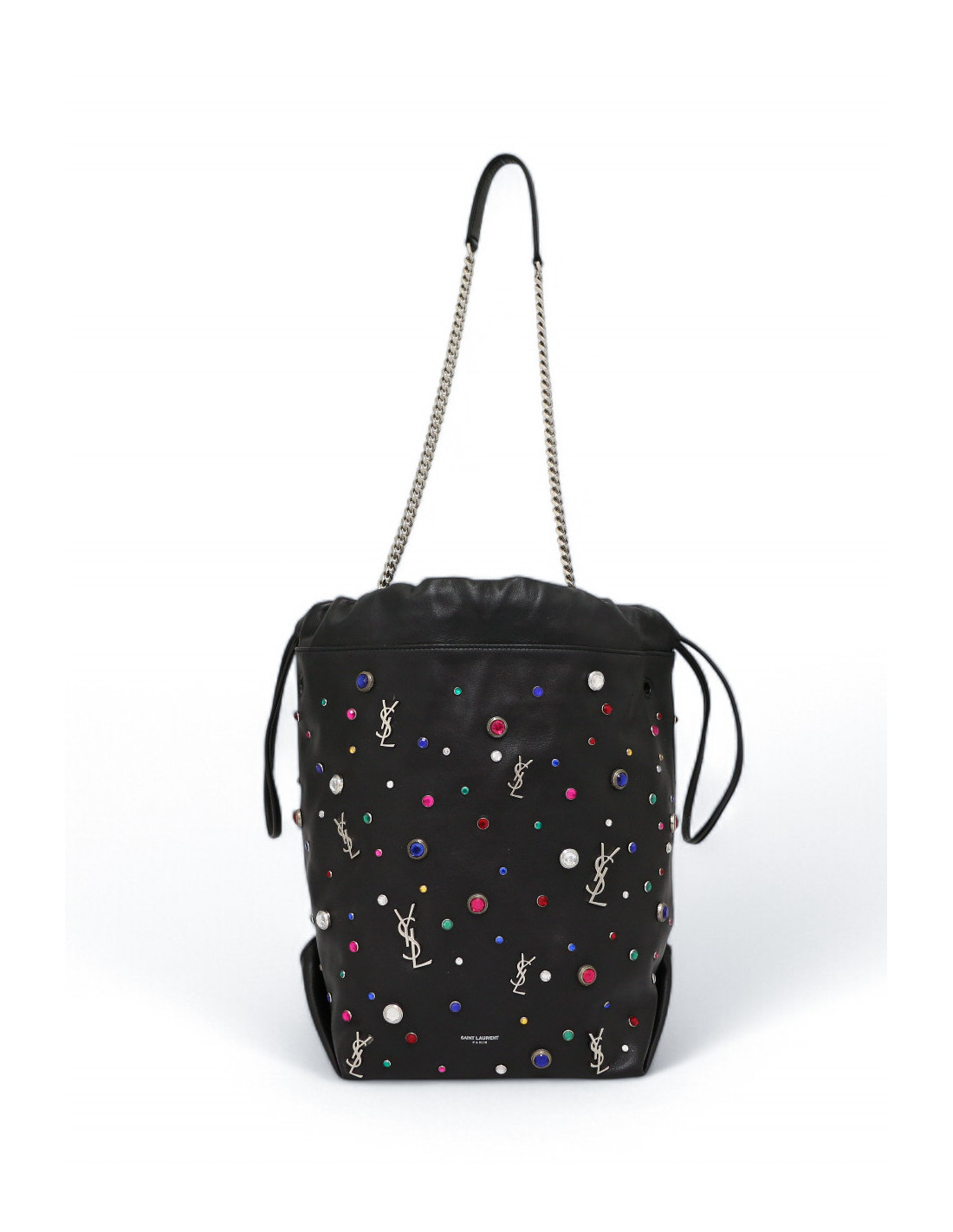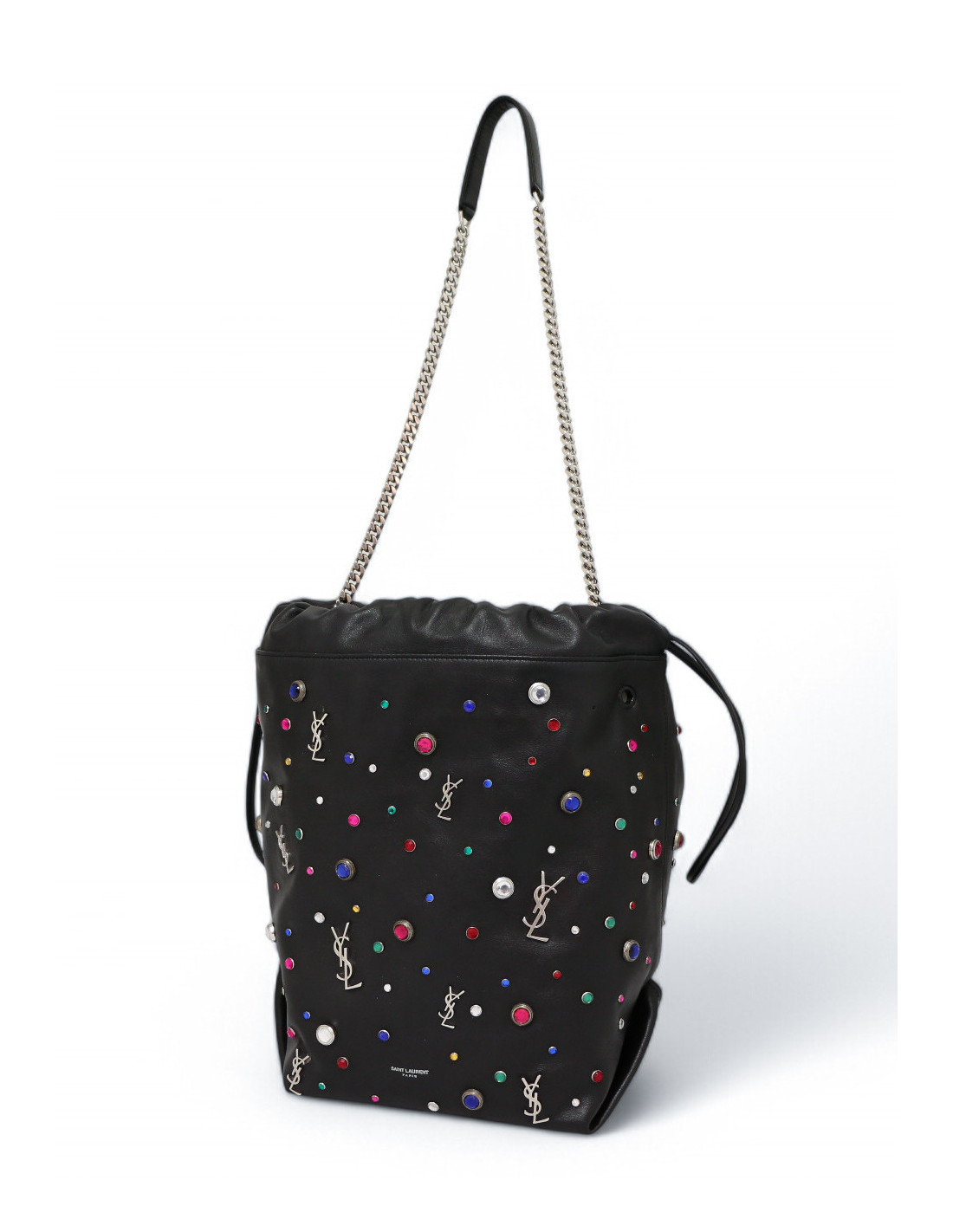 Détails : forme seau, porté épaule, fermeture par un cordon en cuir, une poche intérieure avec fermeture à glissière. Cristaux multicolores et petits logos YSL des deux côtés du sac. Très bon état malgré un strass manquant, presque invisible quand le sac est porté.