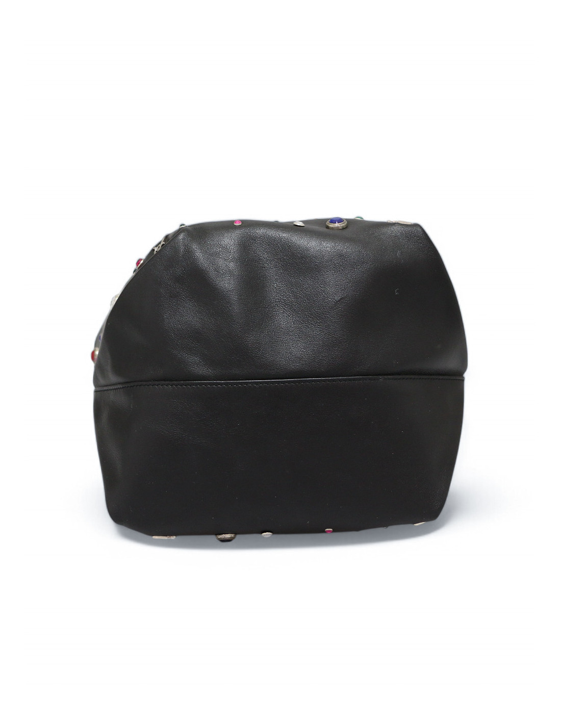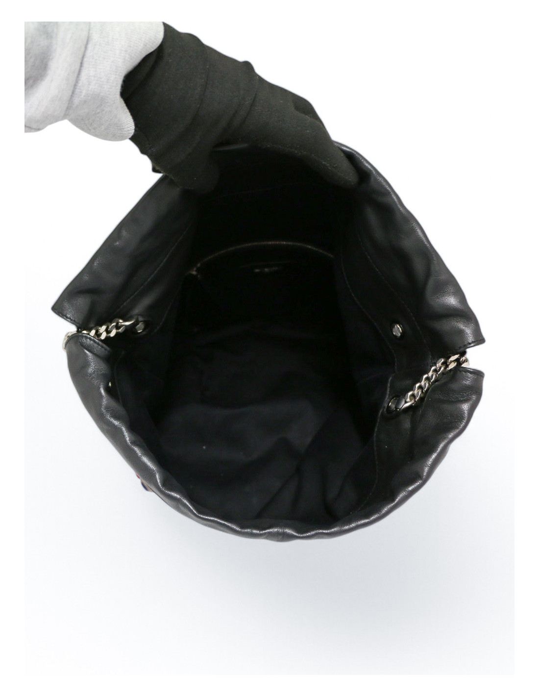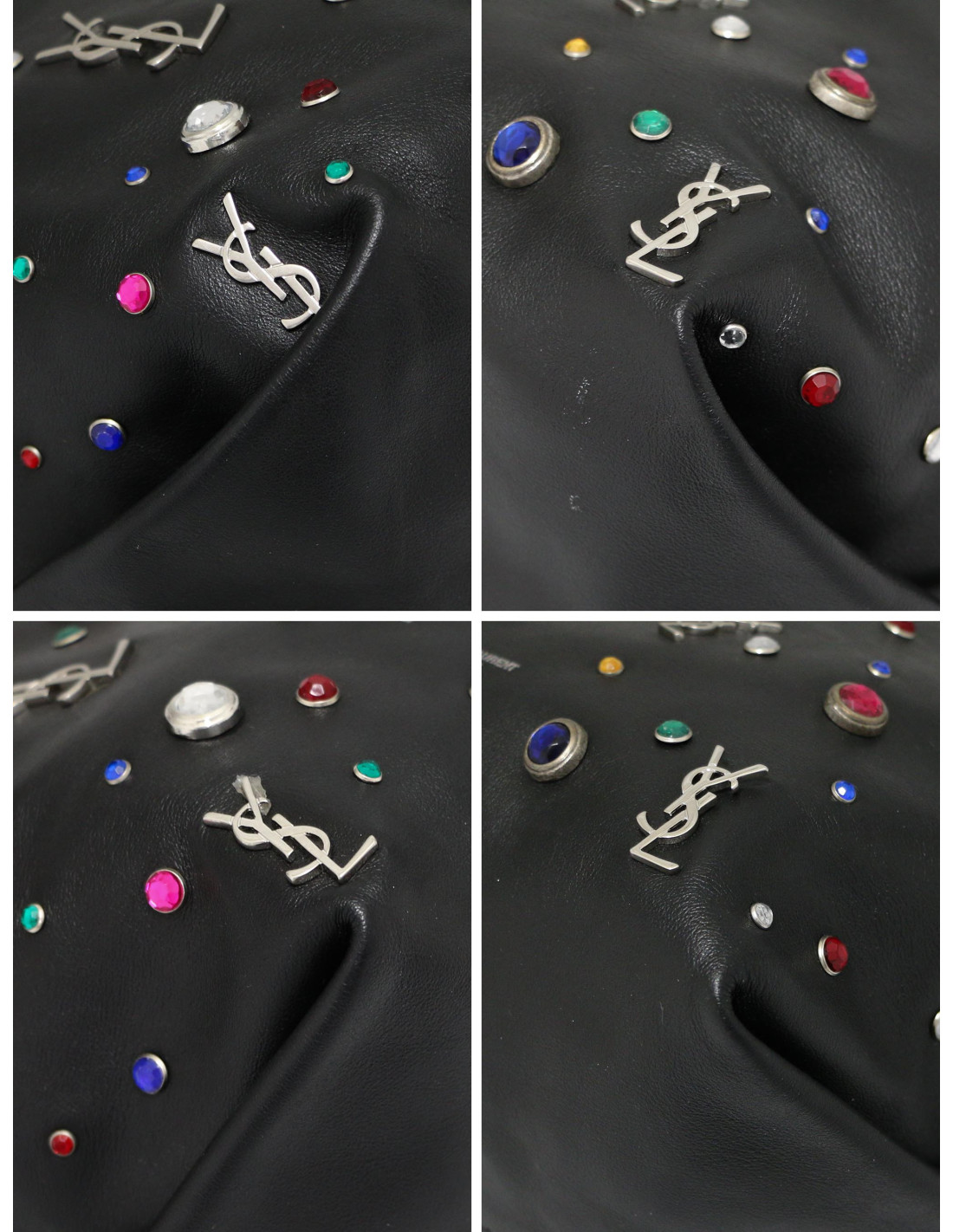 Détails : forme seau, porté épaule, fermeture par un cordon en cuir, une poche intérieure avec fermeture à glissière. Cristaux multicolores et petits logos YSL des deux côtés du sac. Très bon état malgré un strass manquant, presque invisible quand le sac est porté.