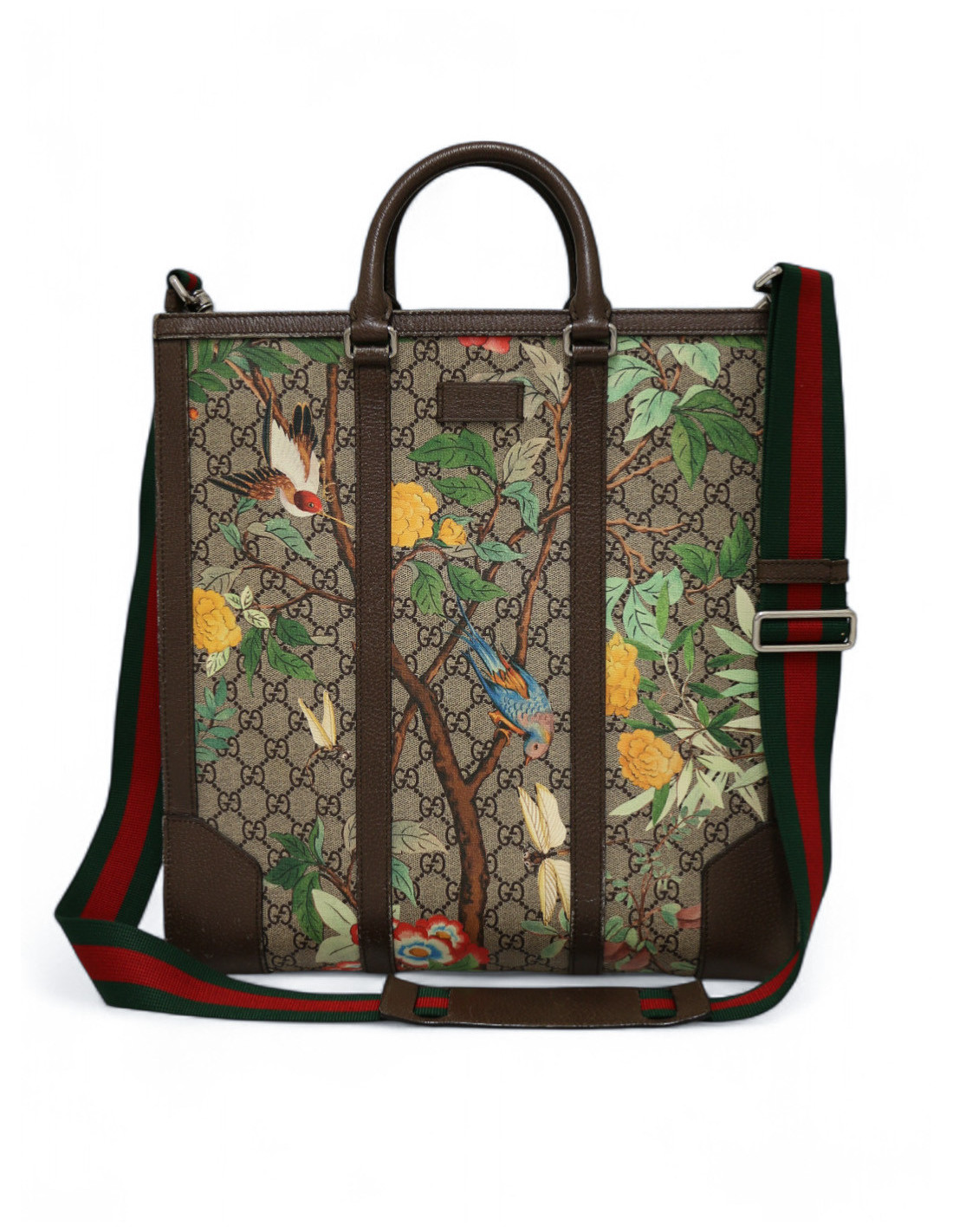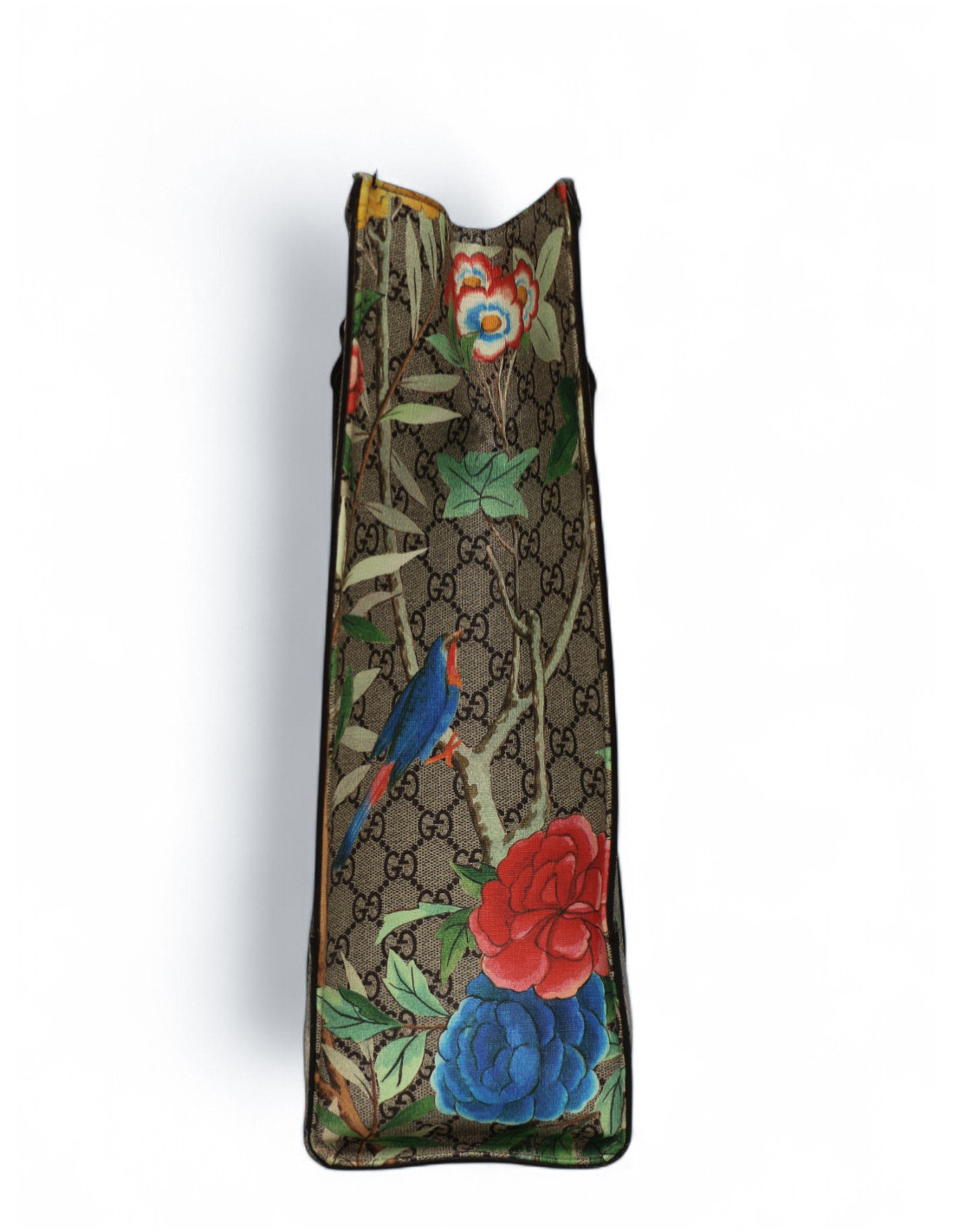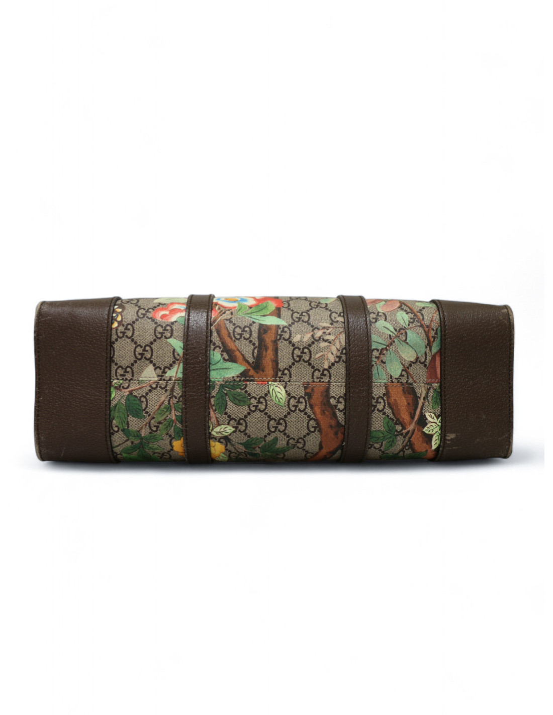 Détails : superbe cabas dont l'imprimé est inspiré des tapisseries chinoises du XVIII ème siècle. Des plantes, insectes et oiseaux viennent agrémenter l'emblématique toile GG. Bon état, des signes d'usure sur les empiècements en cuir et à l'intérieur. Trois grandes poches de rangement dont une zippée et des petites poches plaquées dont une fermée par un zip.