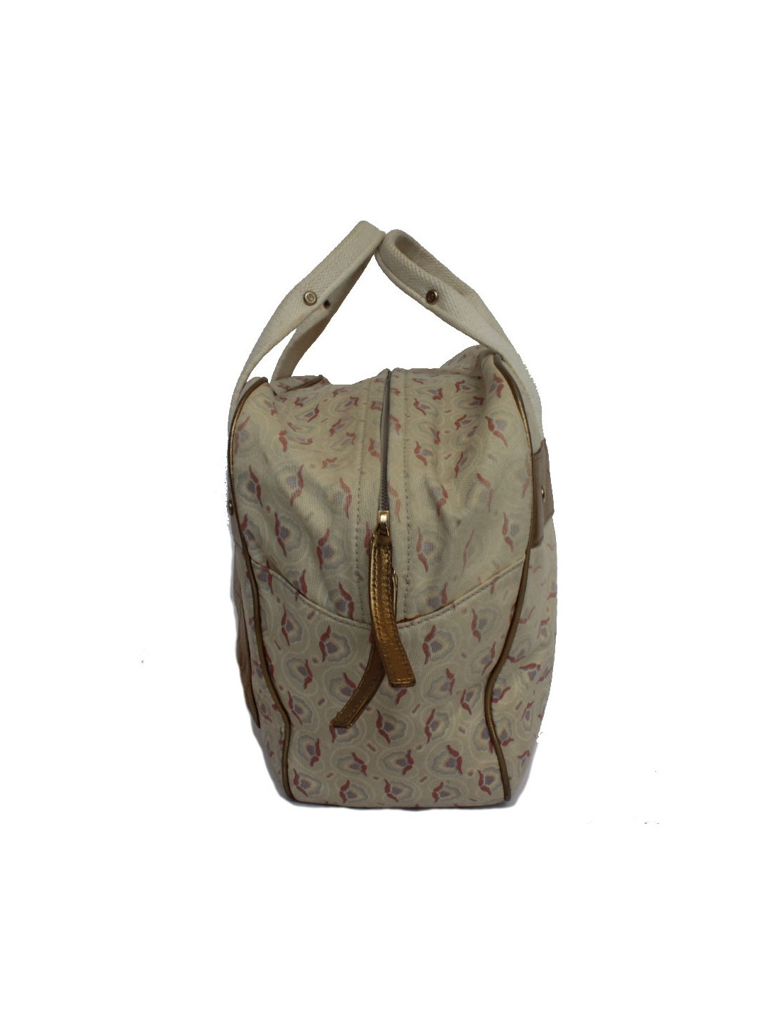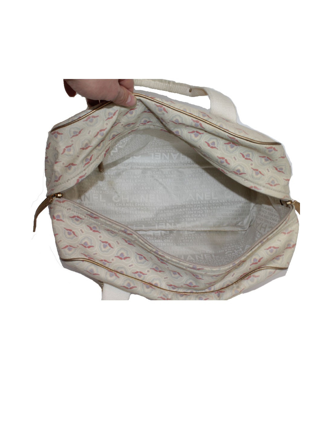 Ce sac CHANEL est en toile beige à fleurs bleu et rose avec une grosse pièce en cuir doré. il se porte à la main grâce à ses deux anses en corde. Elles sont ornées de clous métalliques dorés mat siglés "double C". L'intérieur est en en toile monogram beige. Il contient une petite poche zippée. La bijouterie est en métal doré. La pièce, aux allures de cabas a une grande capacité de contenu. Il est idéal en journée au quotidien. Il est en bon état, malgré quelques taches sur la toile et usures d'usage sur le cuir.