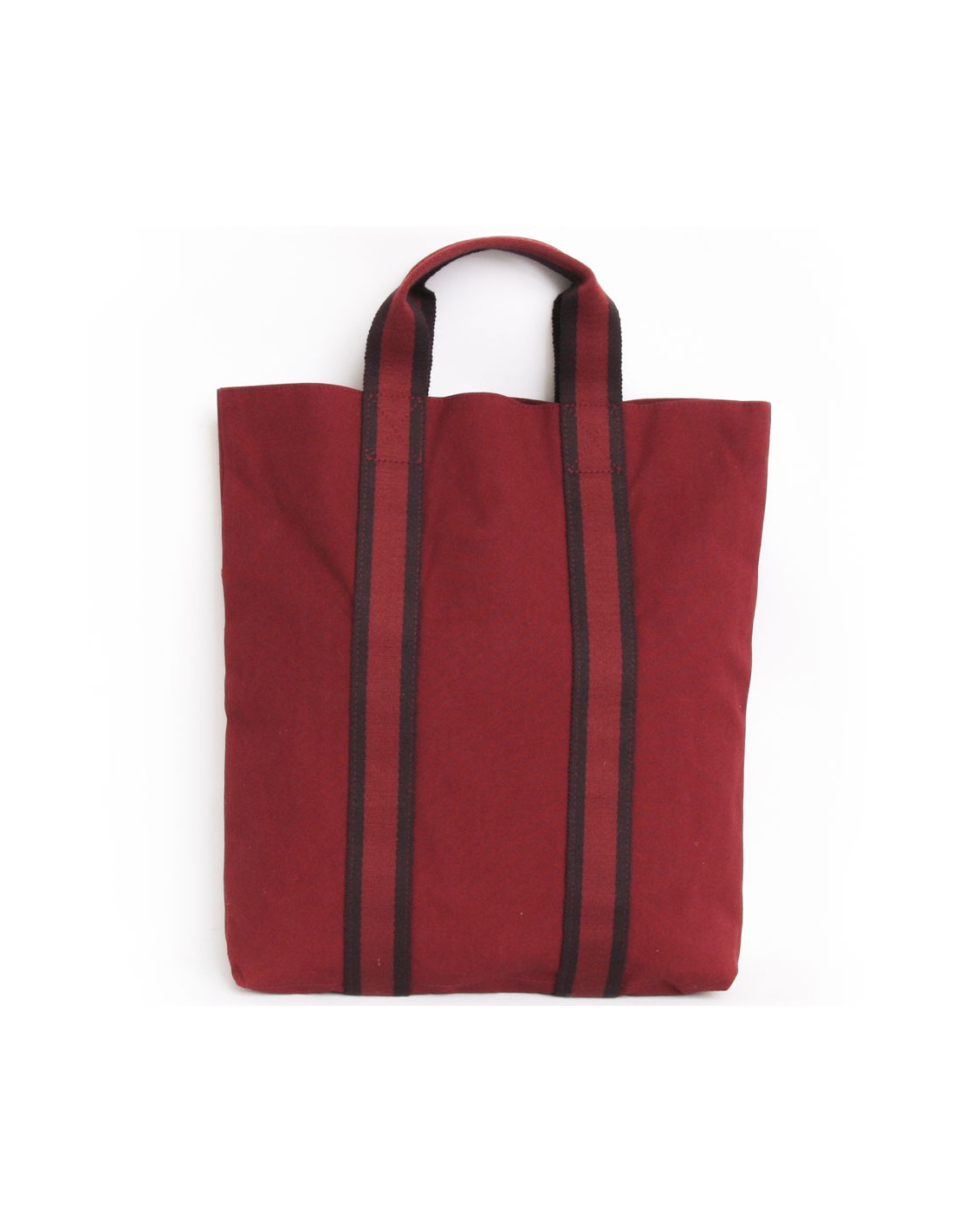 Sac cabas hermès, rouge H avec des bandes bordeaux, étiquette de la marque manquante. Il se porte à la main et peut contenir des dossiers ou bien un ordinateur. L'intérieur est doublé à l'identique.