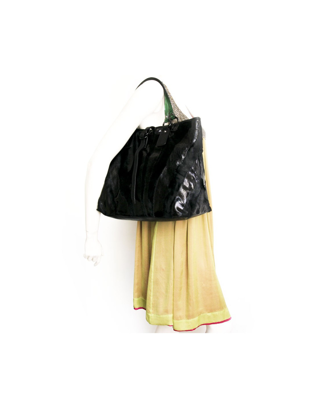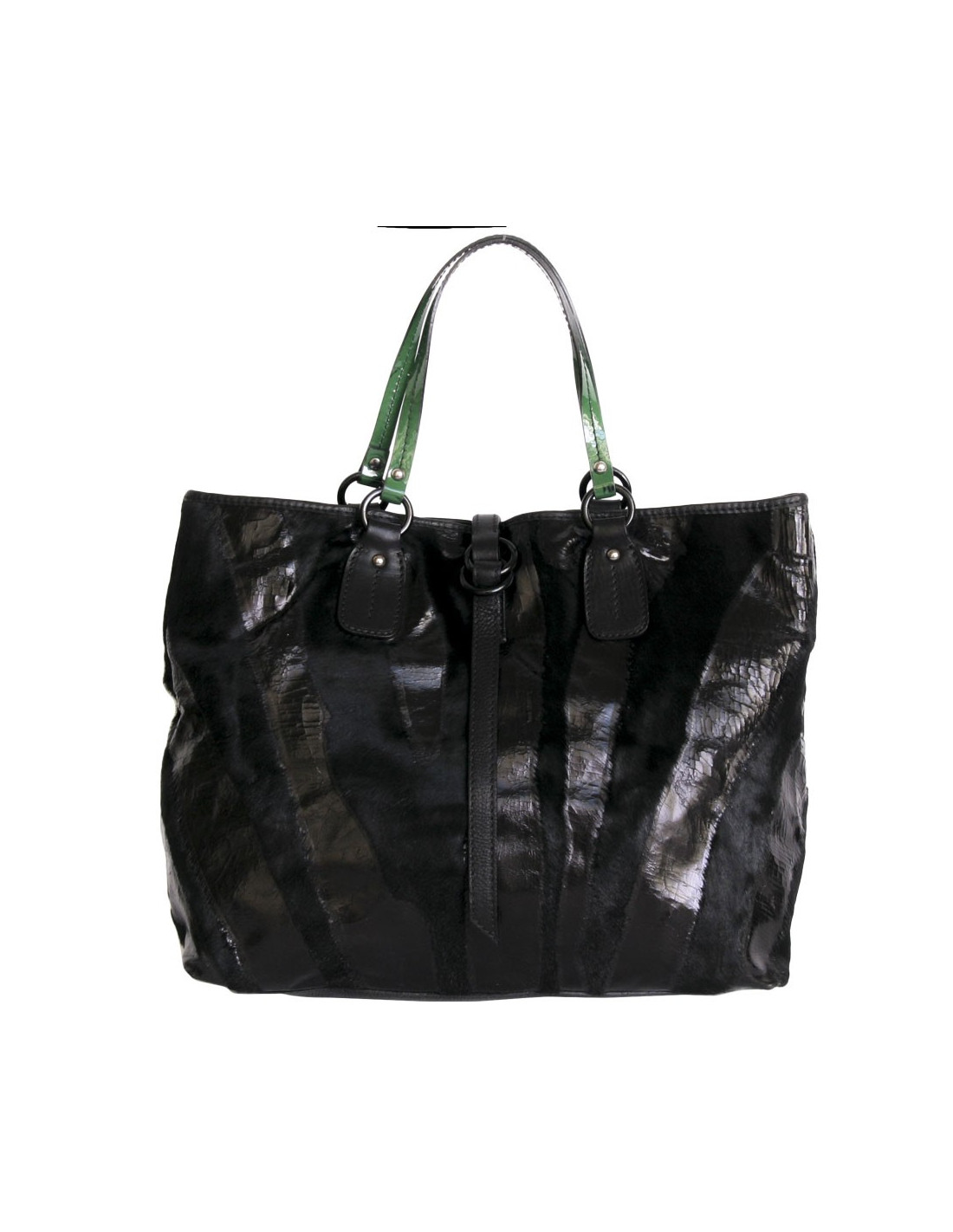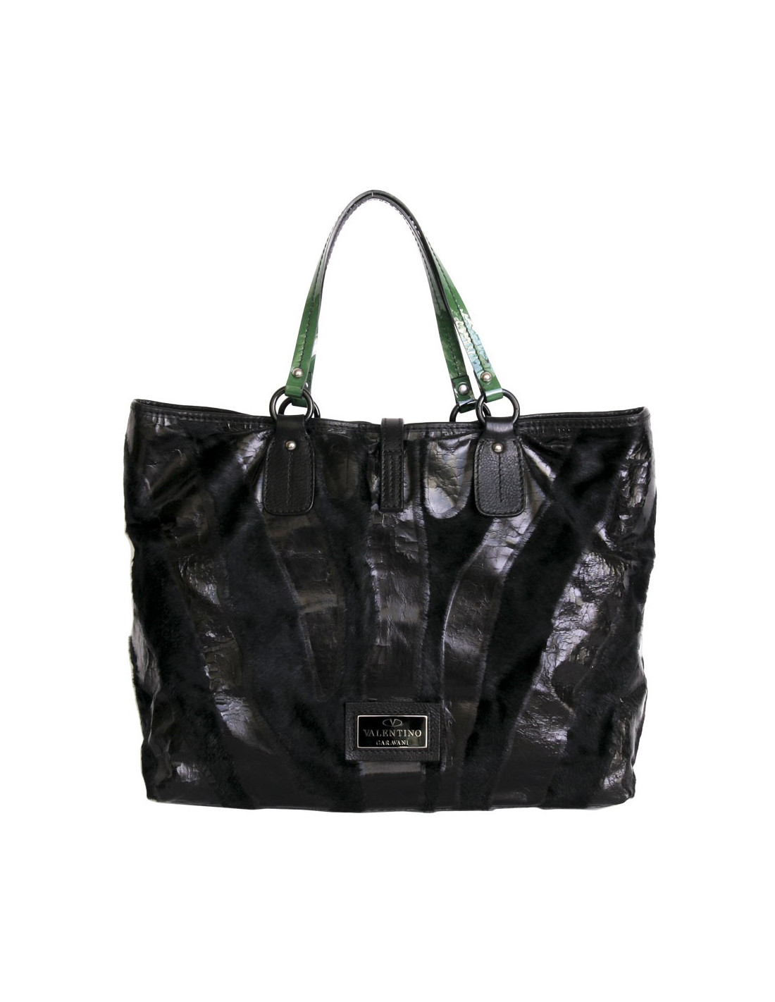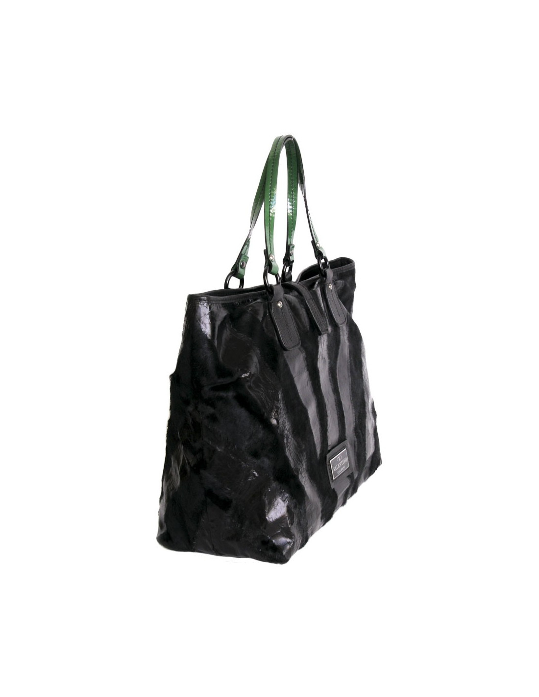 Cabas Valentino en cuir façon poulain et certaines parties en cuir vieilli verni noir. Il est en très bon état. Les anses sont en cuir verni vert et coutures noires. Il est pratique pour y mettre un ordinateur et documents.Il se porte à l'épaule.