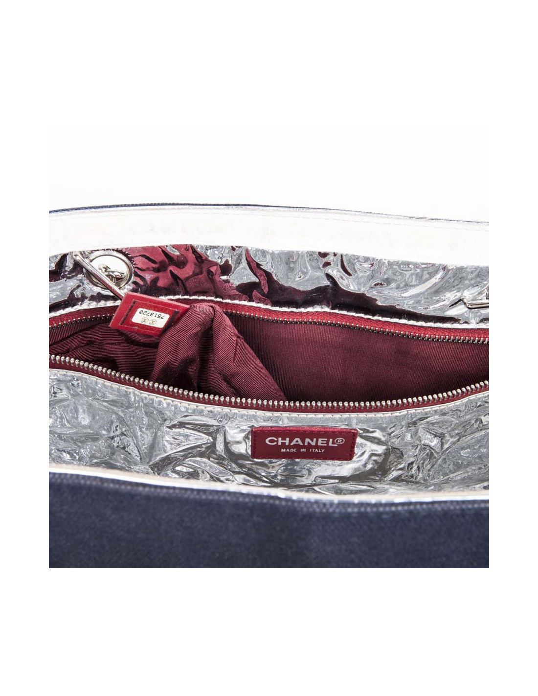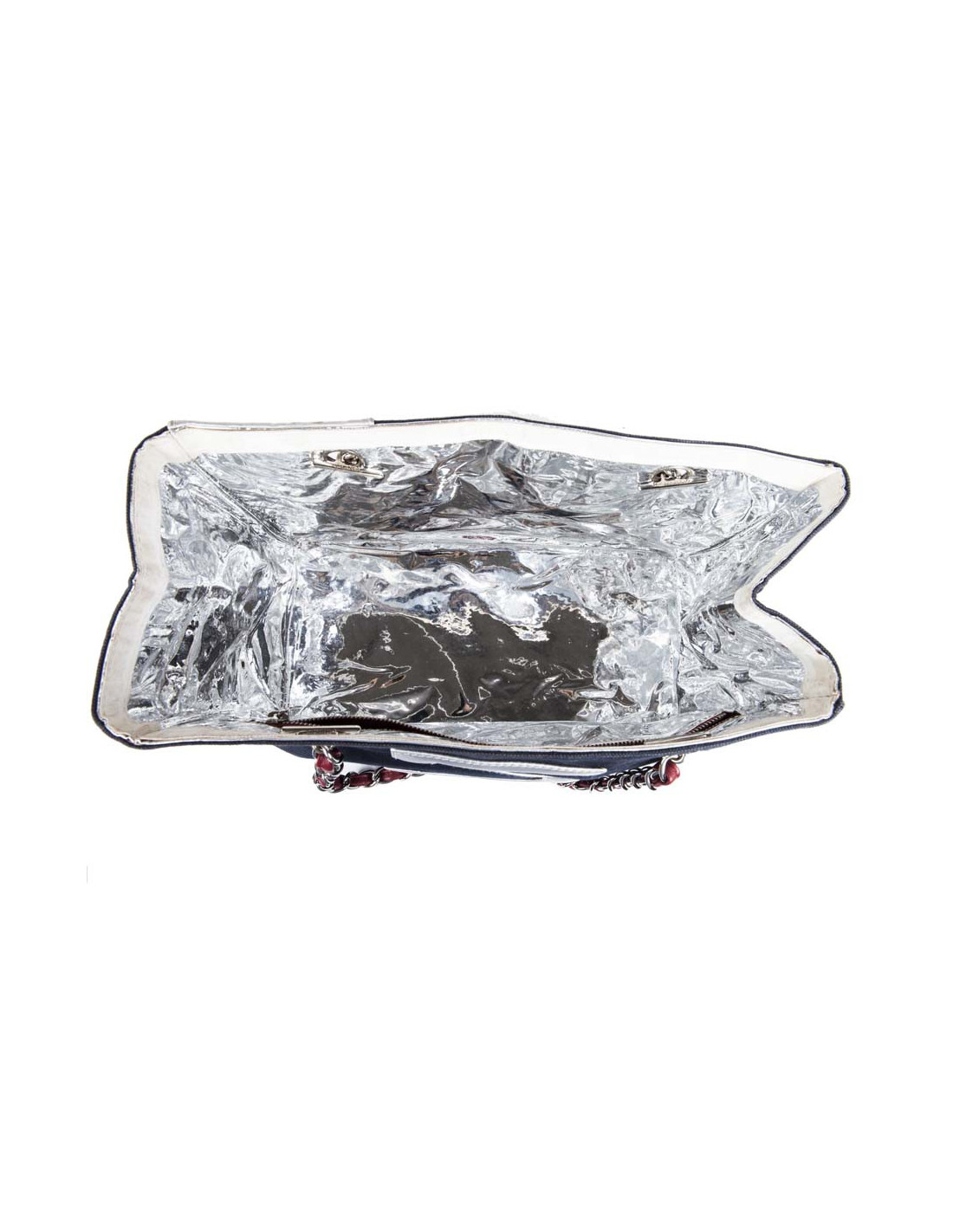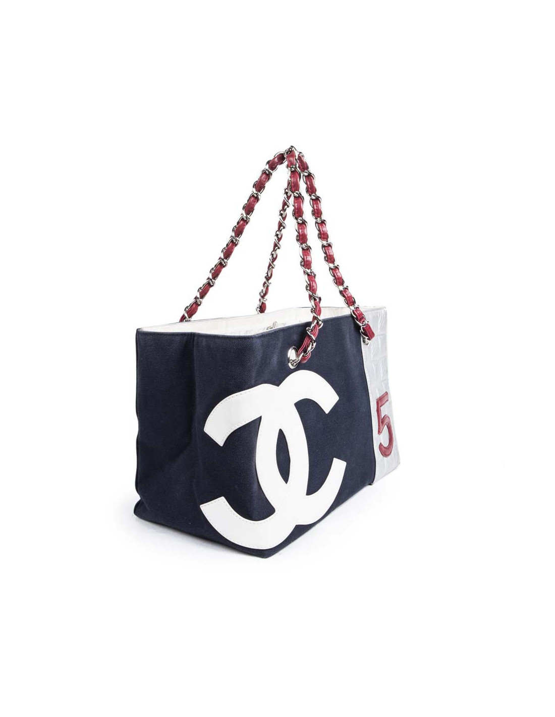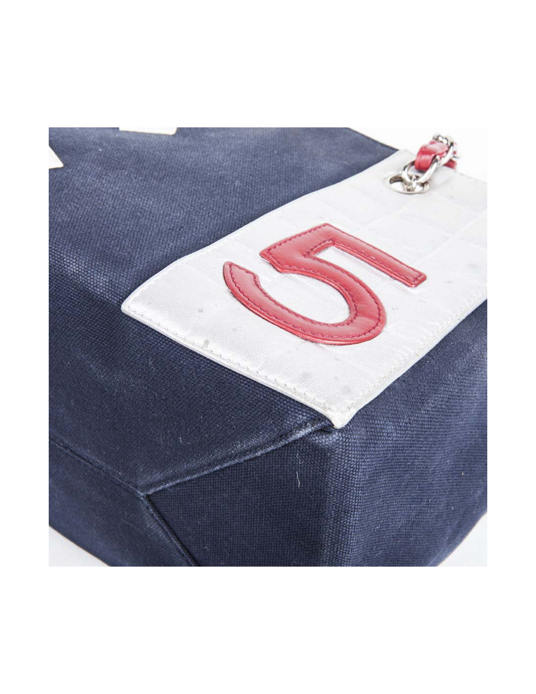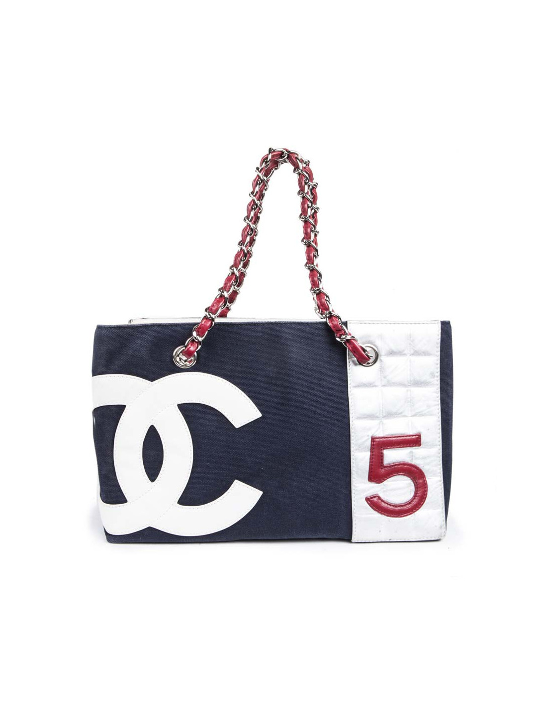 Collector. Sac de la Maison Chanel en toile bleu marine et cuir argenté matelassé. Le 'CC' est en cuir blanc et le numéro '5' en cuir rouge. Deux anses en chaîne argentée entrelacée de cuir rouge.