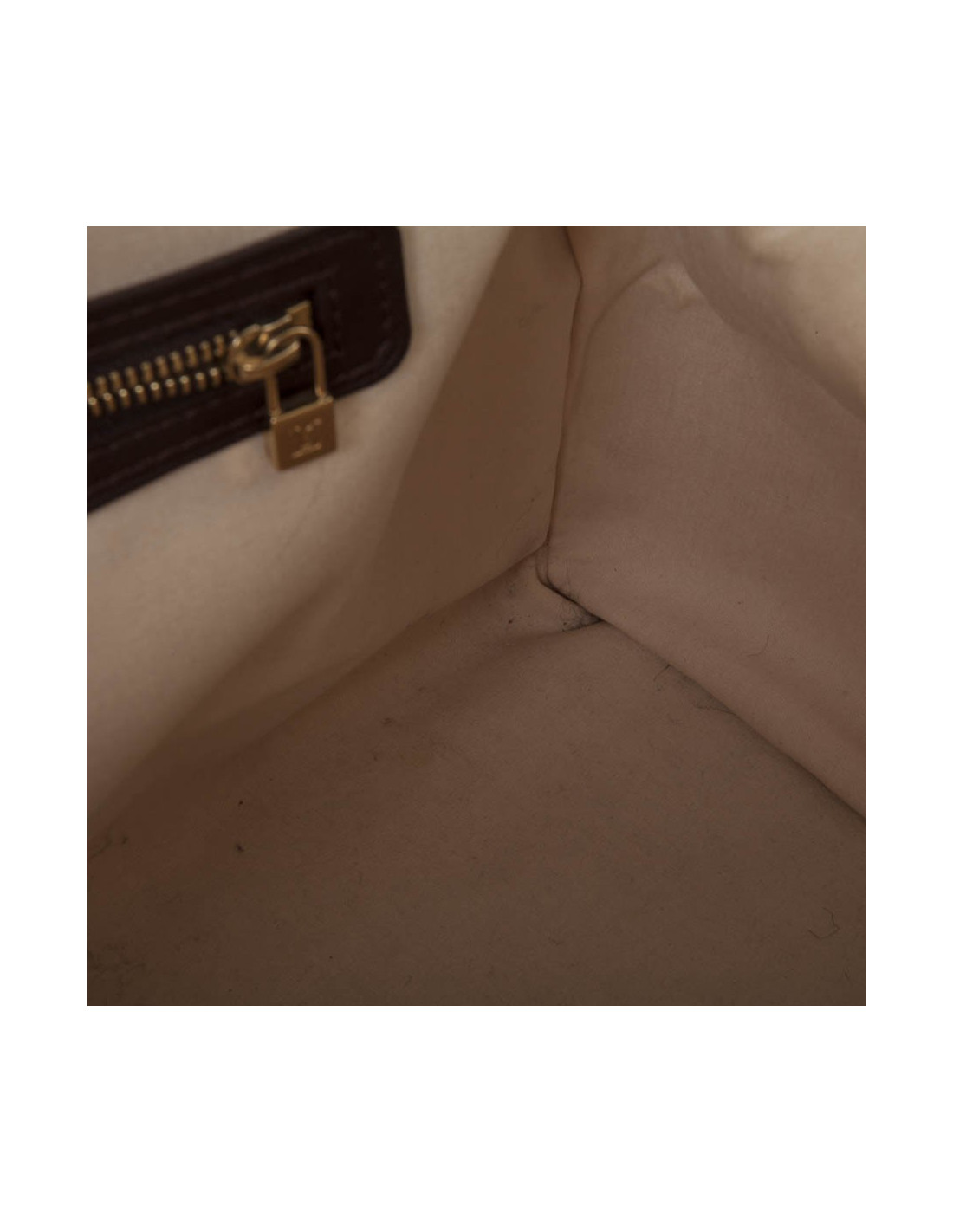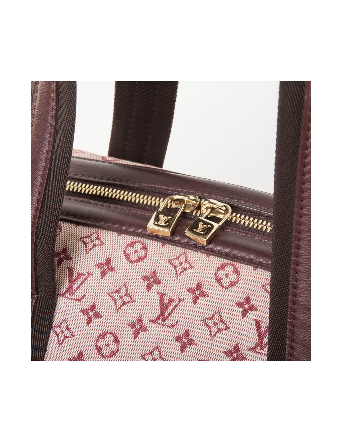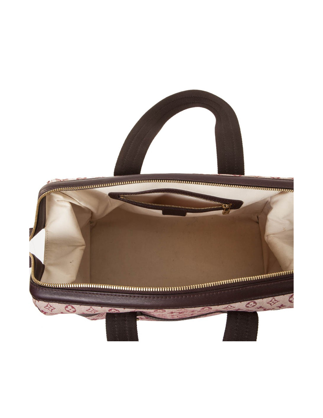 Il a une fermeture zippée. La bijouterie est en laiton. L'intérieur est en toile rose pâle, une grande poche fermée. Les finitions sont en cuir bordeaux. Il est en très bon état. De Très légères traces sur les coins du sac.