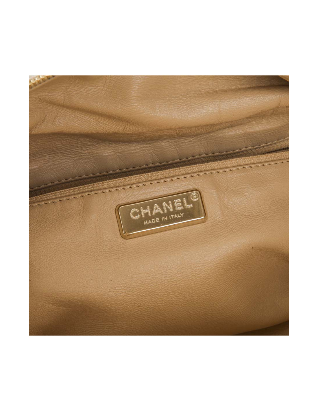 Sac 'bowling' en cuir grainé vieilli doré de la Maison Chanel. Bijouterie dorée. Fermeture zippée. L'intérieur est en cuir d'agneau lisse beige avec une grande poche zippée et deux plus petites.
