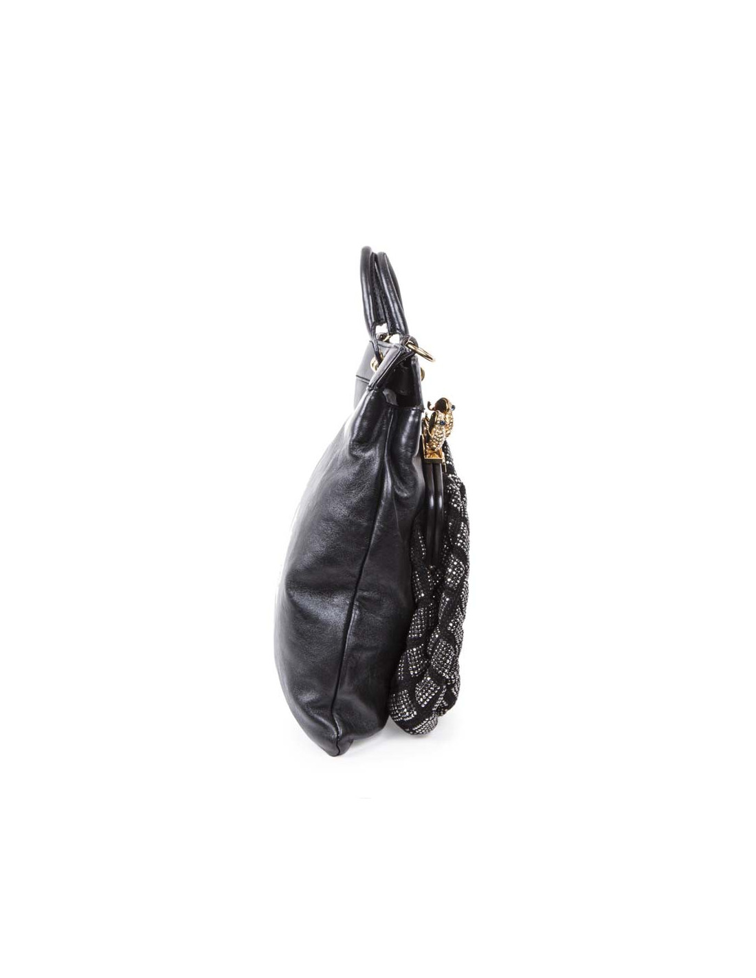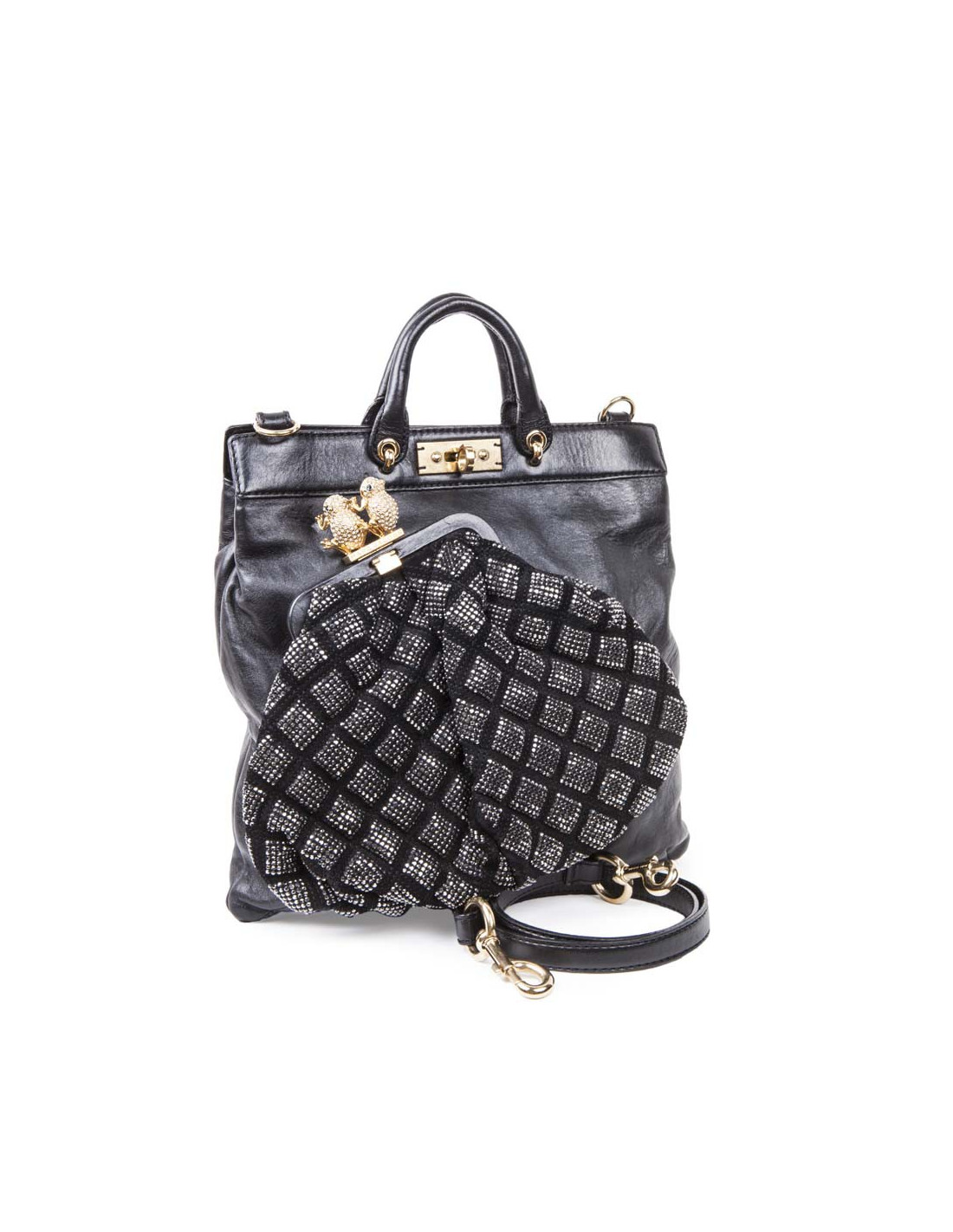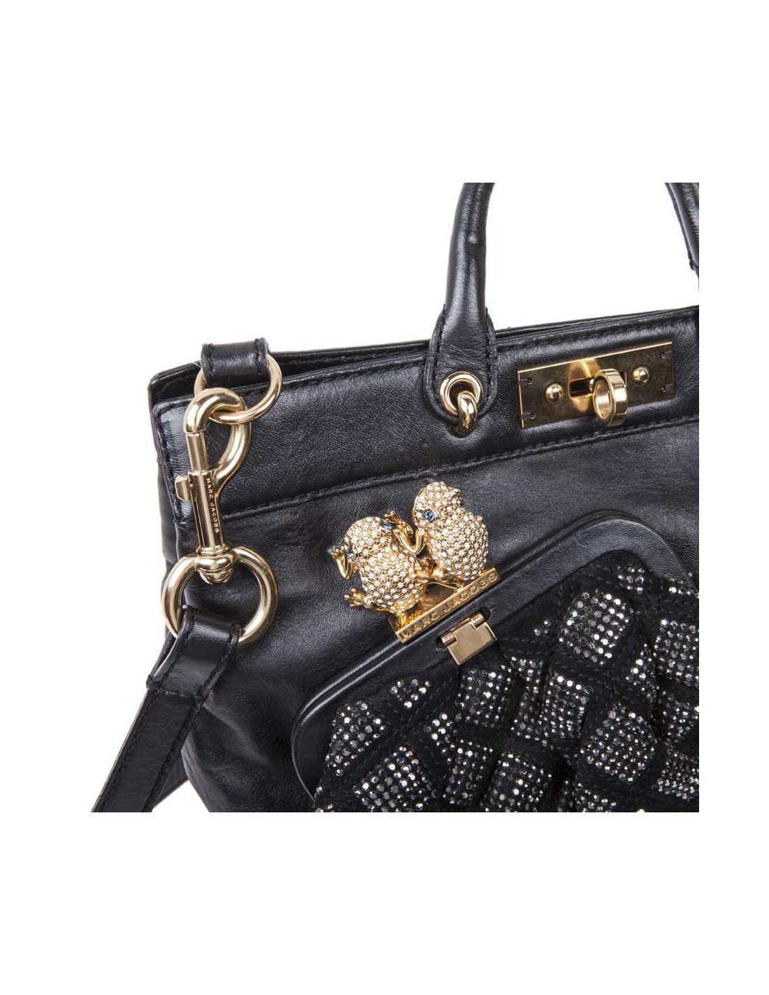 Superbe sac Marc Jacobs, en cuir lisse noir, sur lequel, à l'avant, il y a une poche incrustée de crystal mesh noir en guise d'un grand porte-monnaie, surmontée de 2 grenouilles dorées serties de brillants.