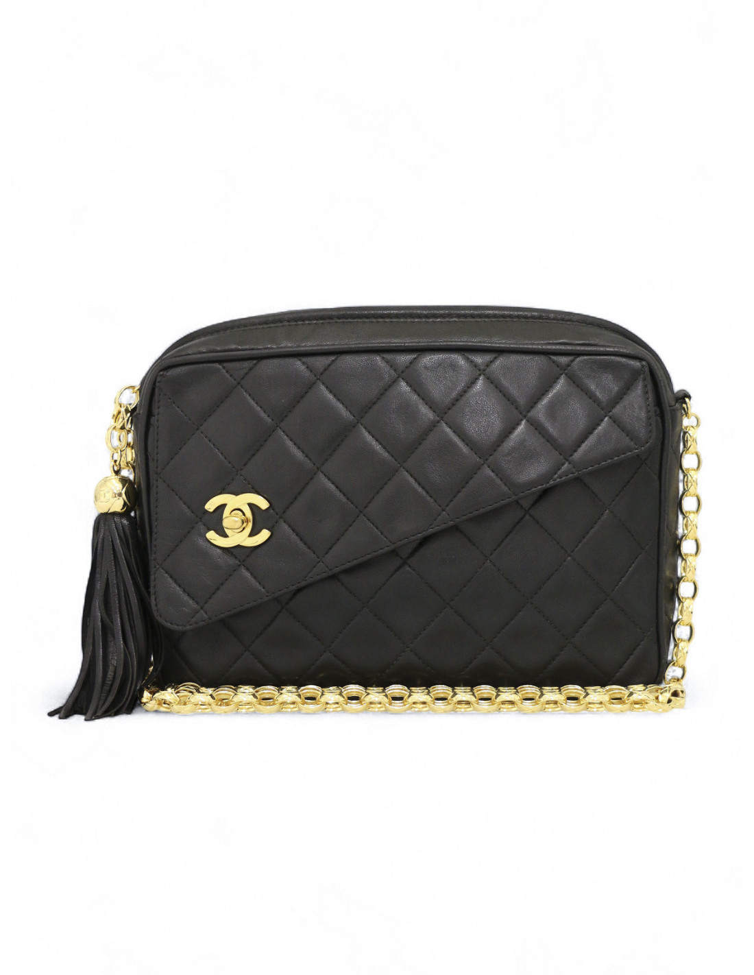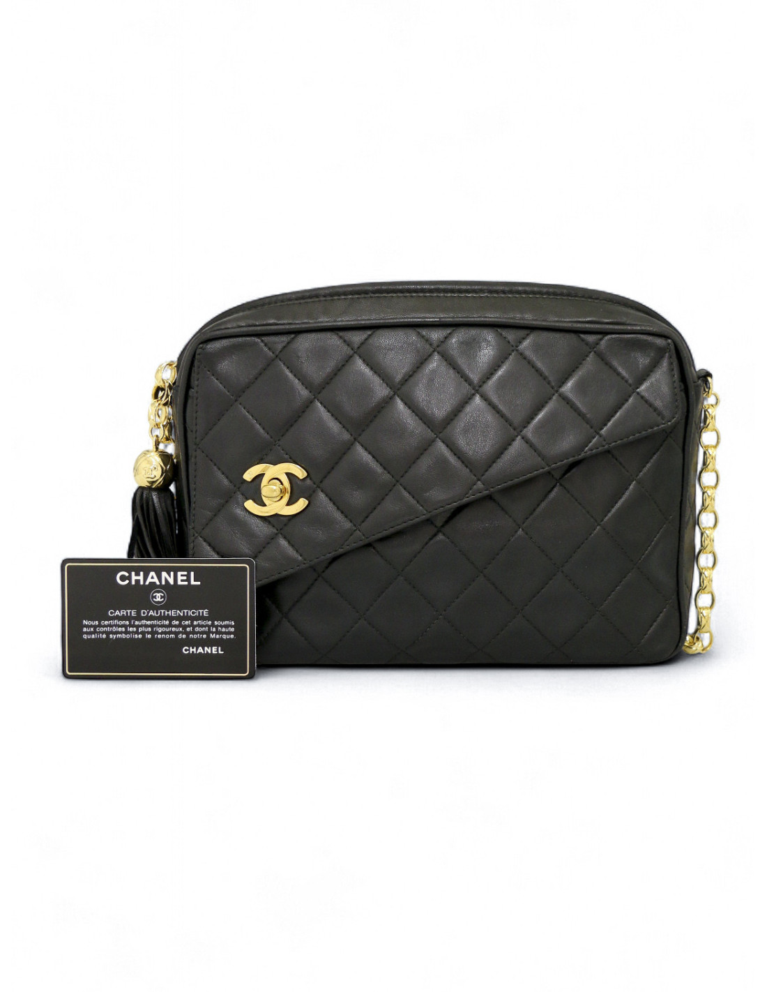 Détails : superbe sac modèle Caméra vintage noir avec sa chaîne bijou matelassé en métal doré à l'or 24K. Fermeture zippée agrémentée d'un charms pompon en cuir. Petite poche à rabat à l'avant avec le fermoir Turnlock CC. La dorure est étincelante. A l'intérieur un espace unique de rangement avec une pochette zippée.Il se porte à l'épaule ou croisé. Aucune usure ou tâche.
