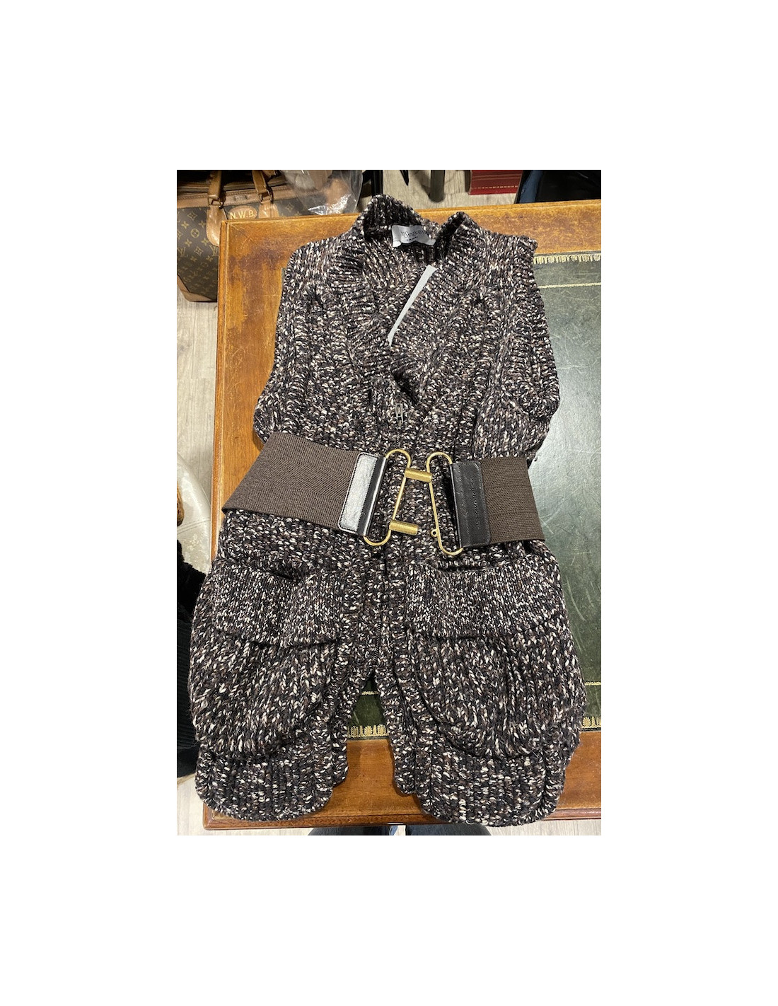 Derniers articles en stock ENSEMBLE Ensemble jupe et gilet ALAIA T 42IT ALAIA 15414 1 350,00 € Ensemble jupe et gilet Azzedine Alaïa tons gris argenté sur fond vieux rose. Un gilet court et une jupe d'une ampleur de 2.50 m. Fermeture zippée invisible sur l'arrière de la jupe (hauteur 20 cm). Matière : polyamide, viscose et soie Made in Italy En très bon état Dimensions à plat : Gilet : taille 42 IT / 38 FR épaules 42 cm, hauteur 42 cm, manches... Ajouter au panier
