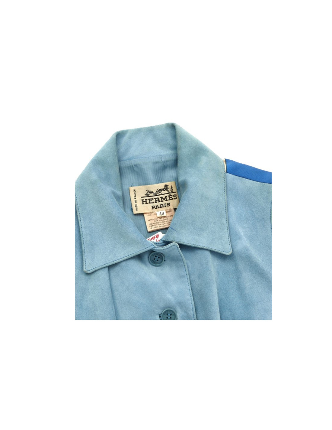Vintage, veste courte Hermes sans manche en suède bleu ciel et dos en soie imprimé cavaliers "Hermès Cup Palm Beach". Elle est boutonnée devant avec deux poches passepoilées, doublée.