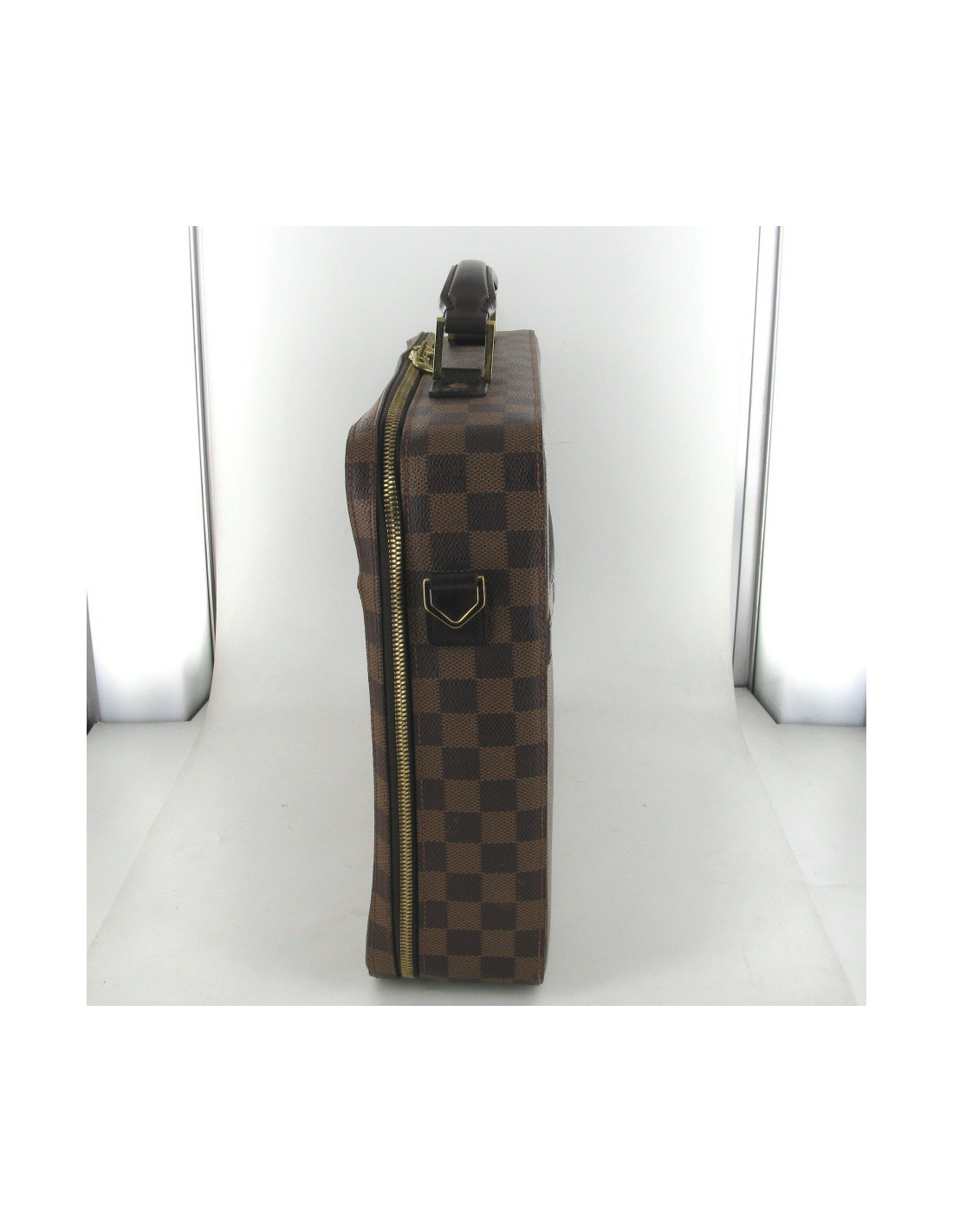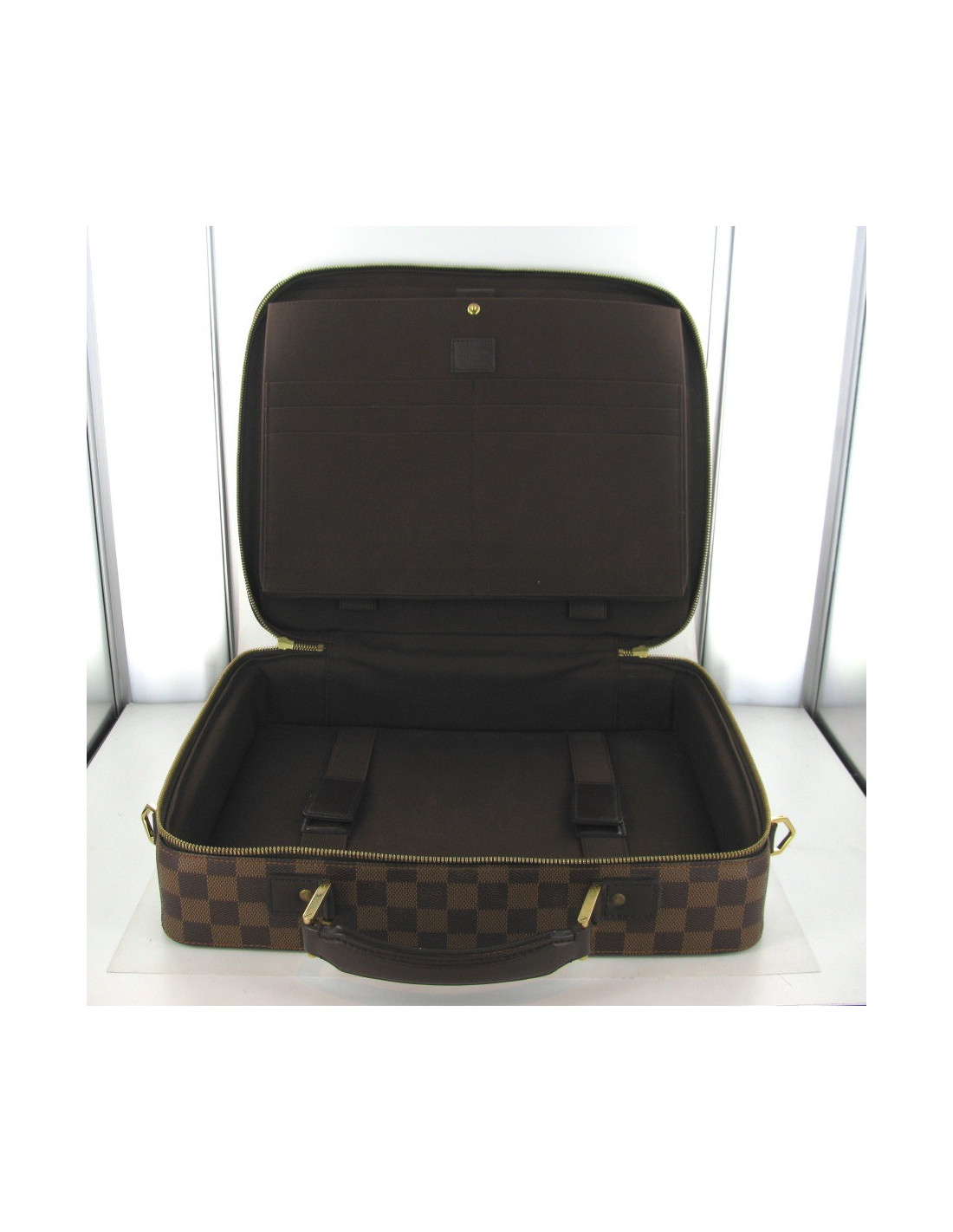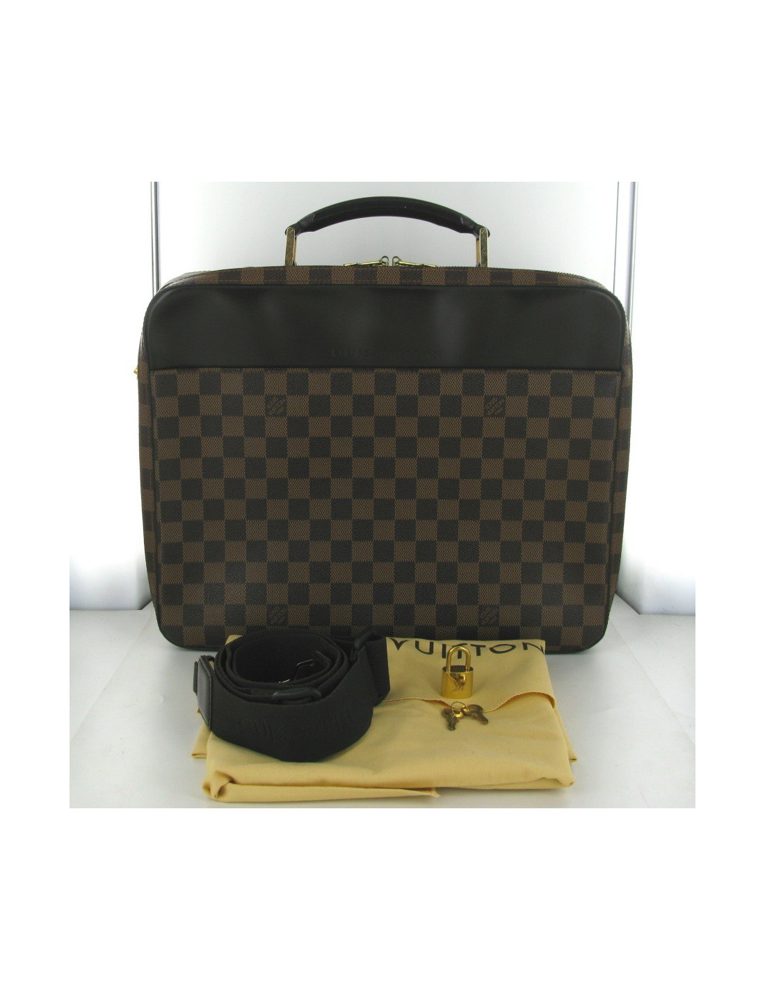 Joli sacoche ordinateur LOUIS VUITTON modèle Sabana en toile enduite Damier. Les parties métalliques sont en laiton doré, l'intérieur est en toile marron. Il y a une poche avant, 1 poche intérieure fermée par bouton pression et 6 poches intérieures plaquées. Livrée avec bandoulière en tissu amovible, cadenas et clés et dustbag.
