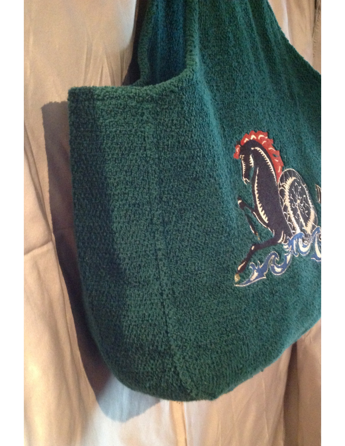 ce joli sac de plage en éponge HERMES 100% coton est indispensable pour cet été ! . A l'avant du sac est brodé l'incontournable emblème de la Maison HERMES, le cheval. L'intérieur est en coton marron foncé. Il se porte à l'épaule grâce à une grande bandoulière.