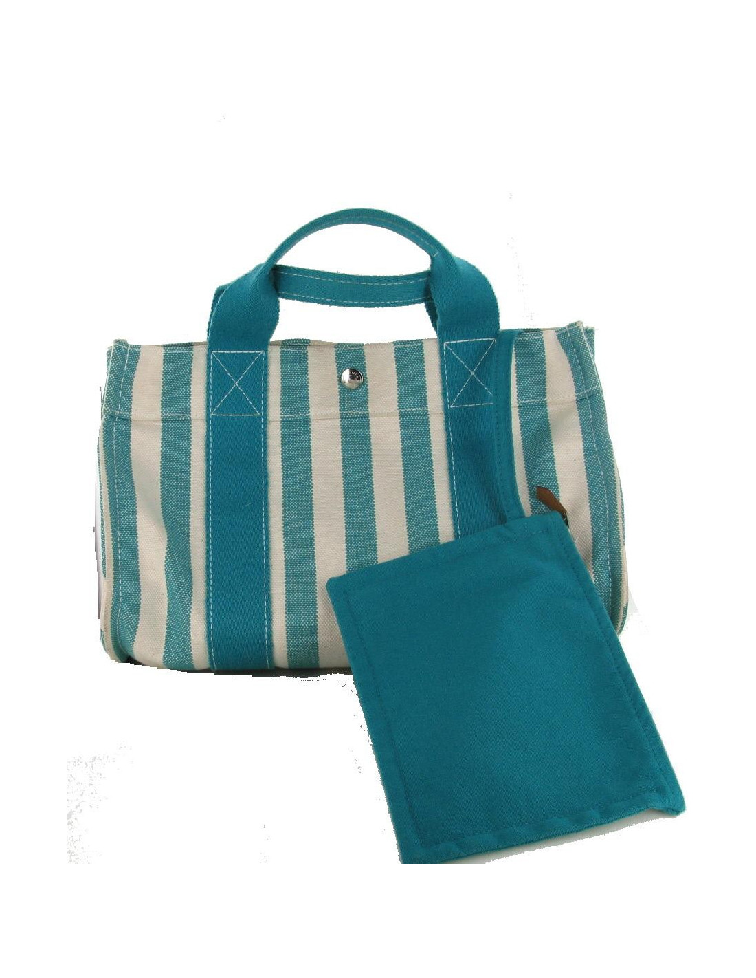 Sac de plage HERMES à rayures bicolores bleu turquoise et blanc. Il est en toile, idéal pour la saison estivale. Le fermoir est un bouton pression en plaqué argent palladié