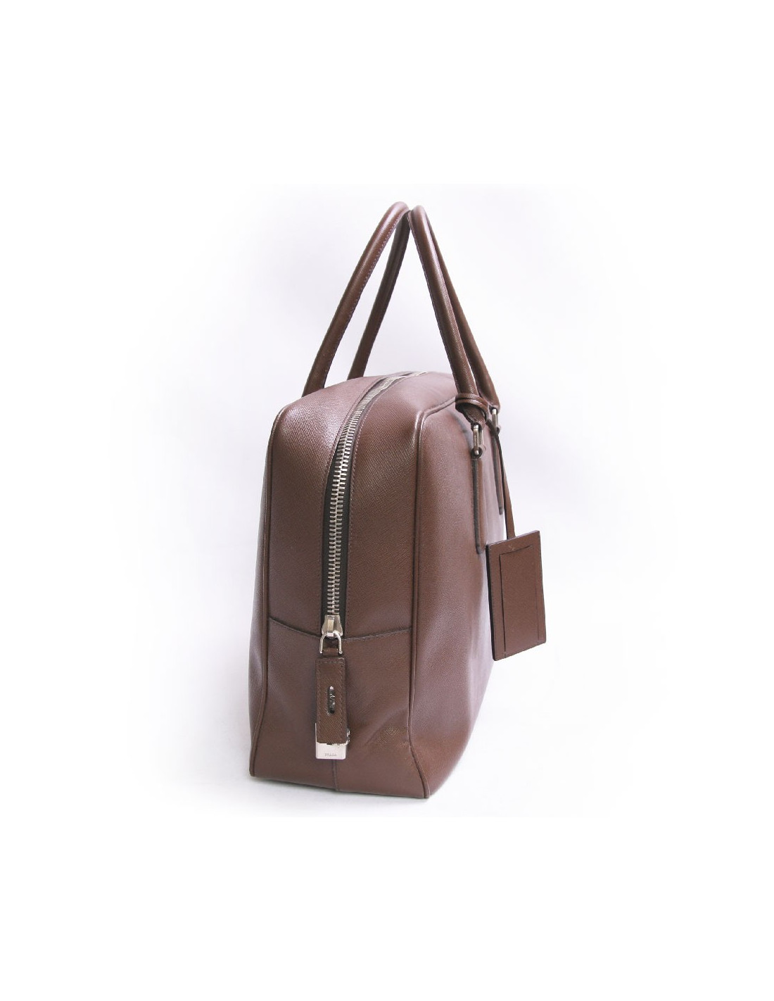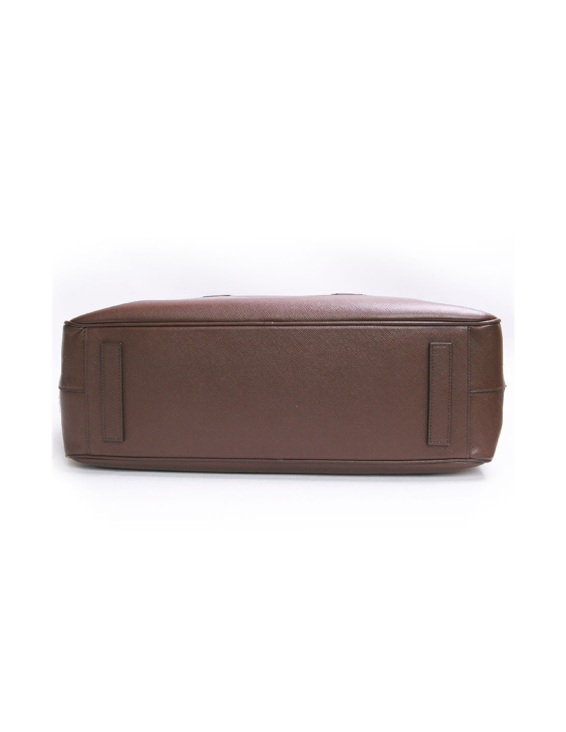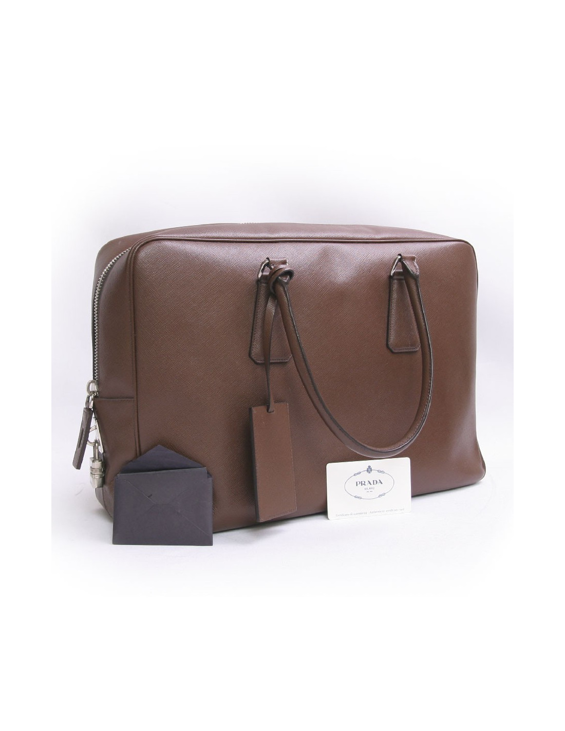 Sac Prada en cuir saffiano couleur cacao. Double poignée. Fermeture zippée. L'accastillage est en métal argenté. L'intérieur est en toile monogram avec deux grandes poches zippées, 3 emplacements pour stylos, 1 poche pour smartphone et 1 petite poche plaquée. Il a d'un porte adresse.En très bon état.