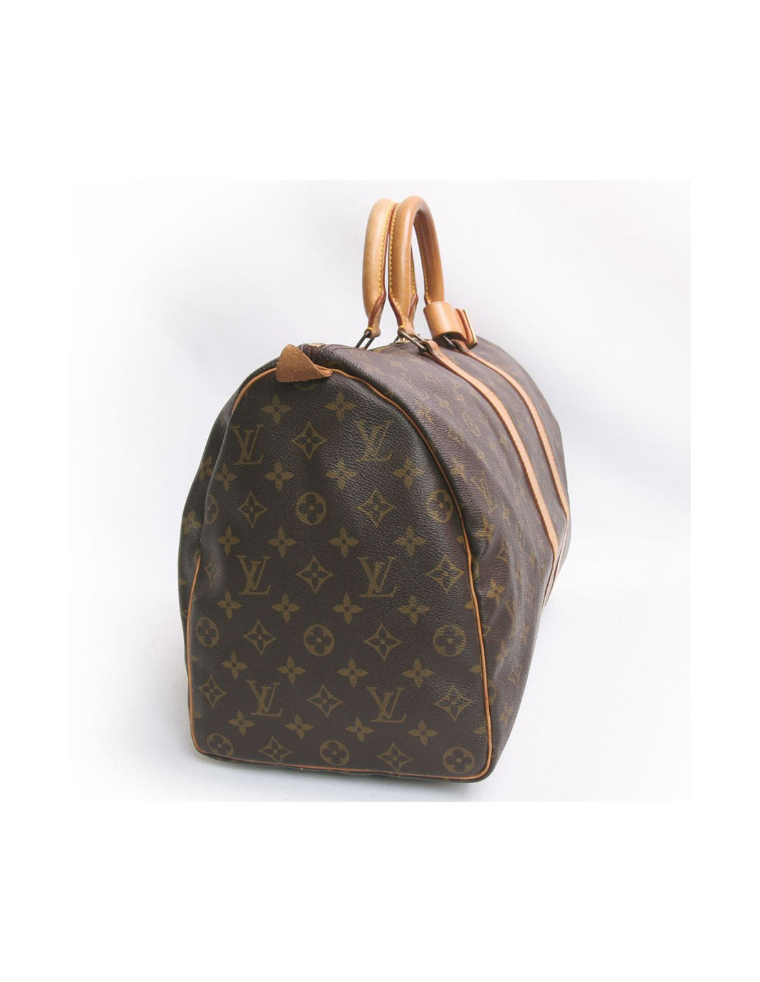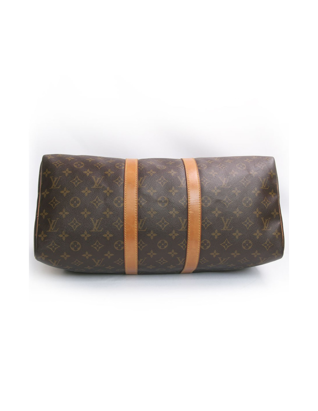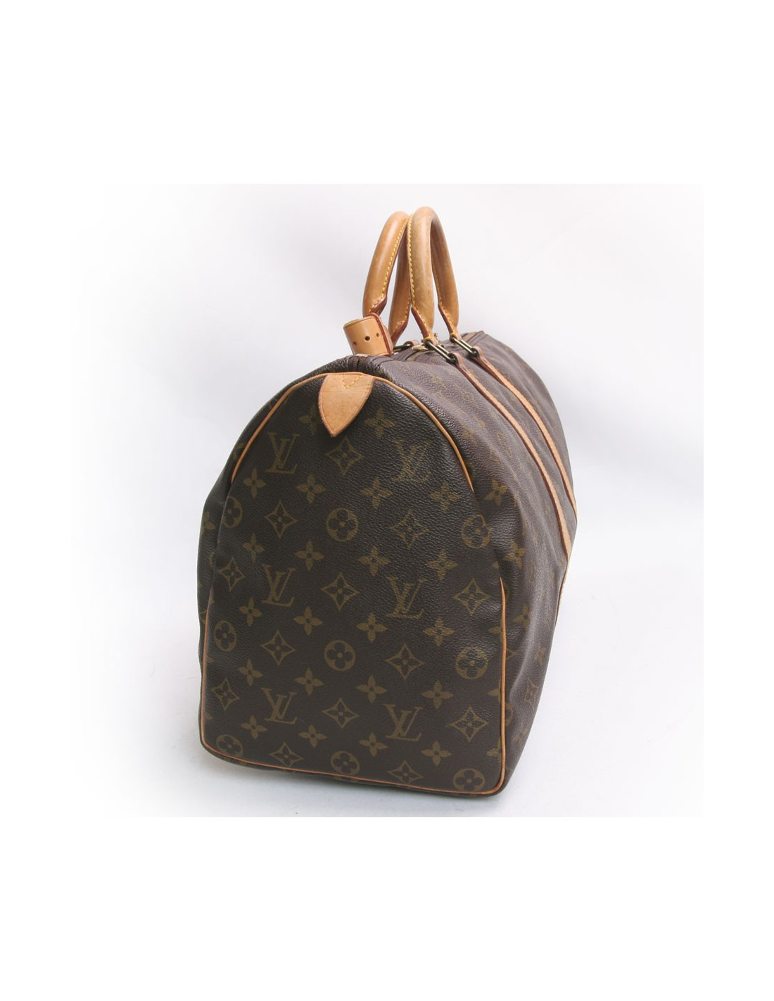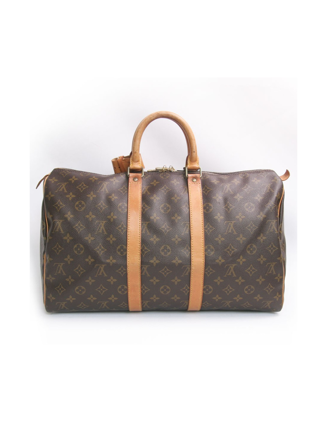 L'indémodable sac Keepall 45 de la Maison Louis Vuitton en toile monogram. L'accastillage est en laiton doré. Fermeture zippée. L'accessoire idéal pour vos départs en we. Il se porte à la main à l'aide d'une double poignée. L'intérieur est en toile marron. En très bon état. Légère usure du cuir sur les poignées.