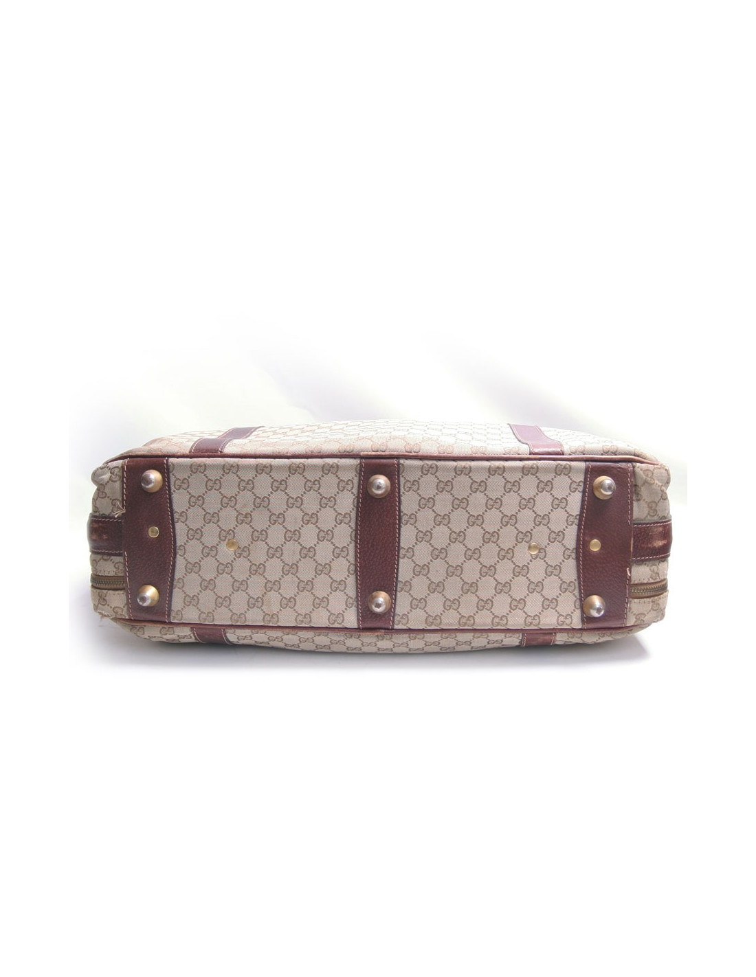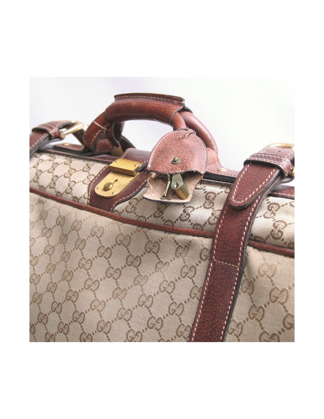 Belle valise Gucci souple en toile monogram enduite et cuir marron. Double fermeture éclair et serrure. Deux sangles et fermeture par boucles ardillon, poignée en cuir marron. Doublure intérieure en toile vert pâle, deux sangles en cuir marron. Fabriqué en Italie. Cadenas, clochette, clefs et porte adresse. L'accessoire de voyage idéal. Etat vintage. Les coins sous le sac ainsi qu'en haut sont abimés.