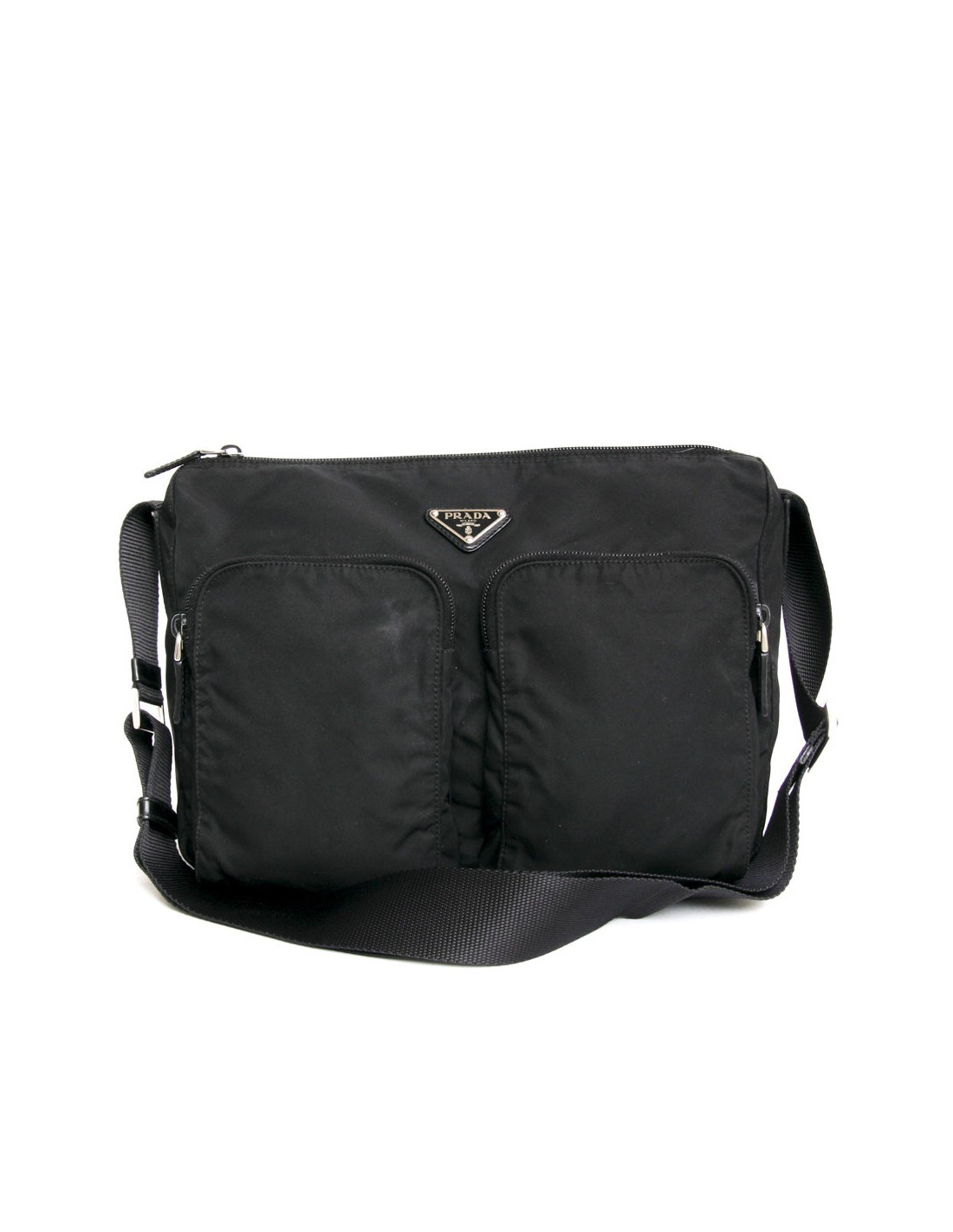 Sac ou sacoche Prada en toile et cuir noir. Elle se porte en crossover ou à l'épaule à l'aide d'une bandoulière. Fermeture zippée. L'intérieur est en toile monogram avec une poche zippée (quelques traces à l'intérieur). Elle dispose de deux poches à l'avant zippées.
