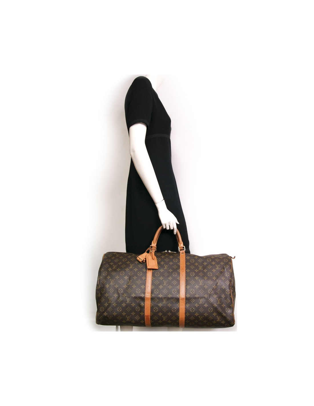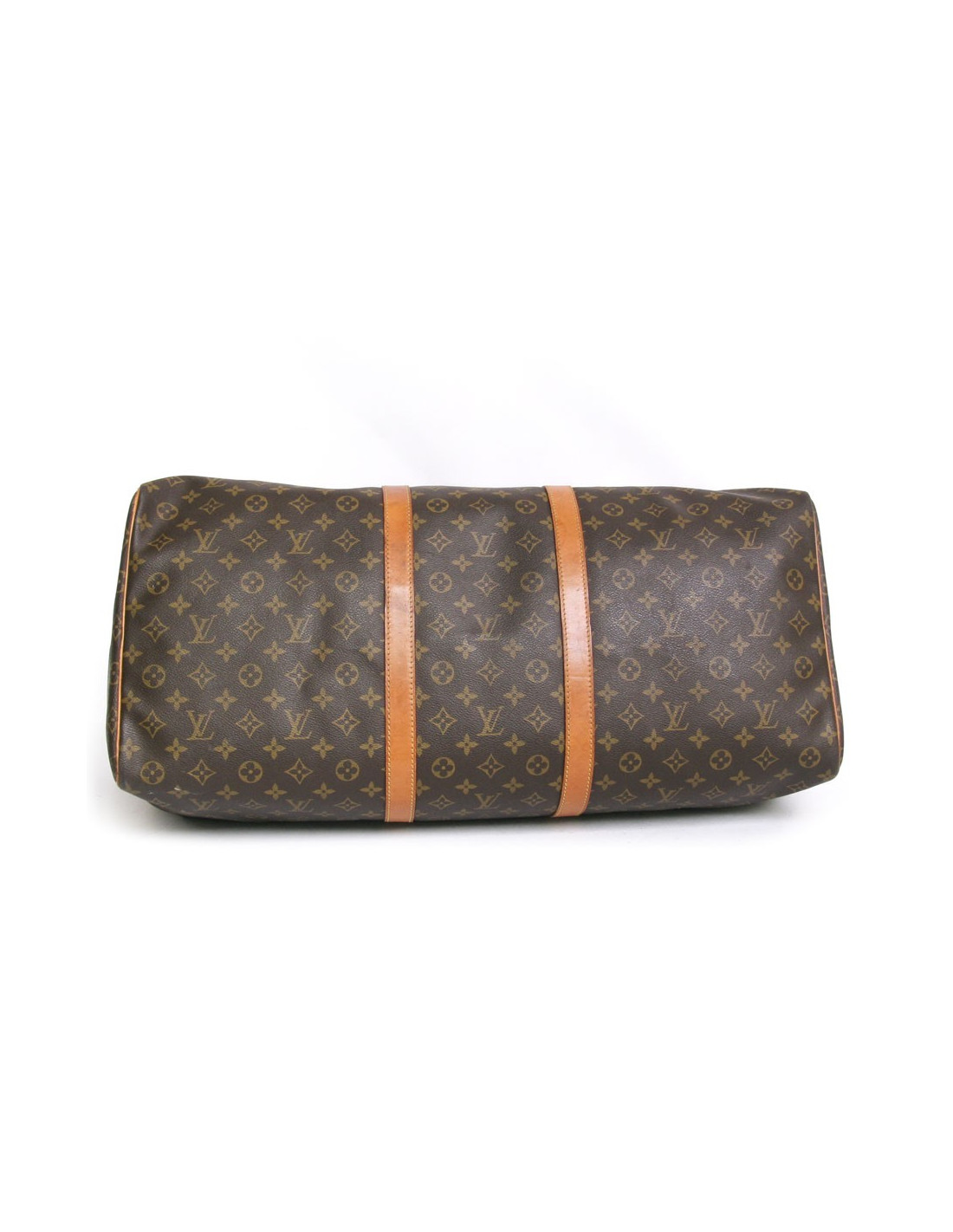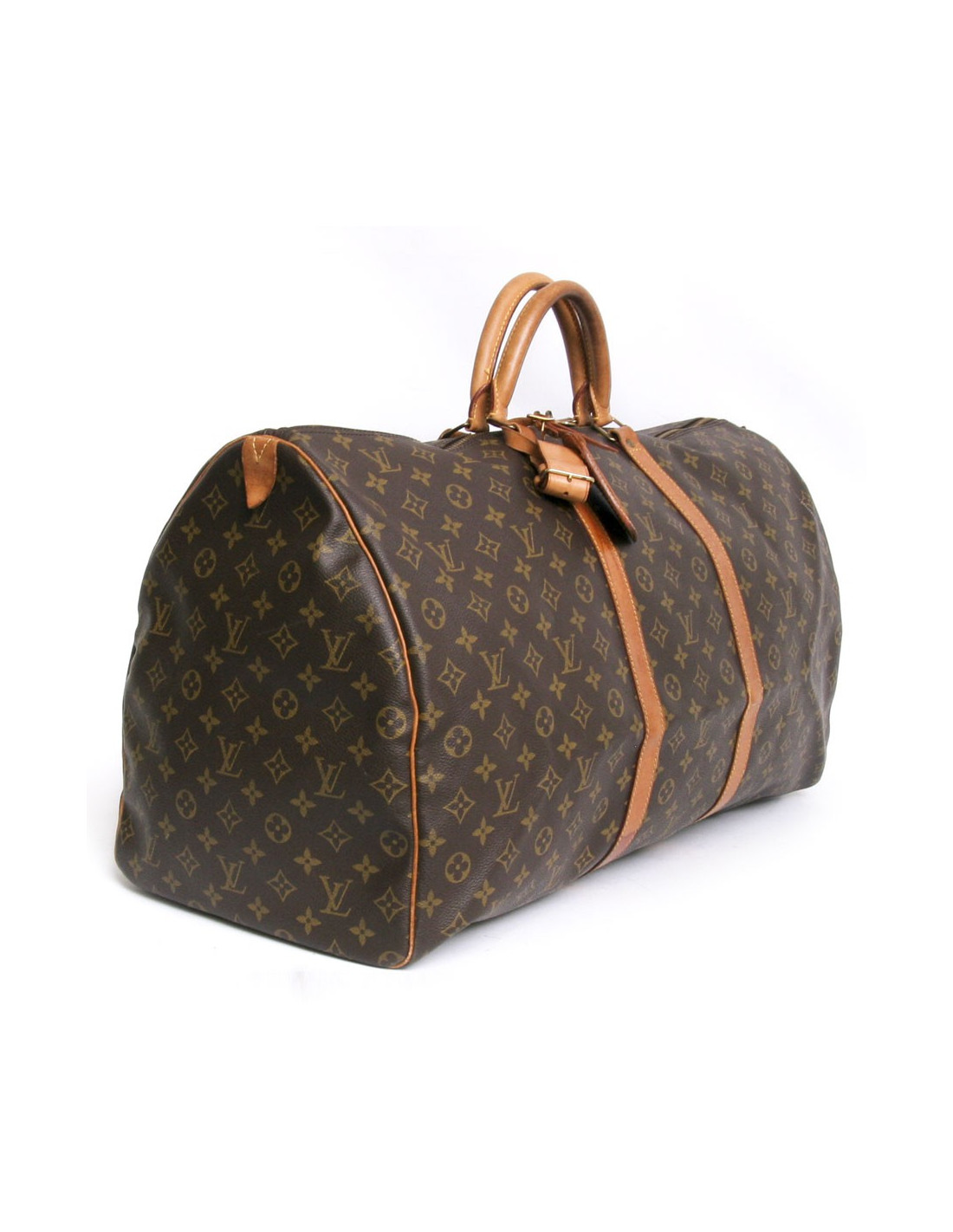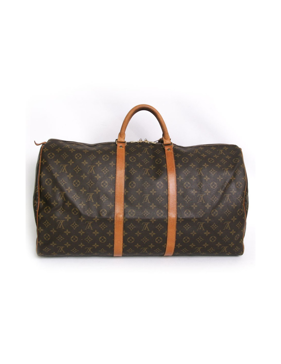 Sac "keepall 60" de la Maison Louis Vuitton en toile monogram. Une icône depuis sa création en 1930. Les adeptes de l'art de faire sa valise peuvent facilement glisser dans sa taille généreuse, des affaires nécessaires pour une semaine. Les pièces métalliques sont en laiton doré. Fermeture zippée. Porté main à l'aide de deux poignées. Porte nom. La doublure est en toile marron. Les parements sont en cuir de vache naturel. Patinage du cuir. Légère usure sur les coins sous le sac. Deux fines traces blanches sur le côté. Voir photos.