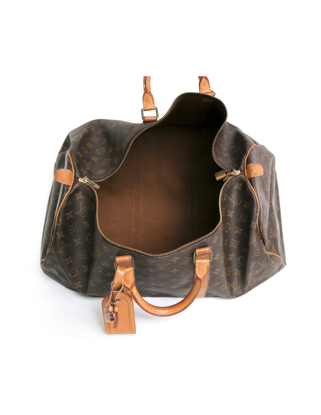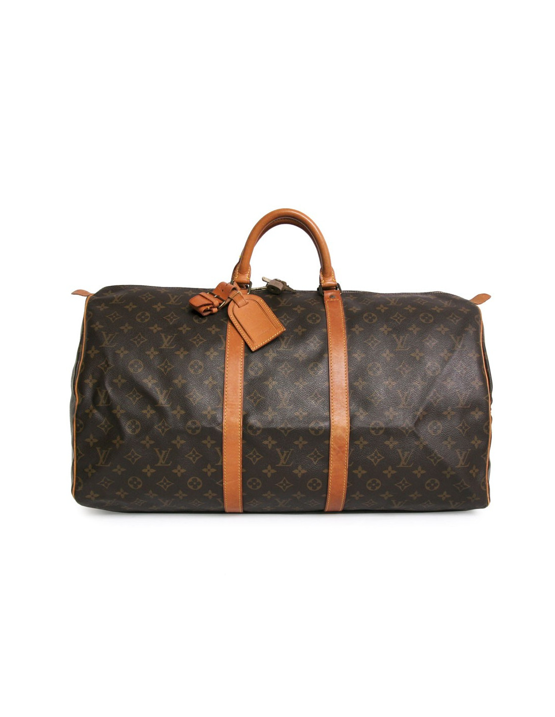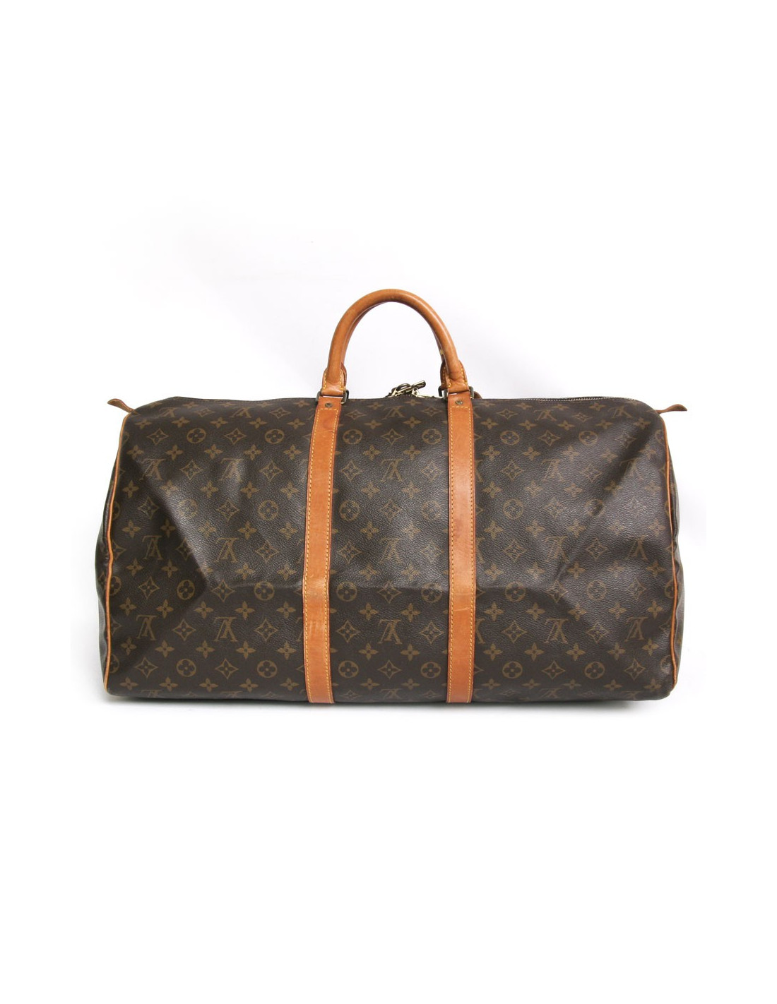 Sac "keepall 55" de la Maison Louis Vuitton en toile monogram. Une icône depuis sa création en 1930. Léger, souple et toujours prêt pour un départ imminent mais surtout pratique de par sa taille cabine. Les pièces métalliques sont en laiton doré. Fermeture zippée. Porté main à l'aide de deux poignées. Porte nom. La doublure est en toile marron. Les parements sont en cuir de vache naturel. En très bon état. Léger patinage du cuir et très légère usure des coins sous le sac.