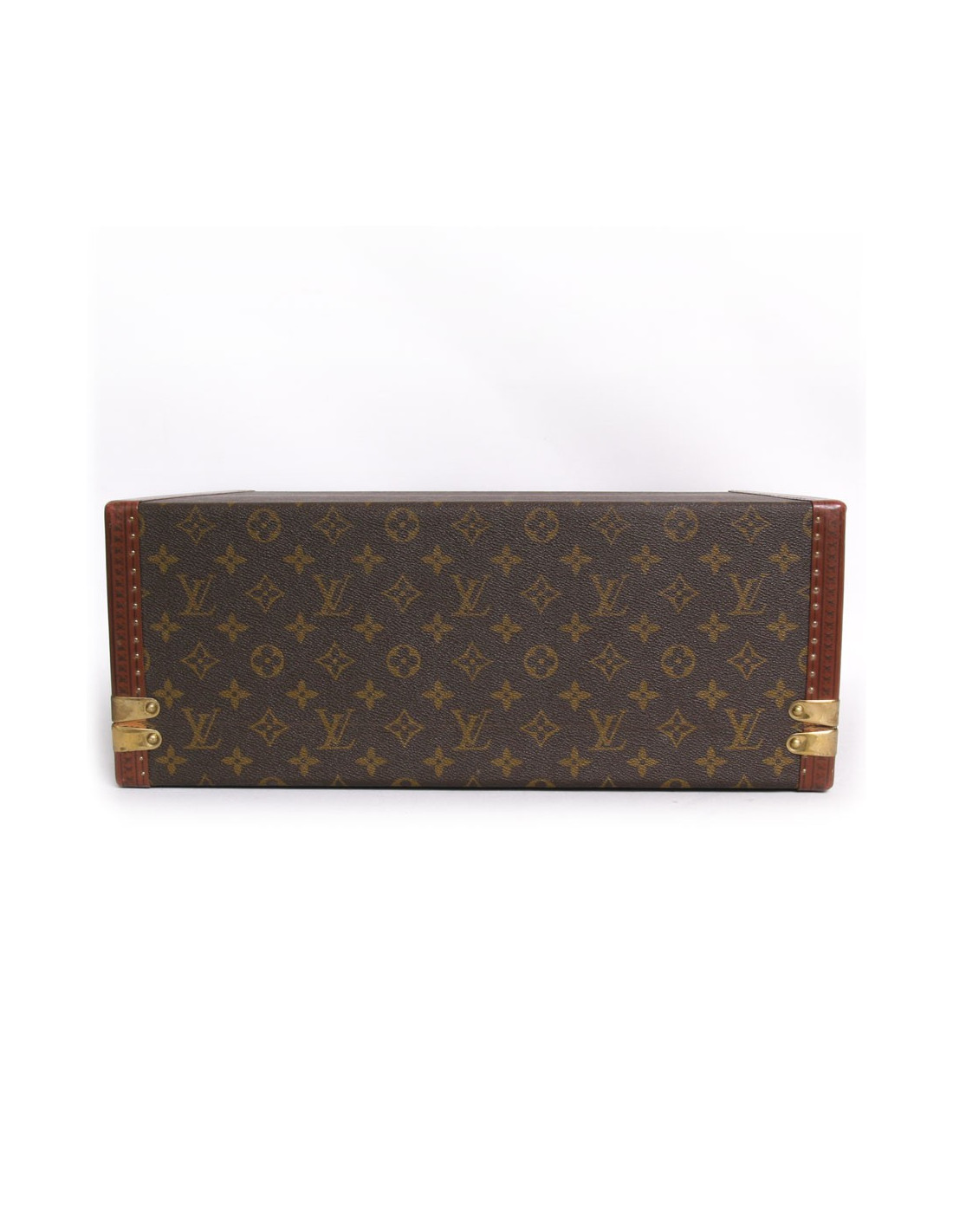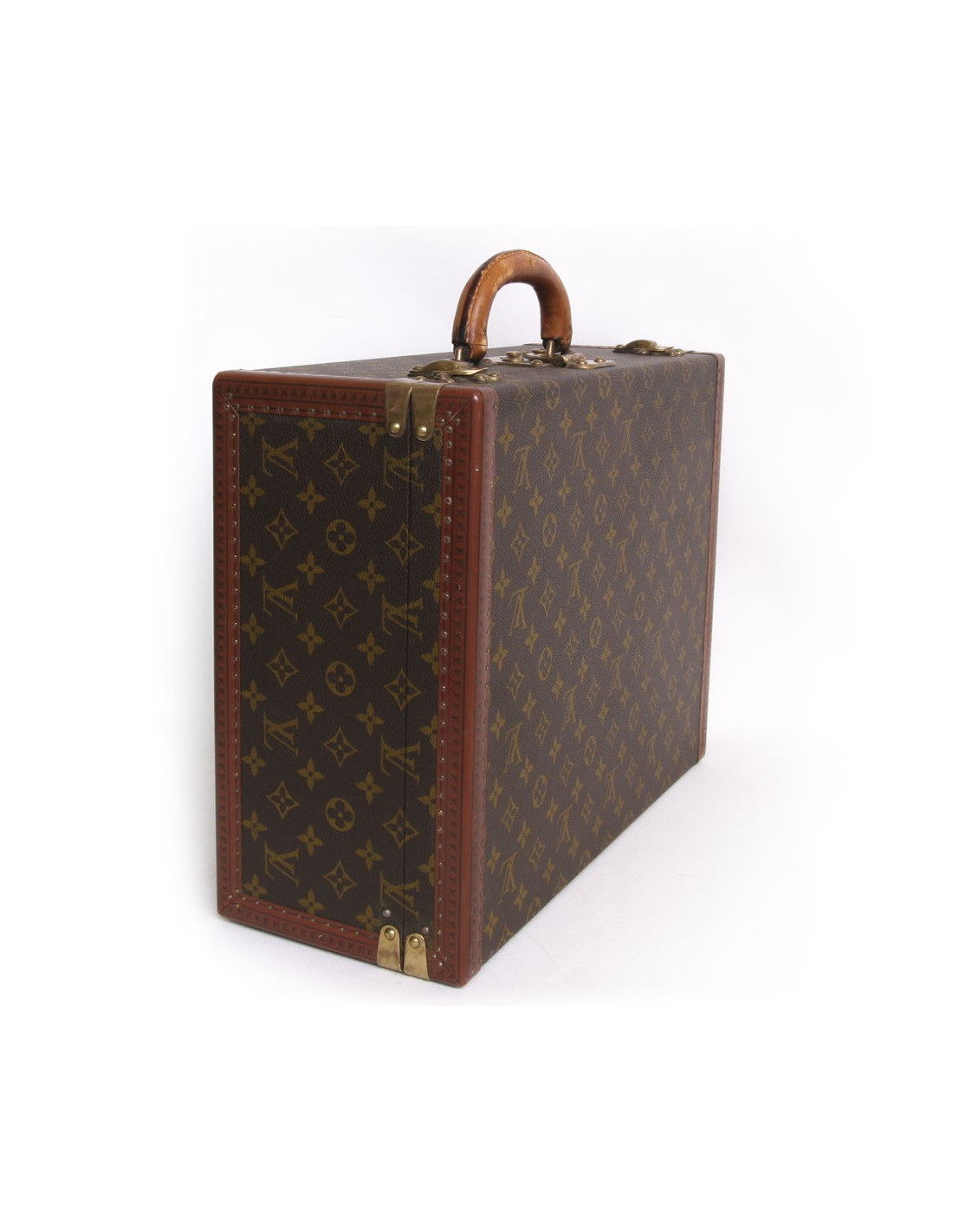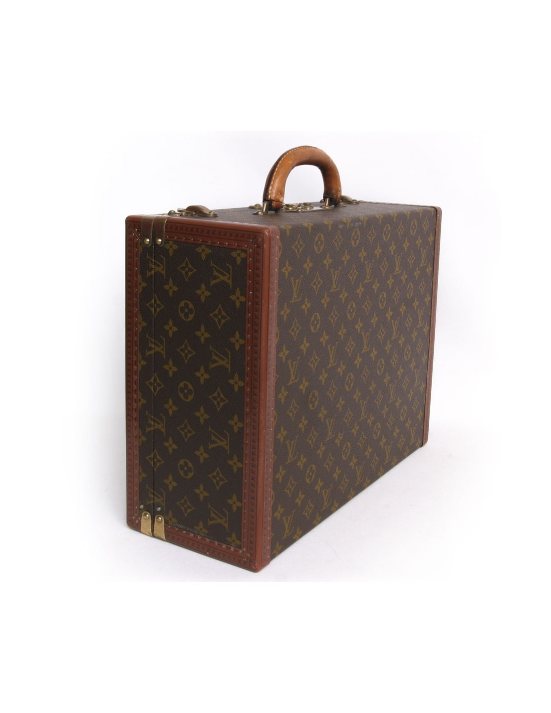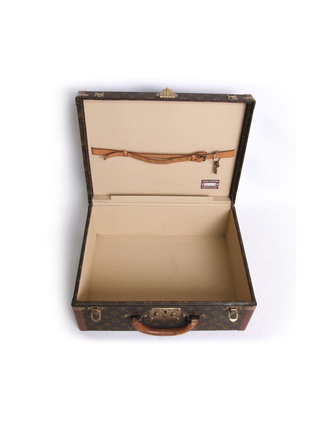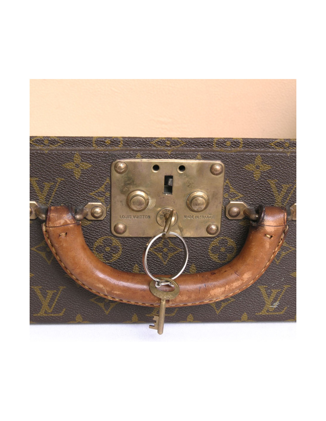 Valise rigide, "Bisten" Louis Vuitton toile monogram vintage. Les poignées sont en cuir naturel. L'intérieur est en toile ainsi que les sangles de maintien. Serrure "S" Louis Vuitton renforcée de 2 loquets complémentaires. (2 clefs) Les bordures sont en cuir, renforcées de rivets et de coins en laiton. Les pièces métalliques sont en laiton doré. Hologramme: 8772.... En très bon état. La poignée montre des marques d'usure ainsi qu'une trace blanche