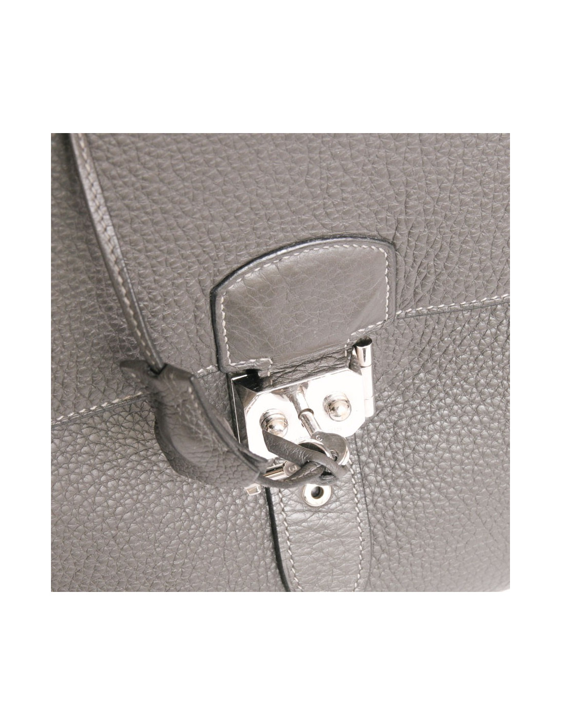 Sac à dépêches en cuir taurillon clémence gris éléphant Hermès. lettre k dan un carré. Il a 3 compartiments et 2 soufflets, dont un doublé dans le même cuir. Le fermoir est en métal palladié, avec tirette, clochette et clefs. Signé HERMES PARIS - made in France. Il est en très bon état.