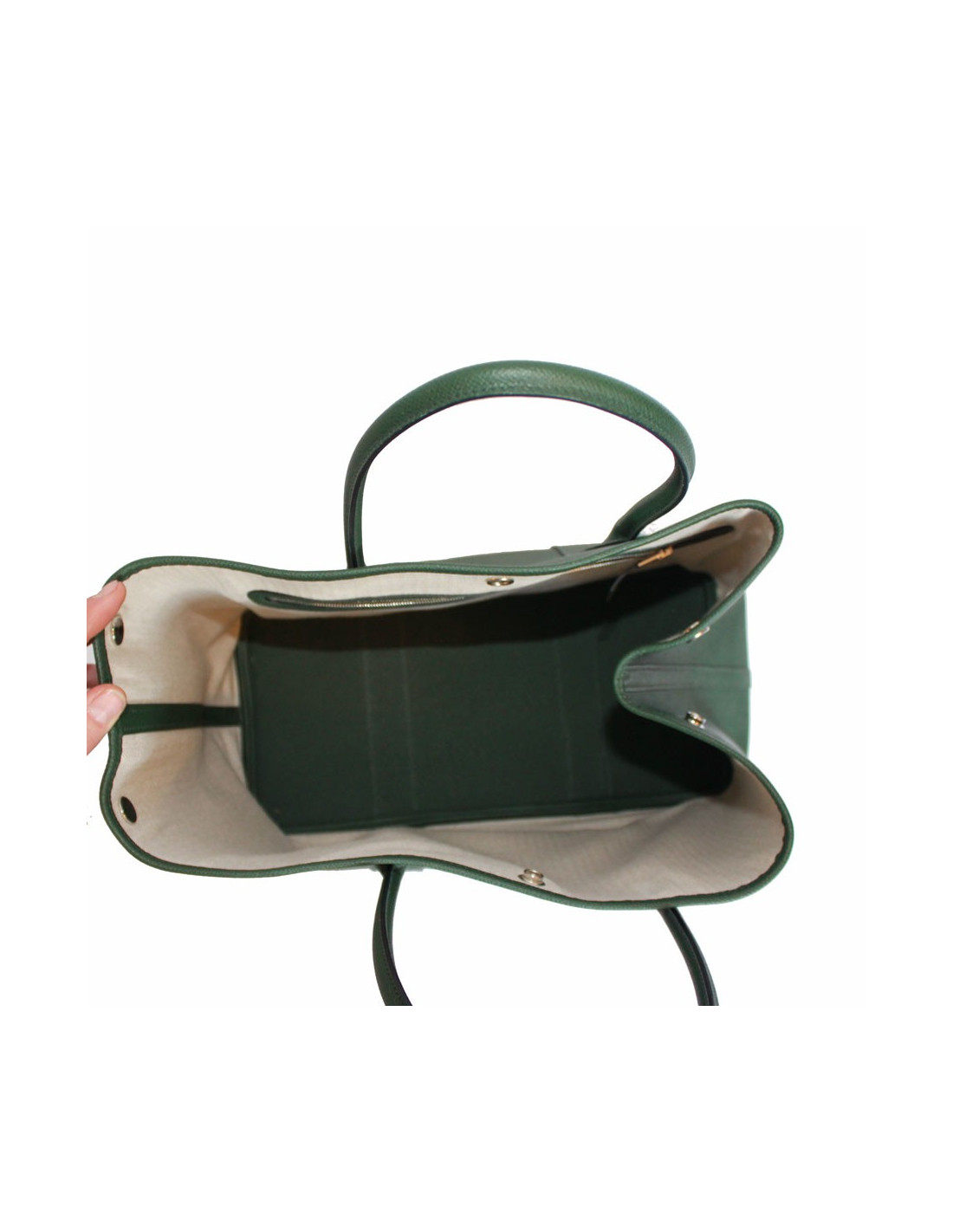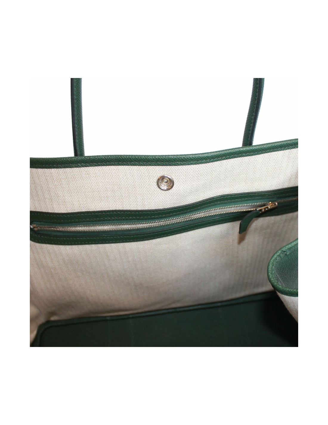 Sac garden party en cuir epsom vert. L'intérieur est en tissu chevron naturel.