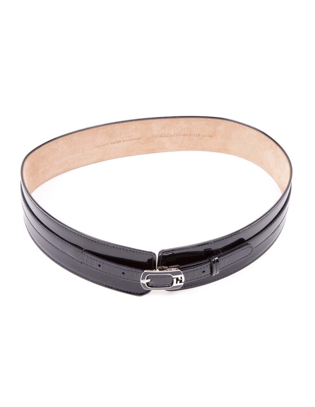 Ceinture FENDI en cuir verni noir. Garniture argentée. Intérieur en cuir beige, fermoir à boucle.
