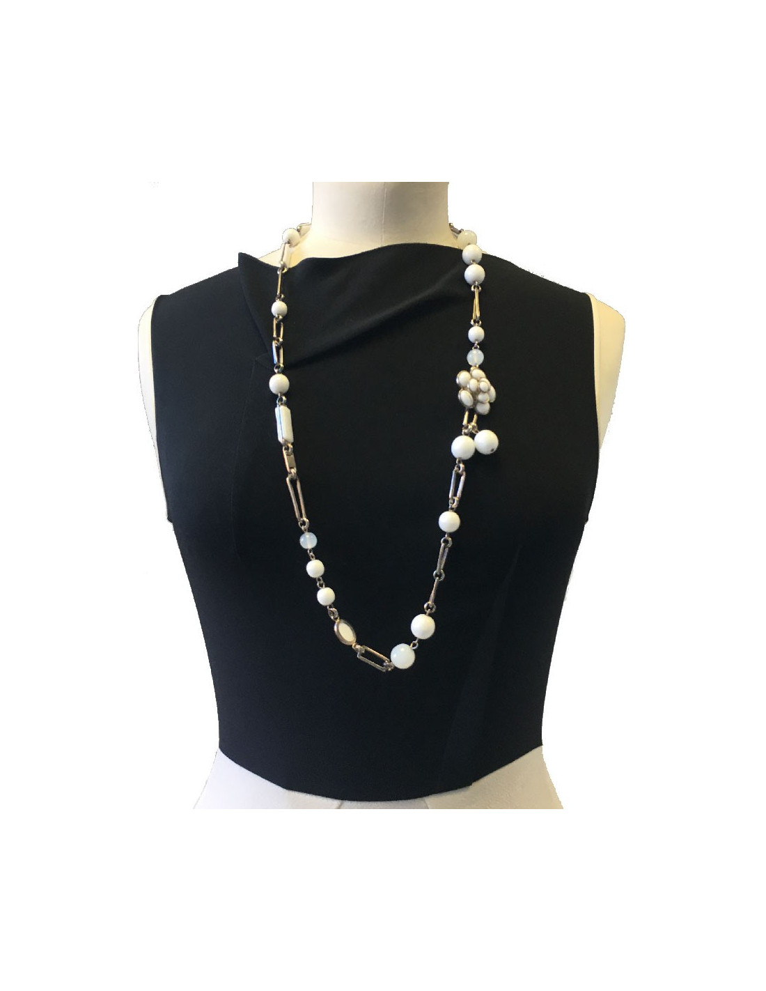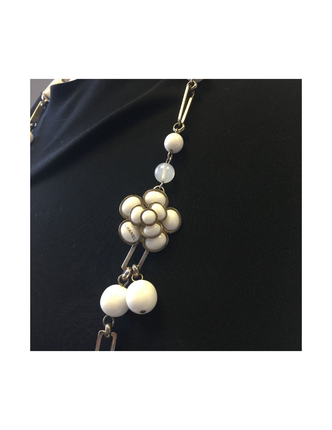 Ceinture sautoir CHANEL en pâte de verre blanche et transparente, et métal argenté