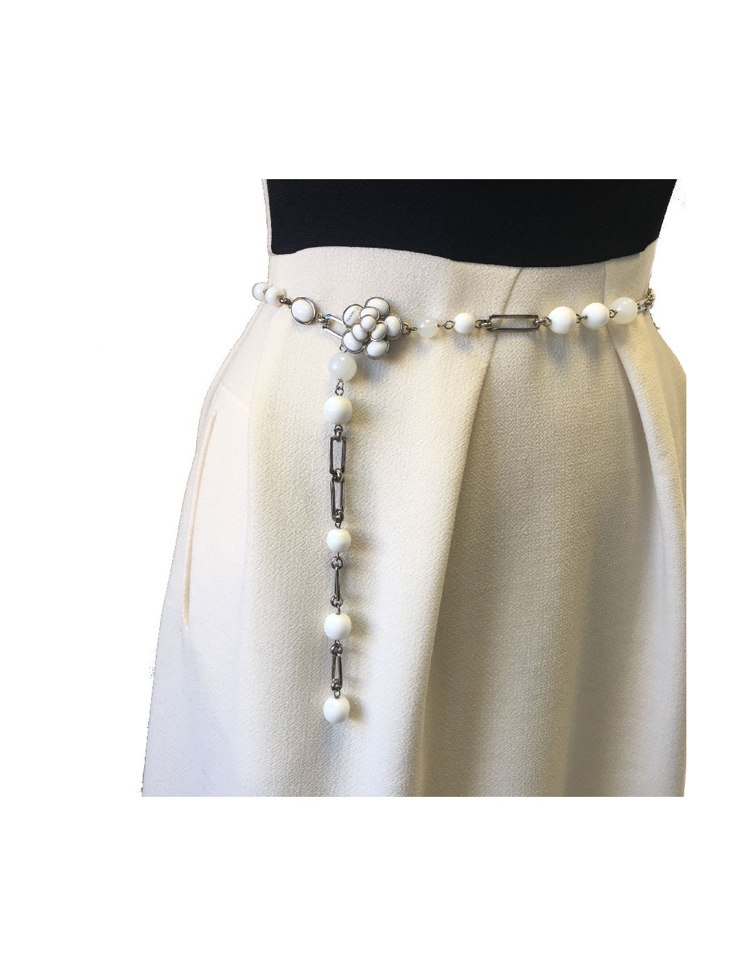 Très belle ceinture-sautoir Chanel en pâte de verre blanc et transparent.