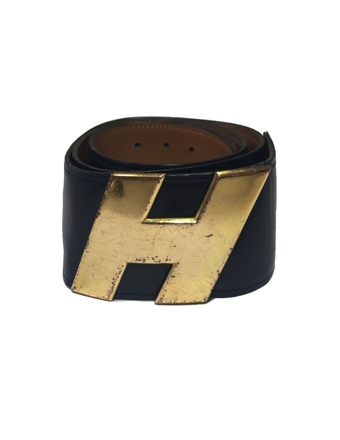 Ceinture Hermès vintage en cuir marine, intérieur en cuir gold. Bijouterie H dorée. Fermoir crochet.