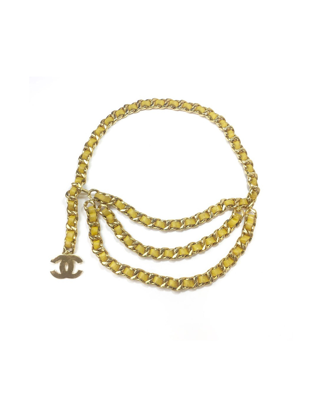 Ceinture 3 rangs Chanel en cuir jaune et métal doré entrelacé. Superbe objet vintage qui rehaussera toutes vos tenues. Cuir et métal un peu usé, les photos reflètent parfaitement l’état, plutôt bon de cette très belle ceinture.
