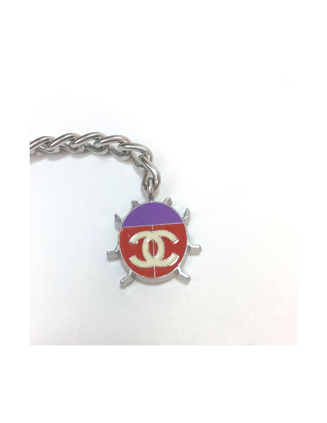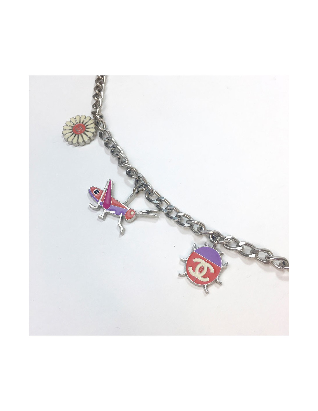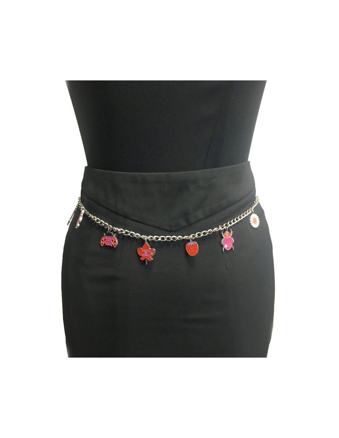 Très belle ceinture Chanel, chaîne en métal argenté agrémentée de charms émaillés.