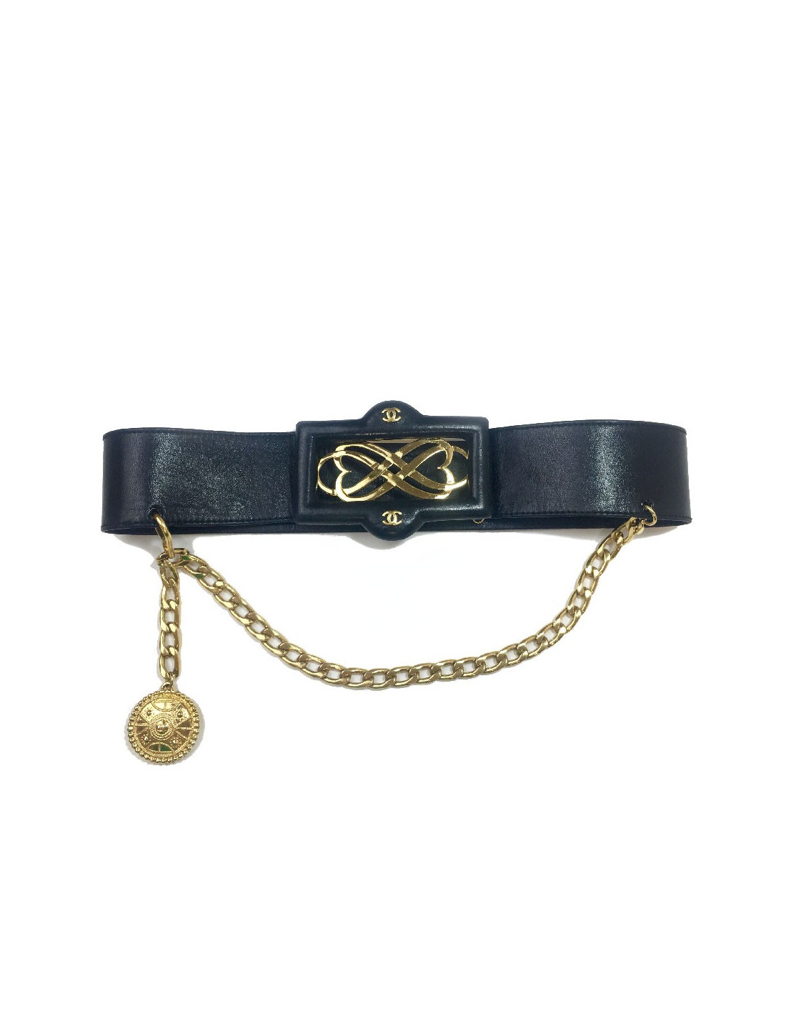 Ceinture collector Chanel vintage en cuir noir. Très bel état général, le cuir extérieur est impeccable, le métal doré aussi. La chaine dorée est fixée sur un anneau dans le cuir de la ceinture, de l’autre côté il y a un autre anneau qui permet de ramener la chaine dorée sur le devant.