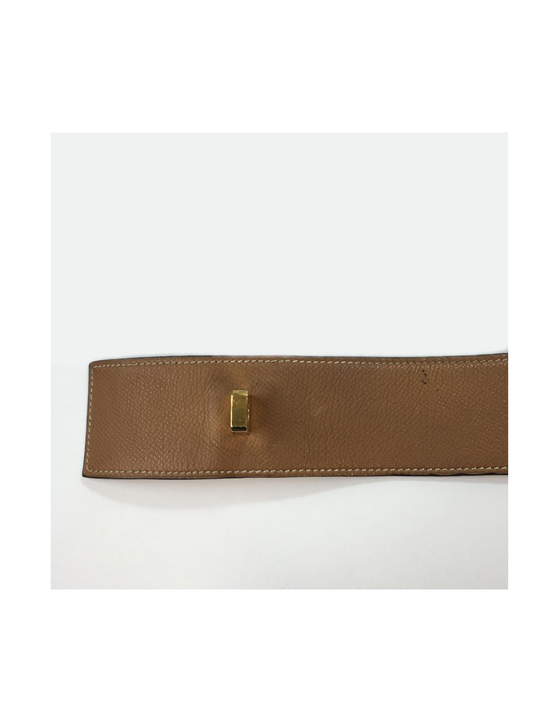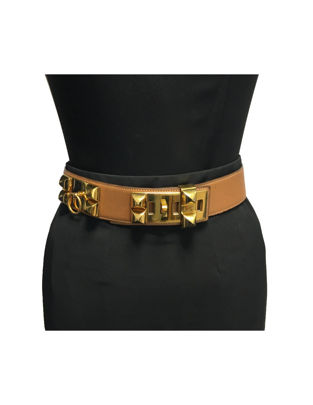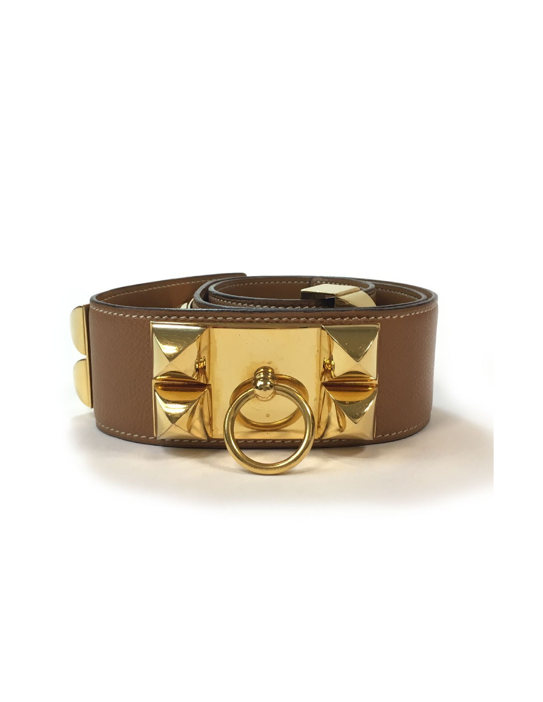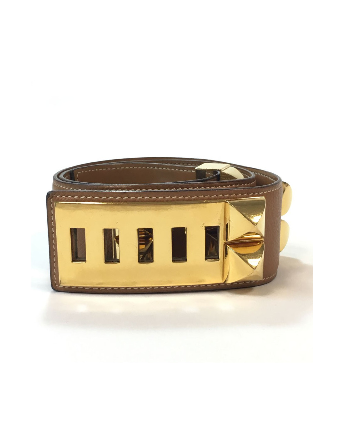 Ceinture Hermès collier de chien, ou médor, en métal doré à l’or fin et cuir epsom gold (beige foncé). Des micros rayures sur les parties métalliques, le cuir est impeccable excepté une petite trace noire proche du fermoir.