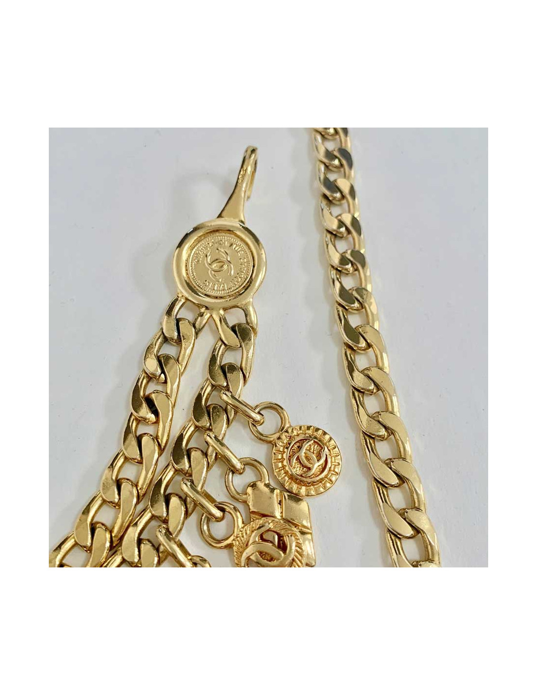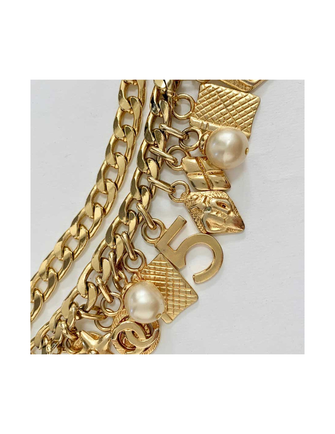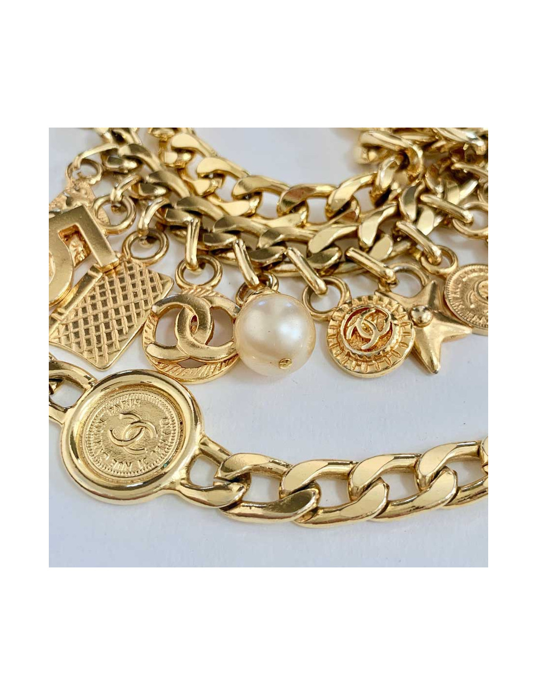 Cette ceinture-sautoir est en chaîne dorée. Elle est agrémentée d'une deuxième chaine en maille dorée sur laquelle vous retrouverez les charms emblématiques de la Maison : perles, Numéro 5, Effigie de Madame COCO CHANEL, CC, Pochette matelassée...